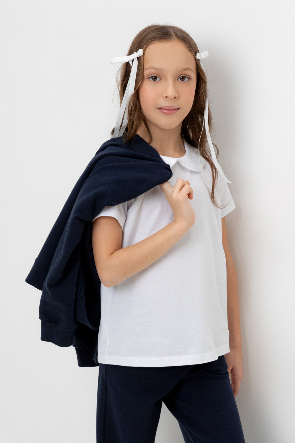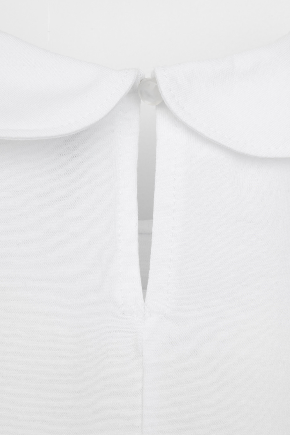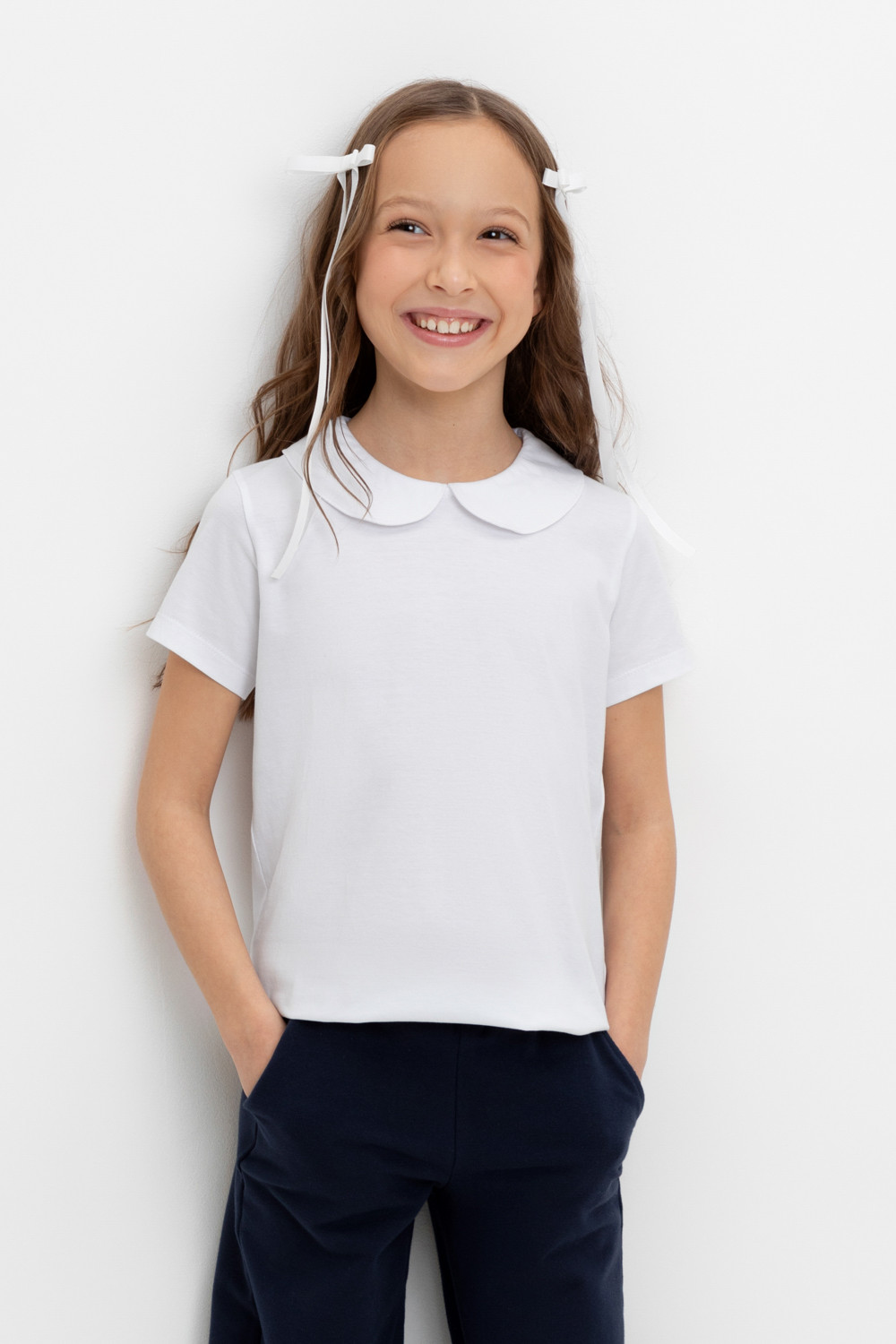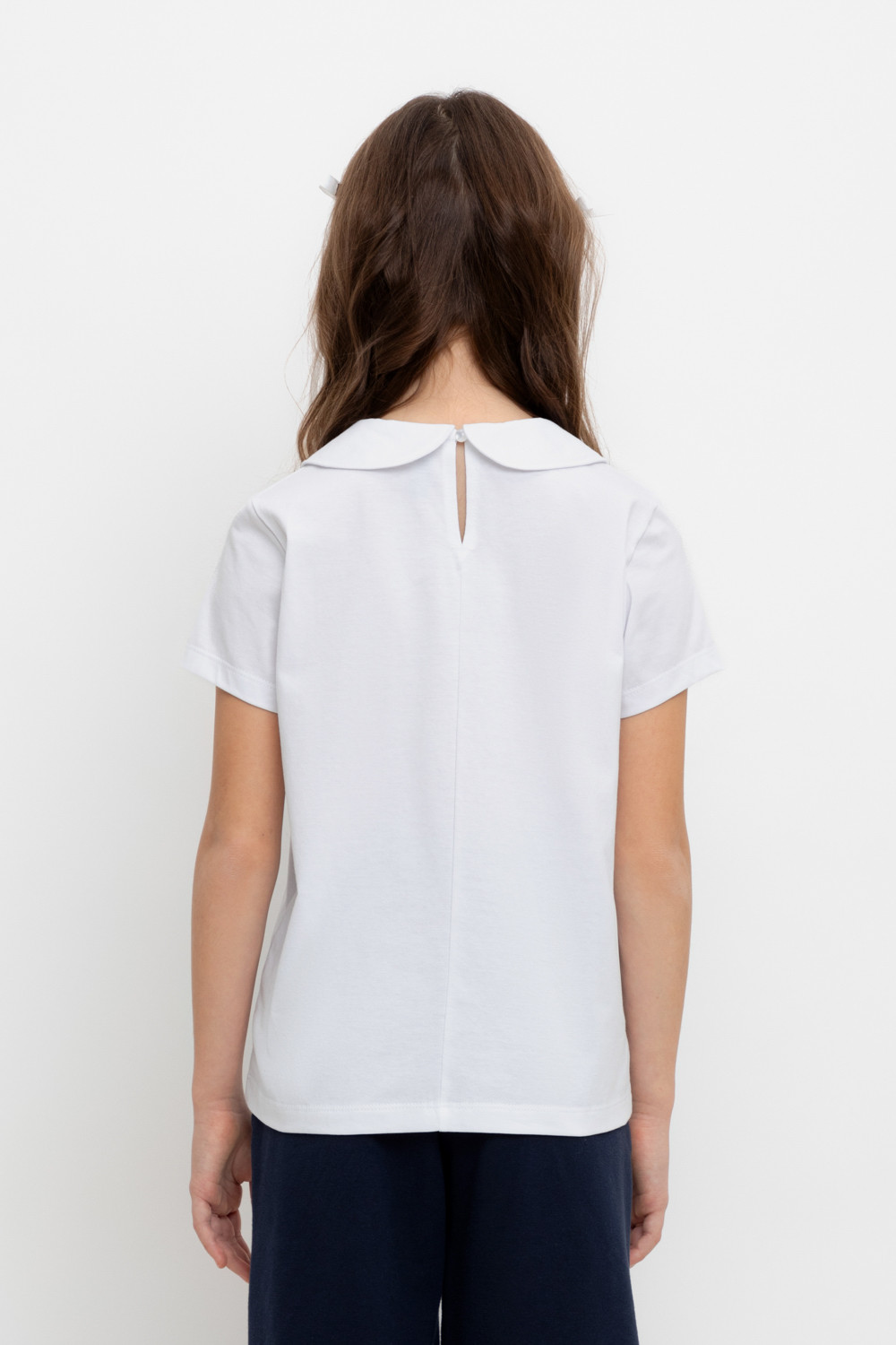Блузка школьная для девочки с воротником из трикотажа супрем. Застёгивается на пуговицу и петельку из шляпной резины. Рукава и низ изделия обработаны плоскими швами.