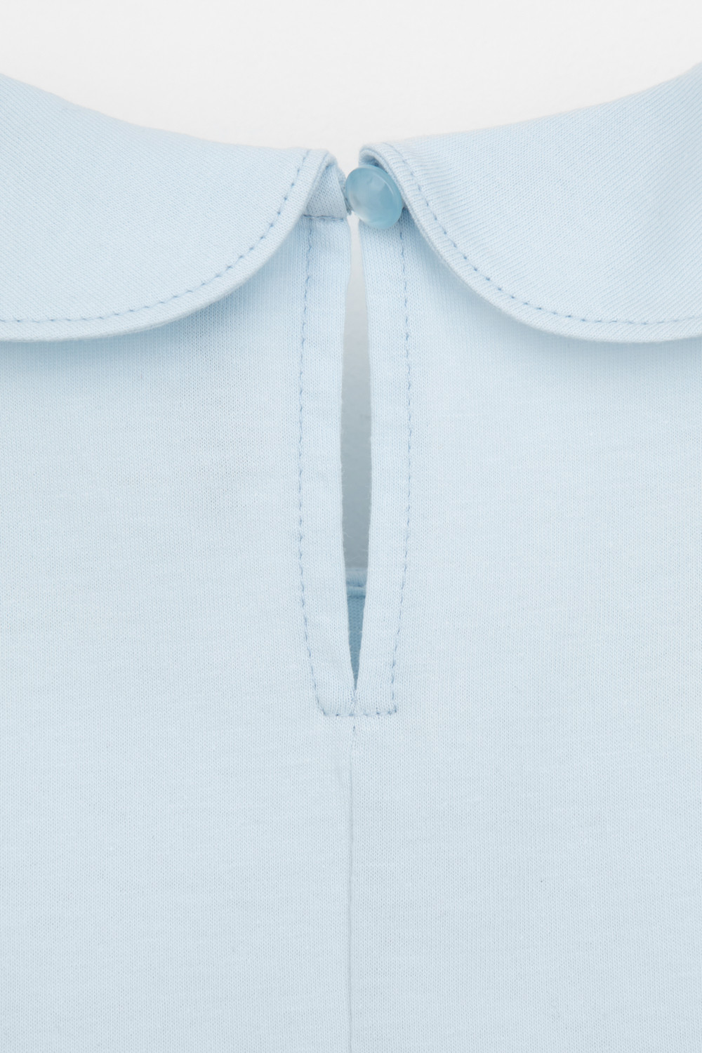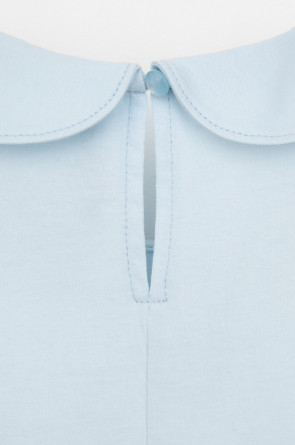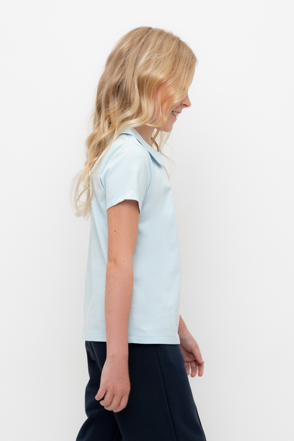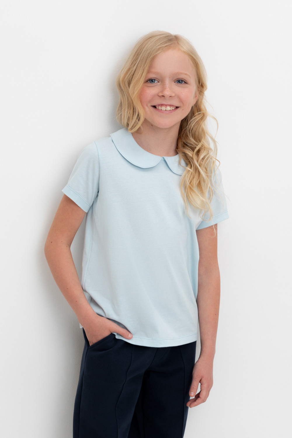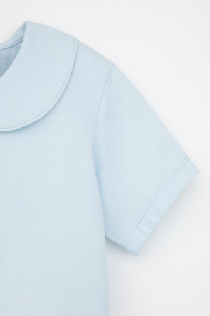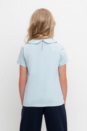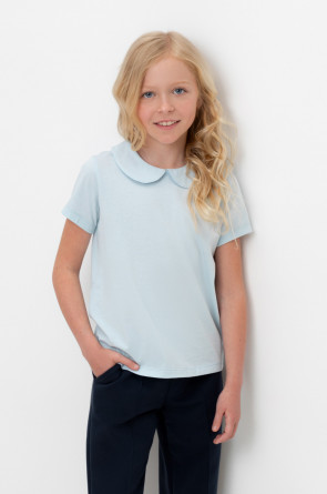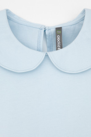 Блузка школьная для девочки с воротником из трикотажа супрем. Застёгивается на пуговицу и петельку из шляпной резины. Рукава и низ изделия обработаны плоскими швами.