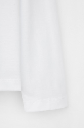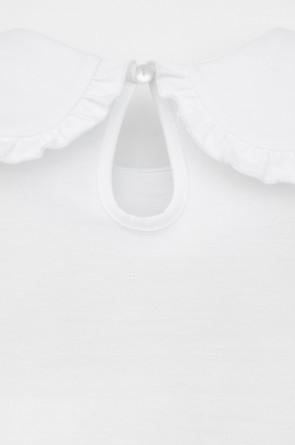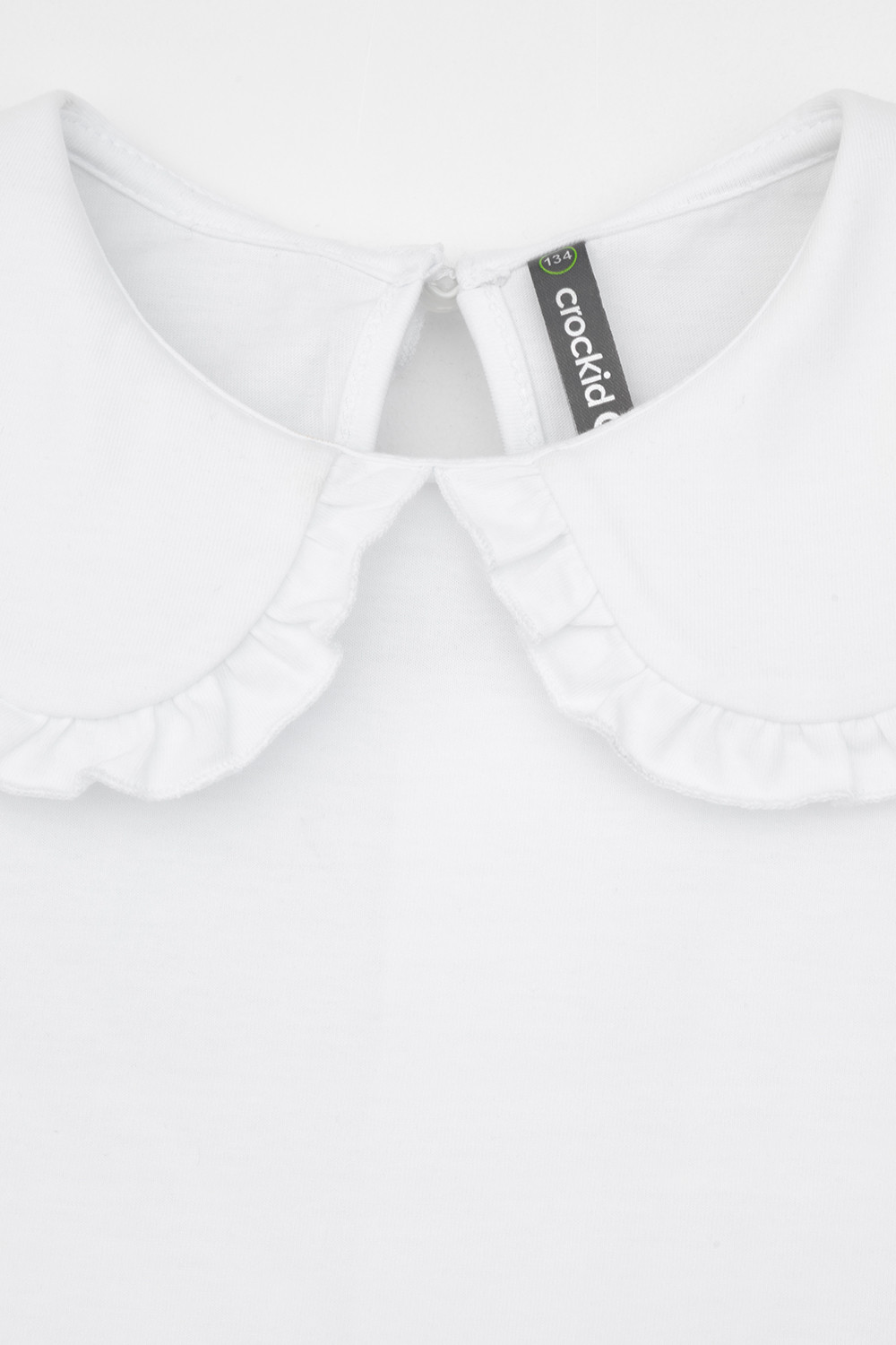 Блузка школьная для девочки с отложным воротником из трикотажа супрем. Застёгивается на пуговицу и петельку из шляпной резины. Воротник украшен оборкой. Рукава и низ изделия обработаны плоскими швами.