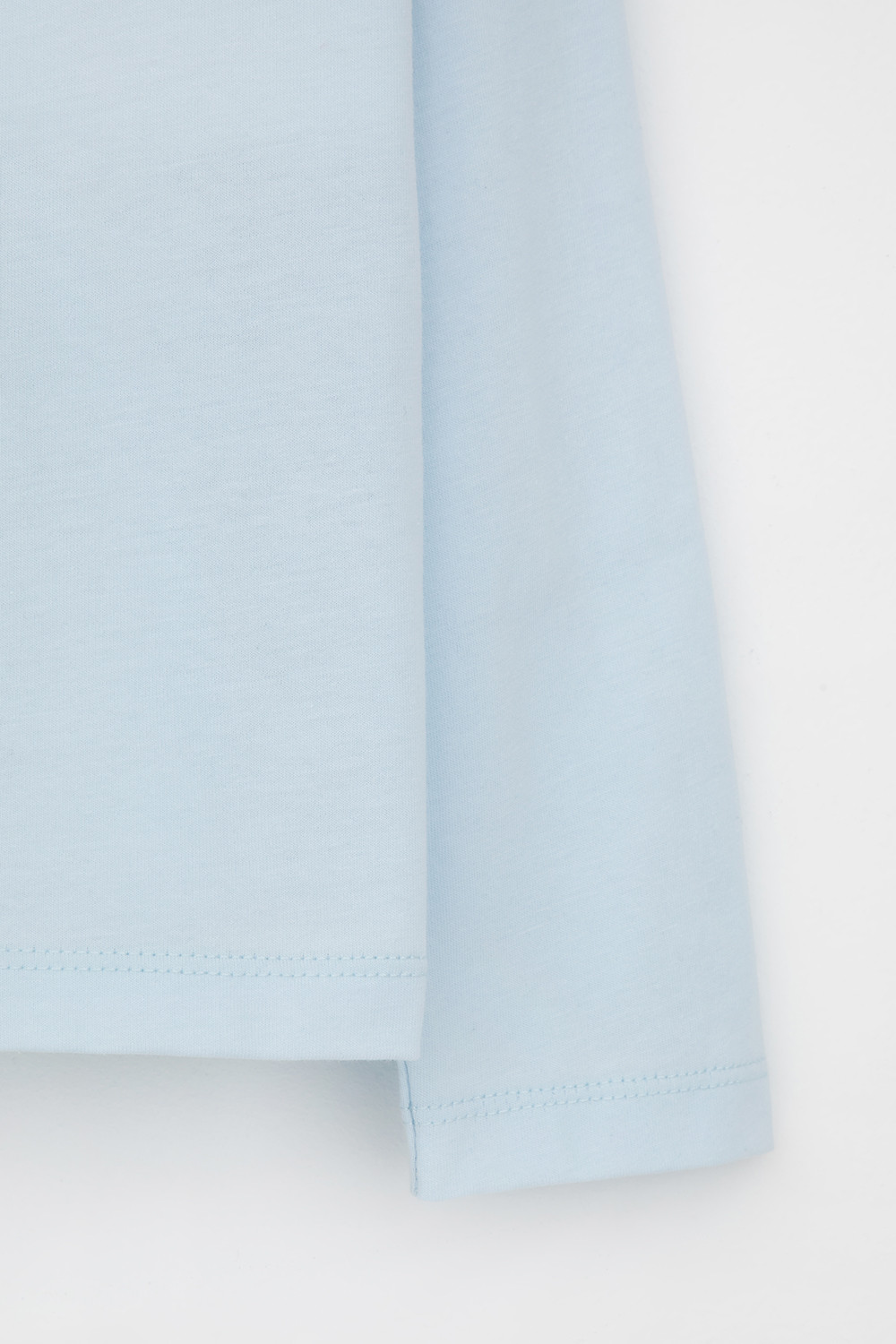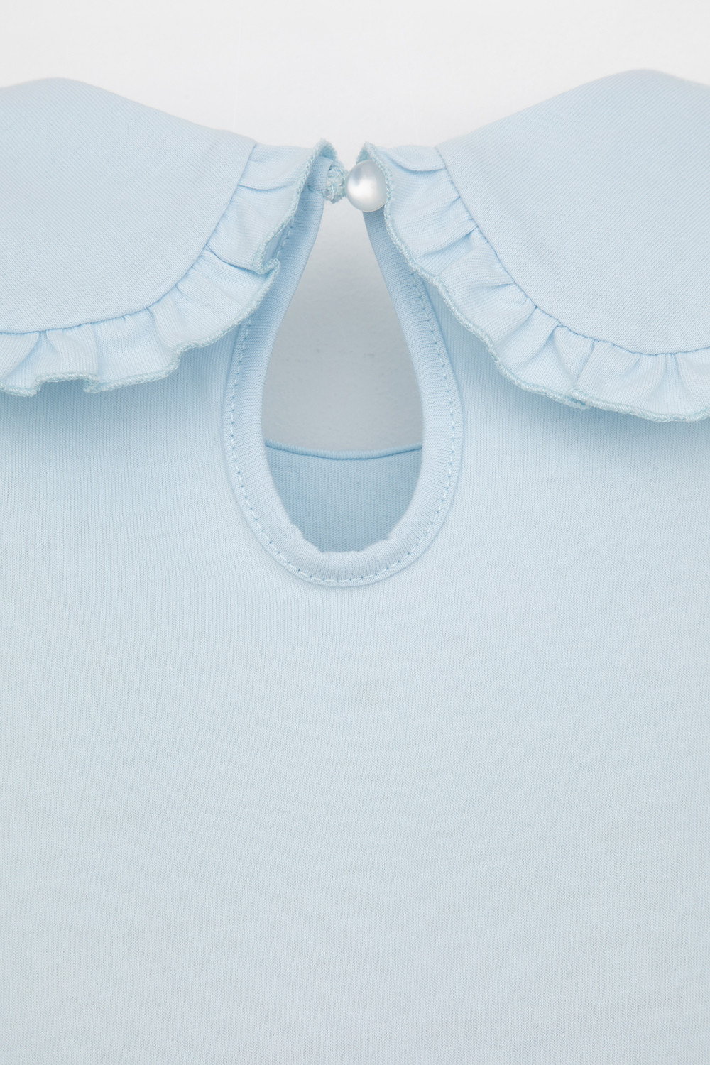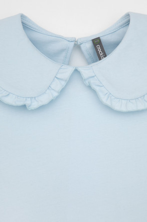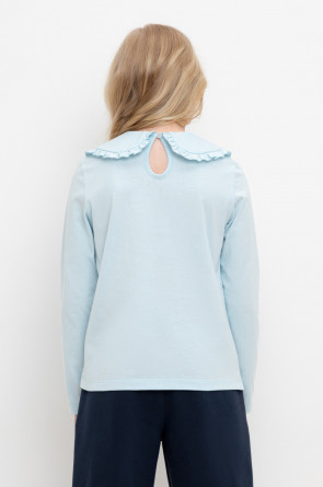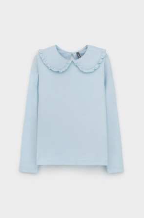 Блузка школьная для девочки с отложным воротником из трикотажа супрем. Застёгивается на пуговицу и петельку из шляпной резины. Воротник украшен оборкой. Рукава и низ изделия обработаны плоскими швами.