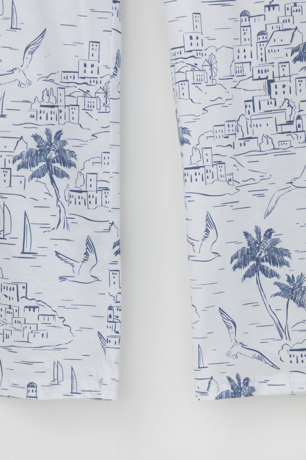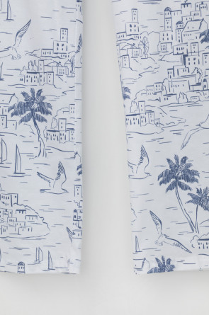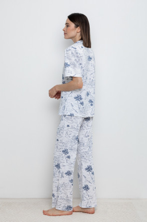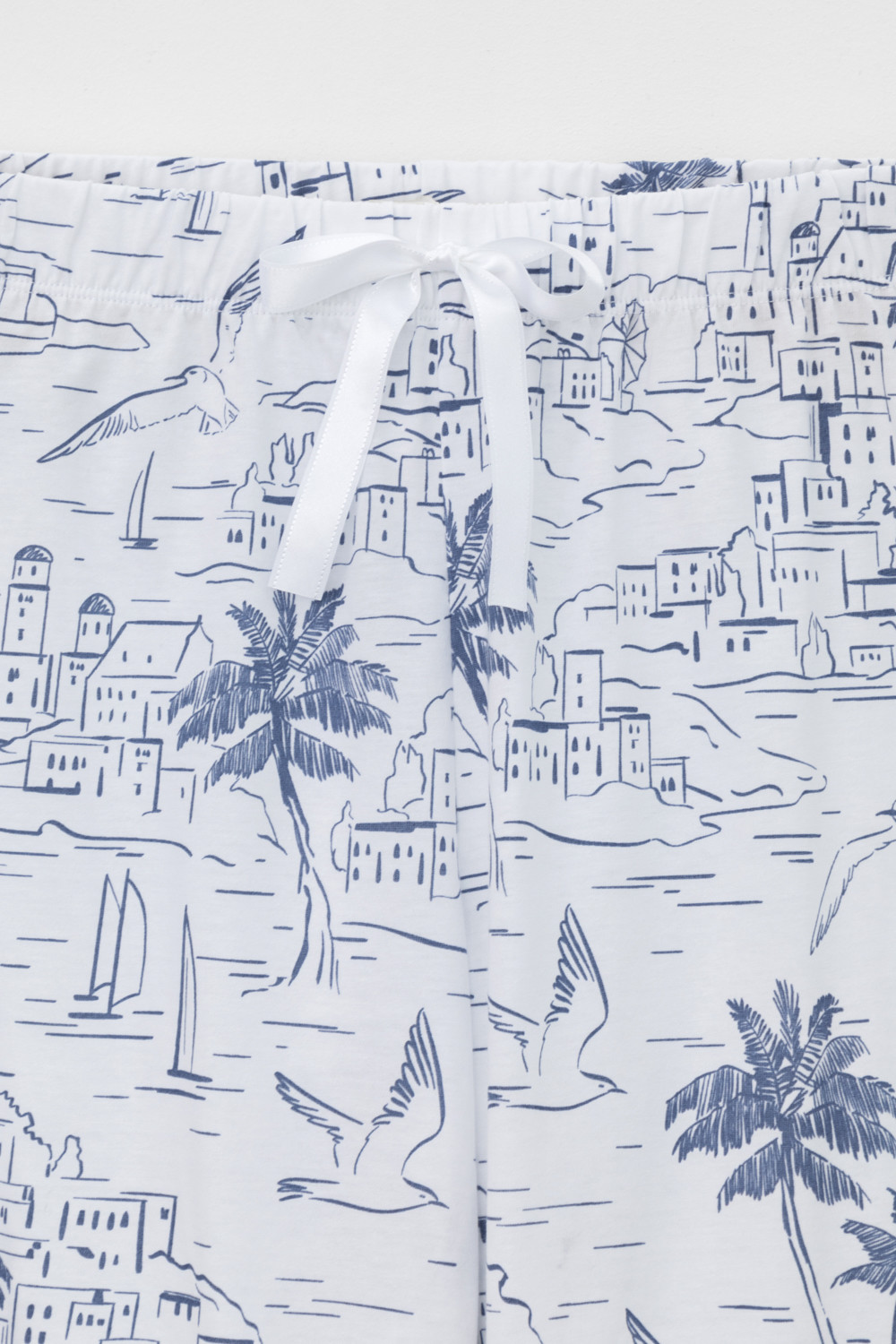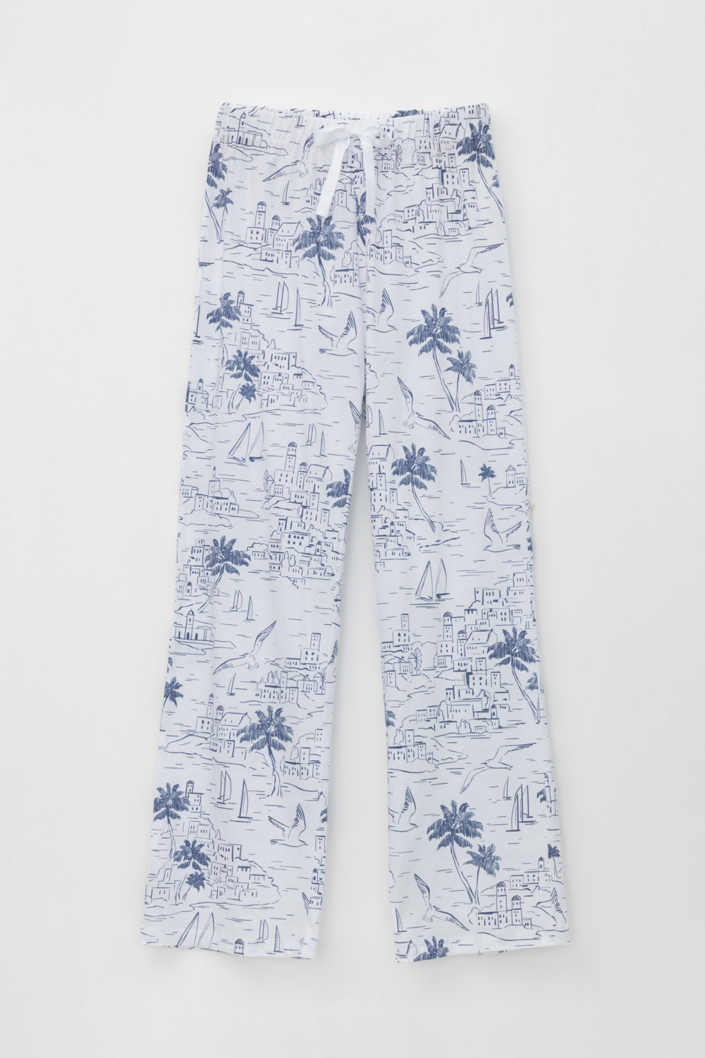 Лёгкие комфортные брюки из набивного трикотажа. Пояс на резинке регулируется по ширине с помощью атласной ленты. Низ изделия обработан плоскими швами. Гладкий материал приятен к телу, не теряет форму и позволяет коже дышать.