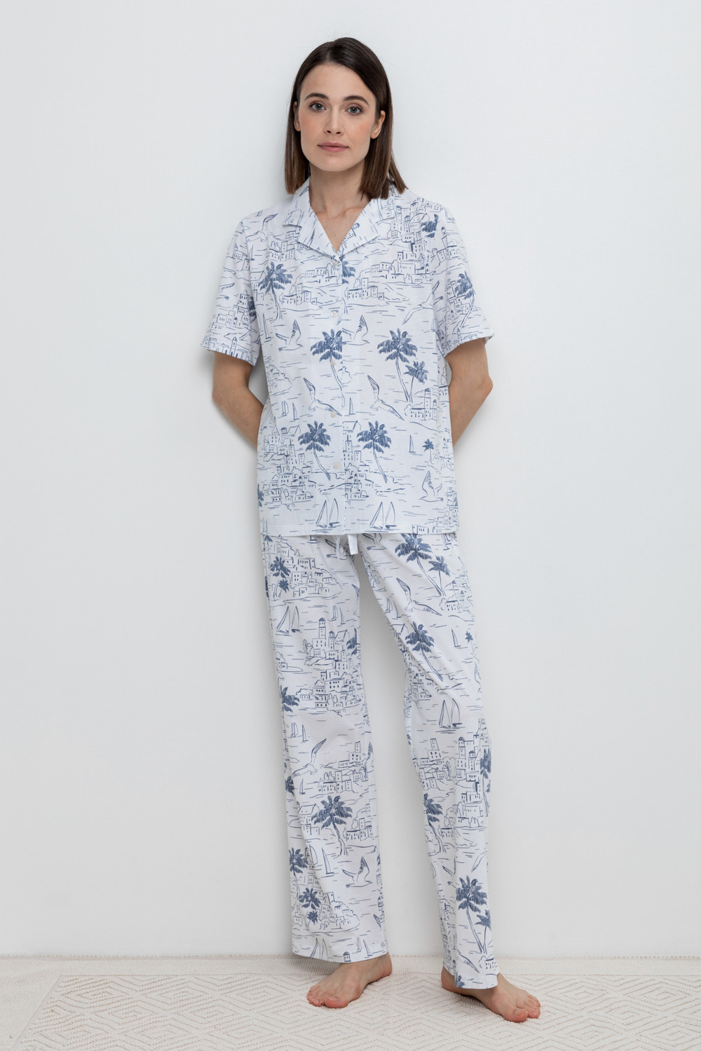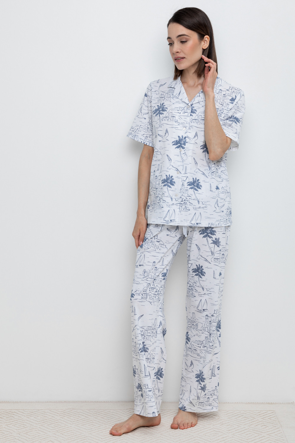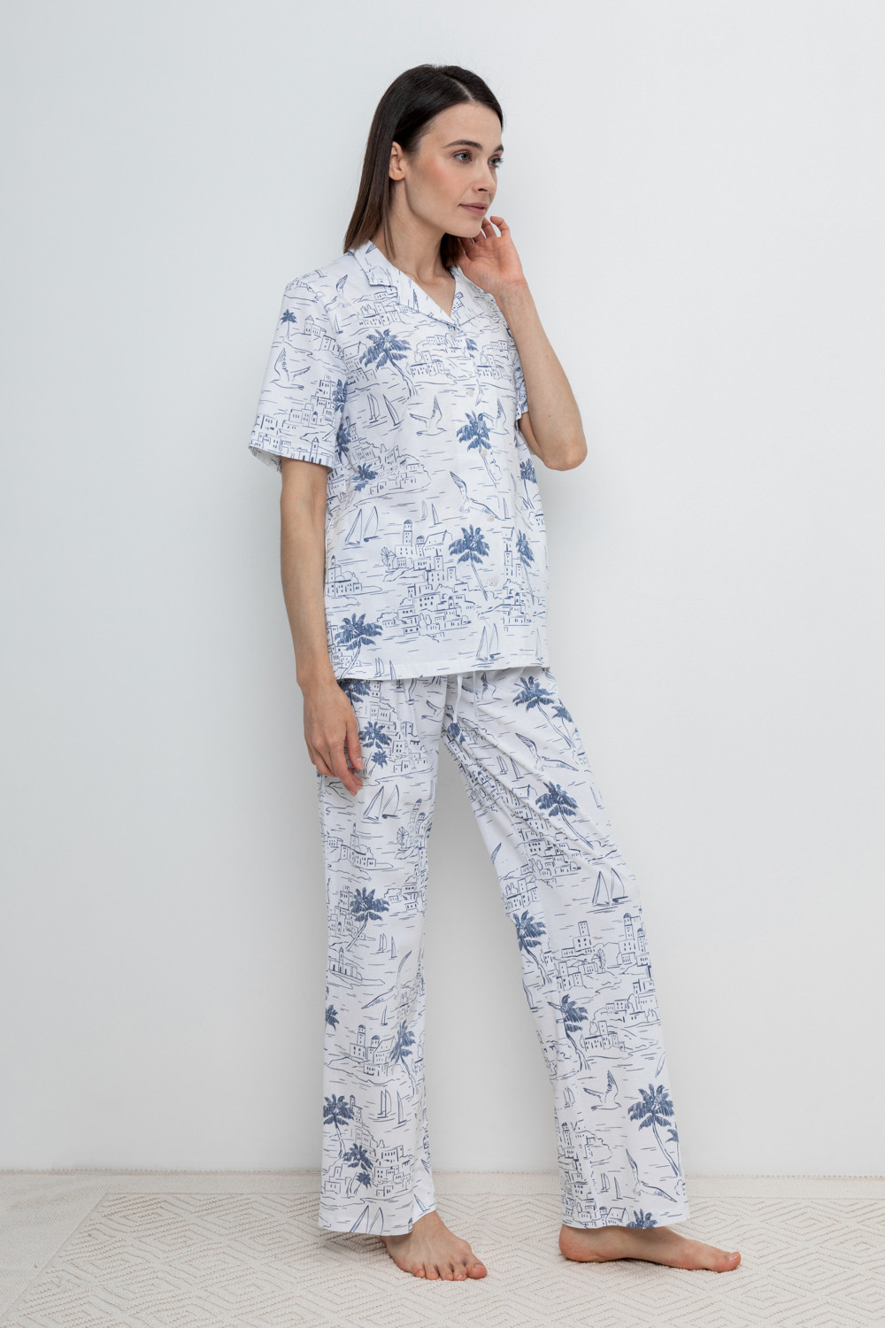 Лёгкие комфортные брюки из набивного трикотажа. Пояс на резинке регулируется по ширине с помощью атласной ленты. Низ изделия обработан плоскими швами. Гладкий материал приятен к телу, не теряет форму и позволяет коже дышать.