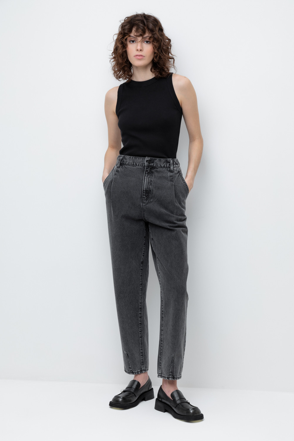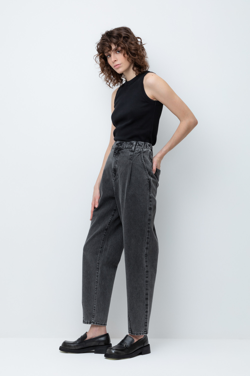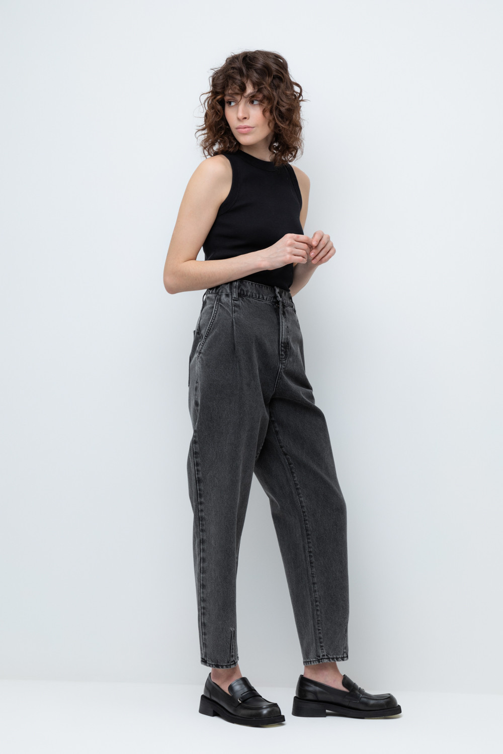 Женские джинсы из 100% хлопка свободного кроя, зауженные книзу, с поясом на резинке и завышенной линией талии. Модель с классическими 5 карманами и подворотами.
