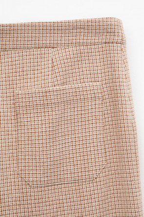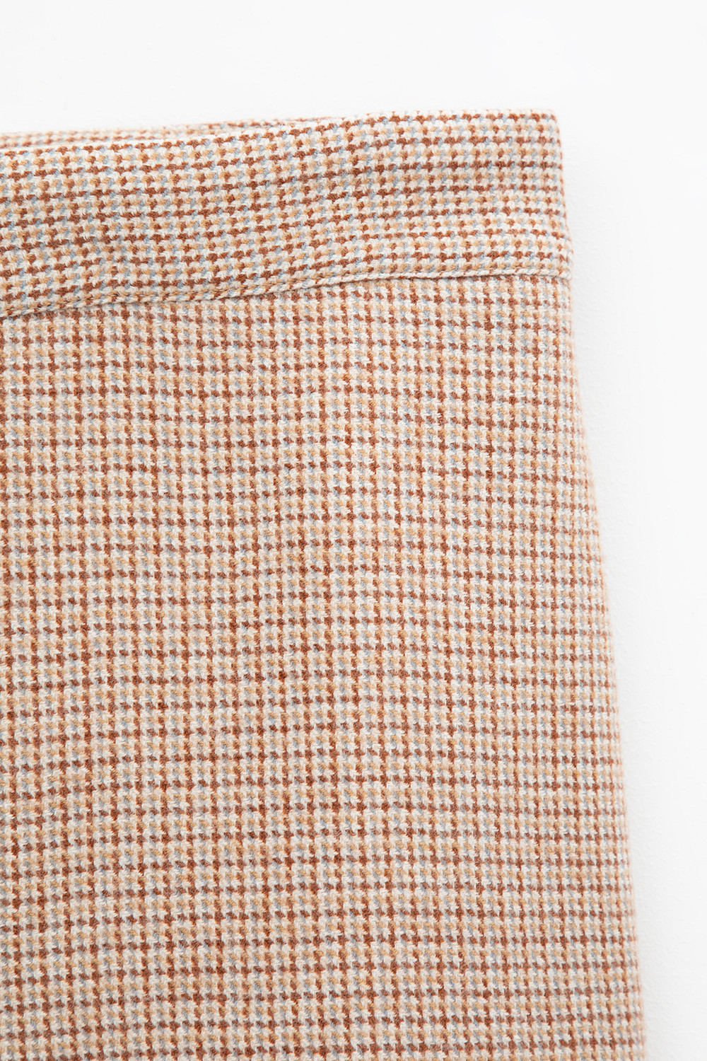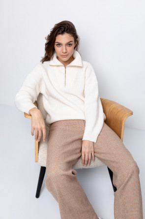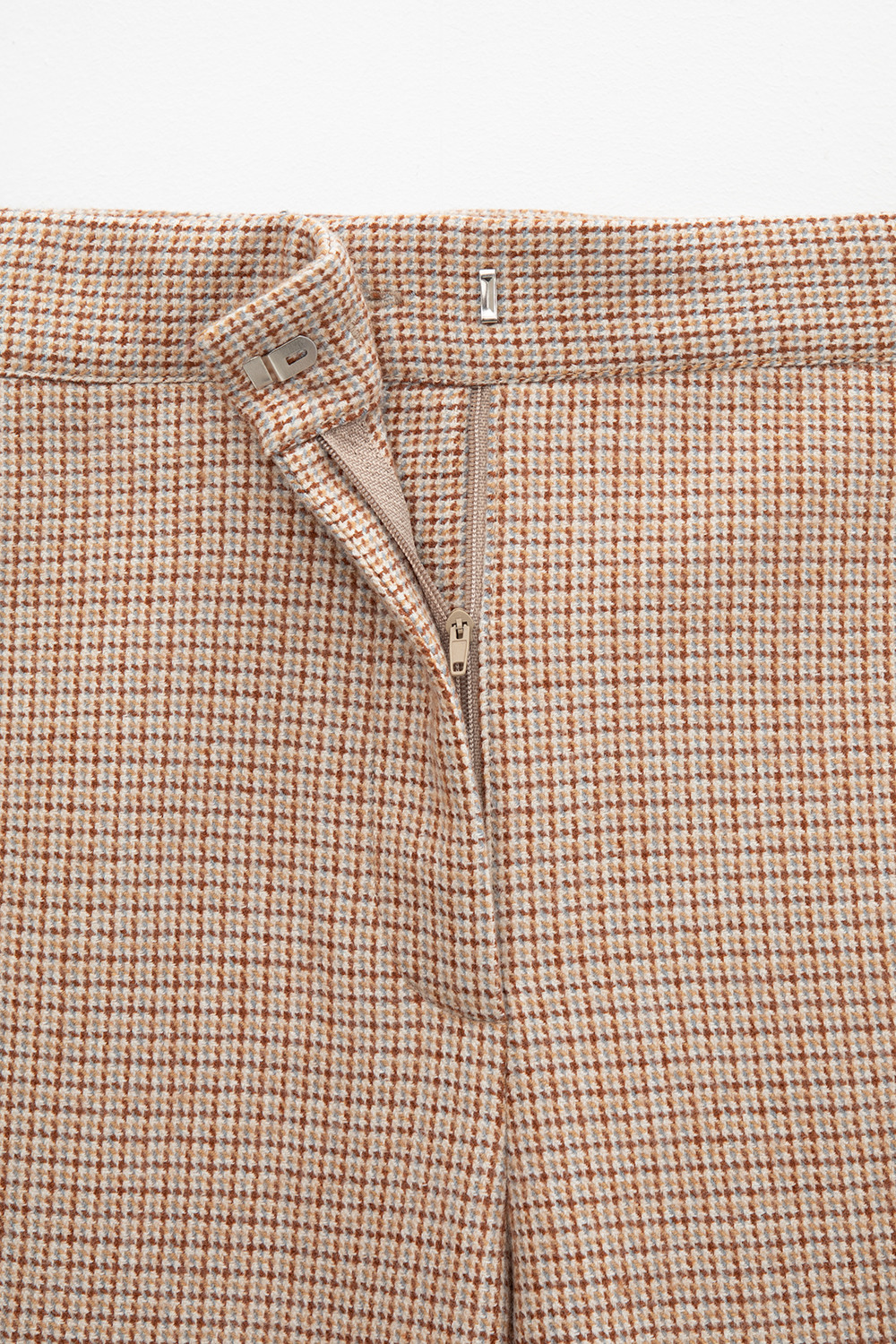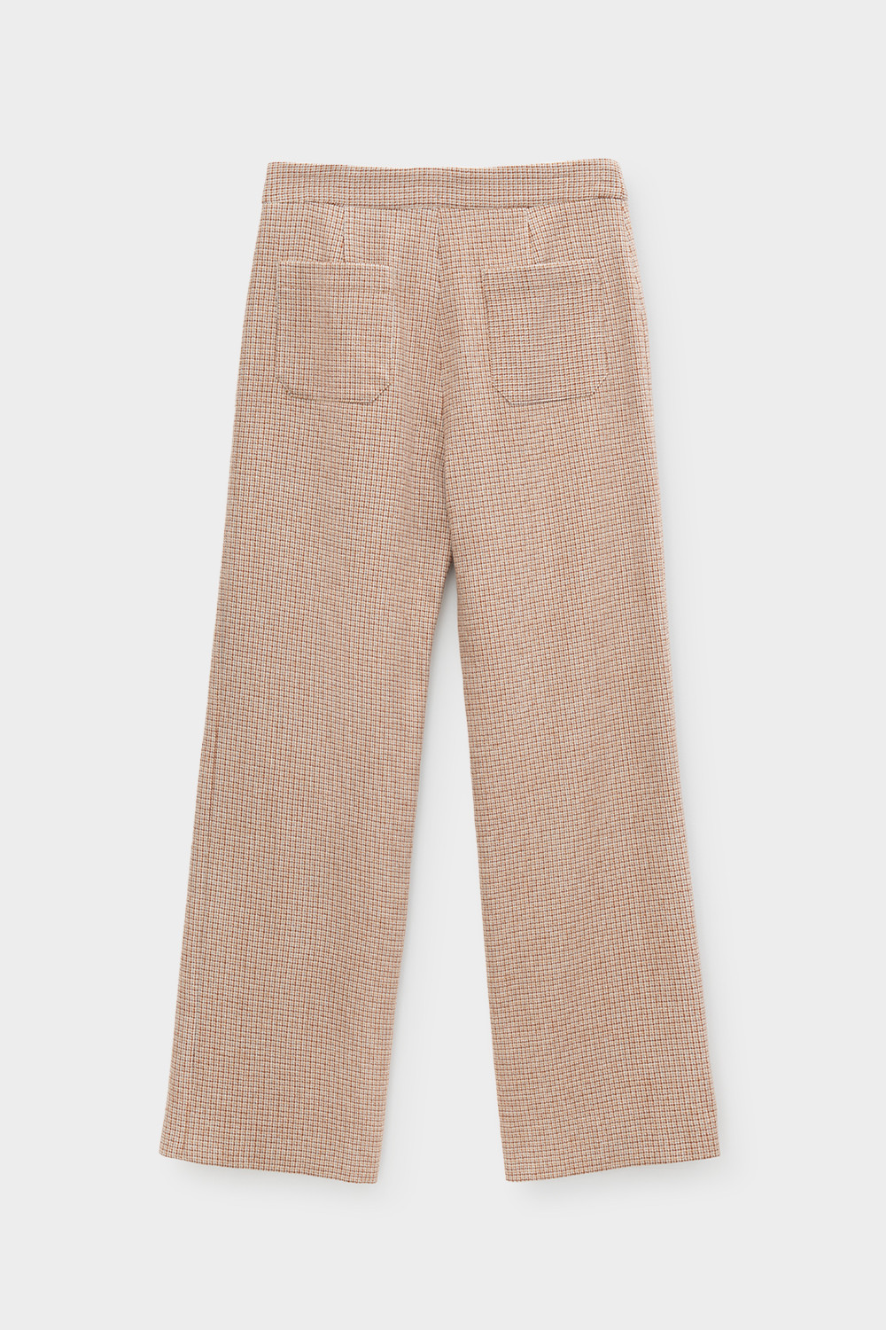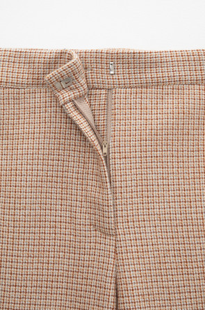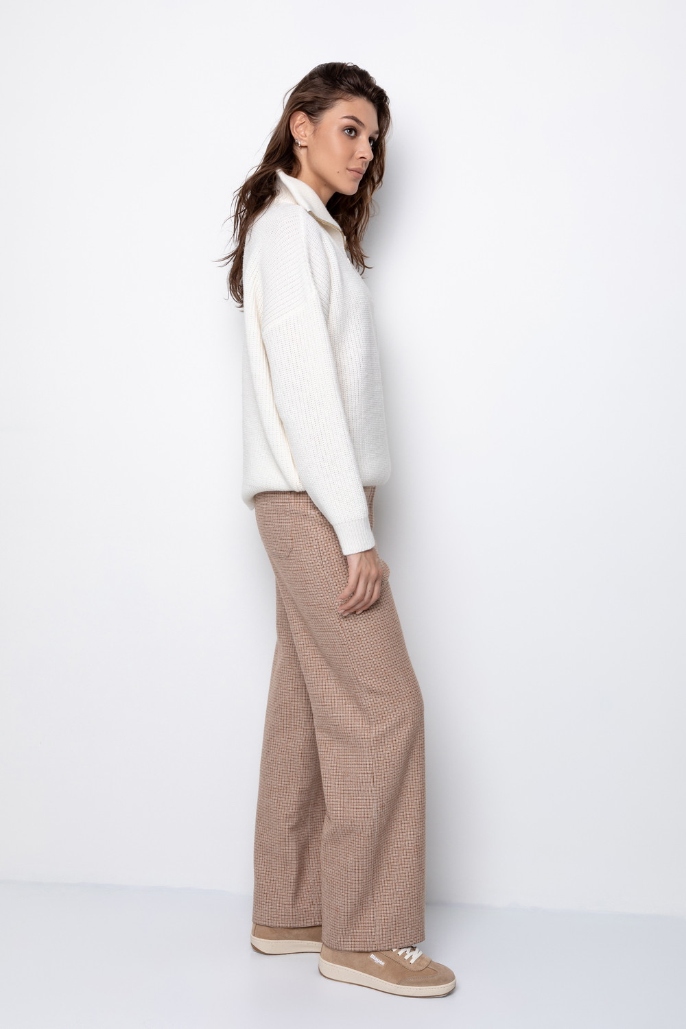 Широкие брюки из шерсти в мелкую клетку с завышенной линией талии. Застегивается спереди на молнию и брючный крючок.