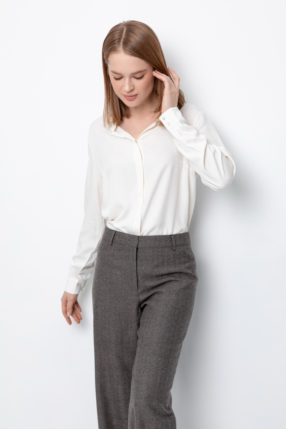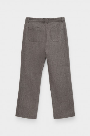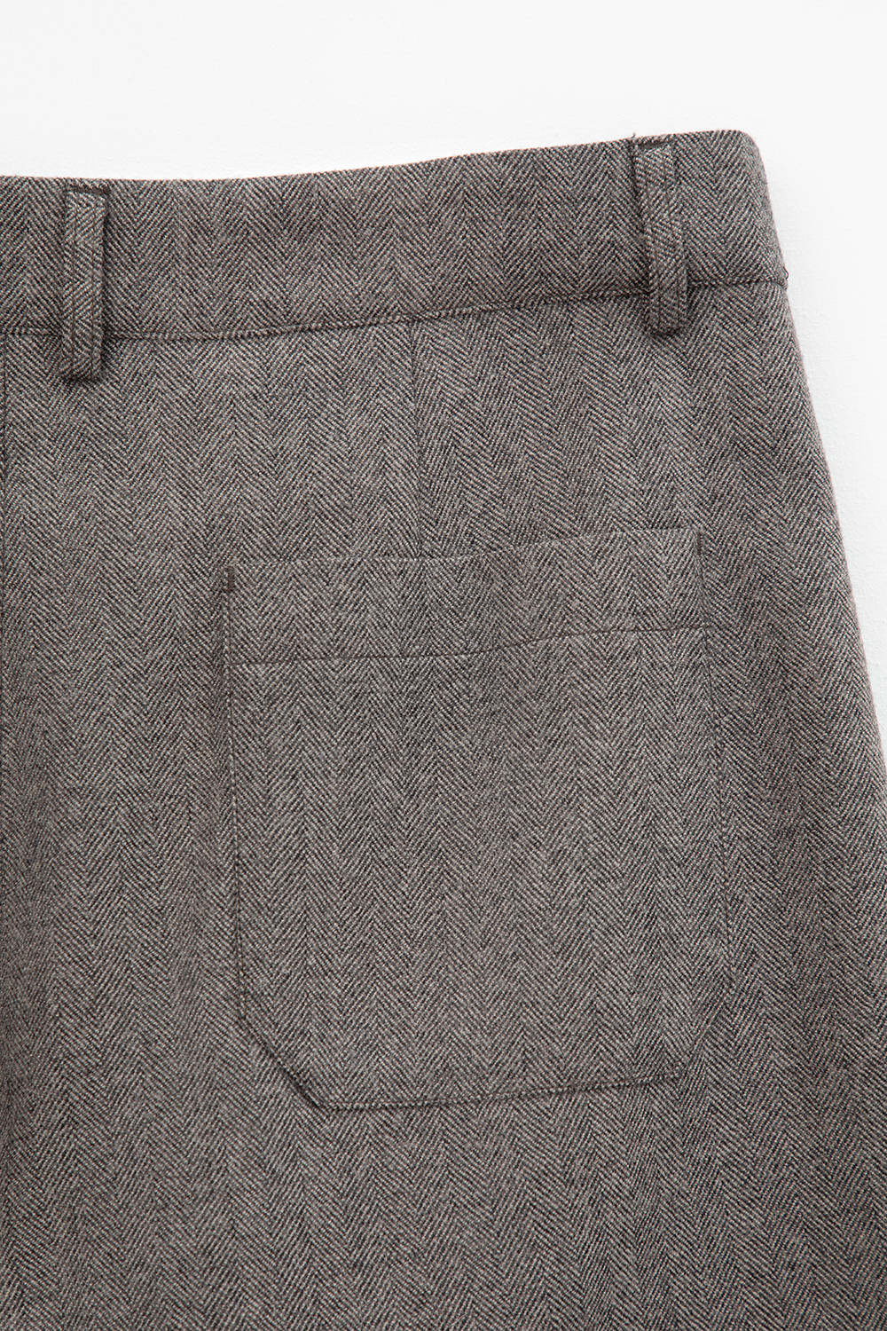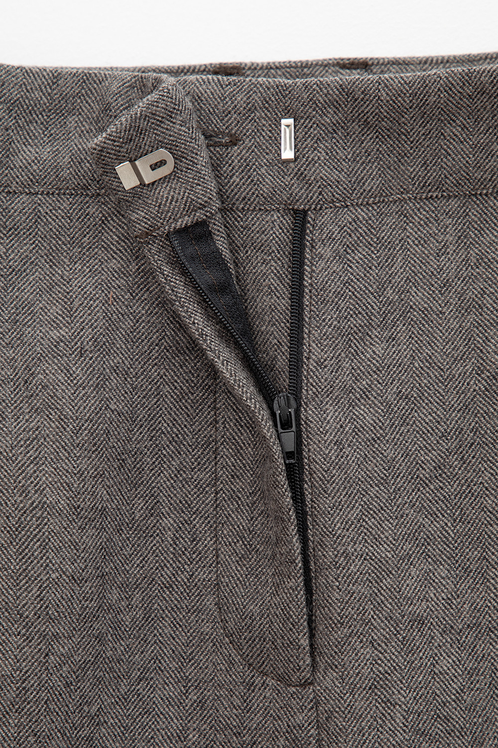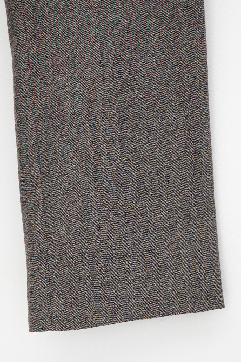 Широкие брюки из шерсти с узором "ёлочка" с завышенной линией талии. Застегивается спереди на молнию и брючный крючок. Пояс со шлевками для ремня.