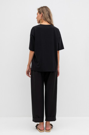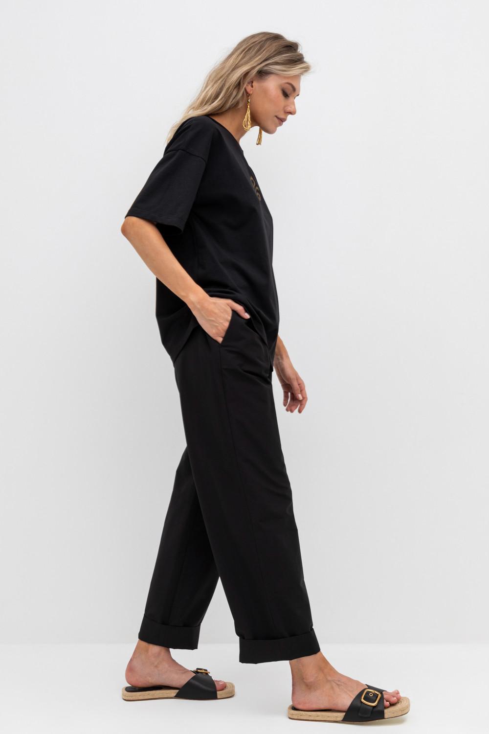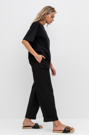 Брюки женские из смесового хлопка с добавлением эластана со съемным поясом и боковыми карманами.