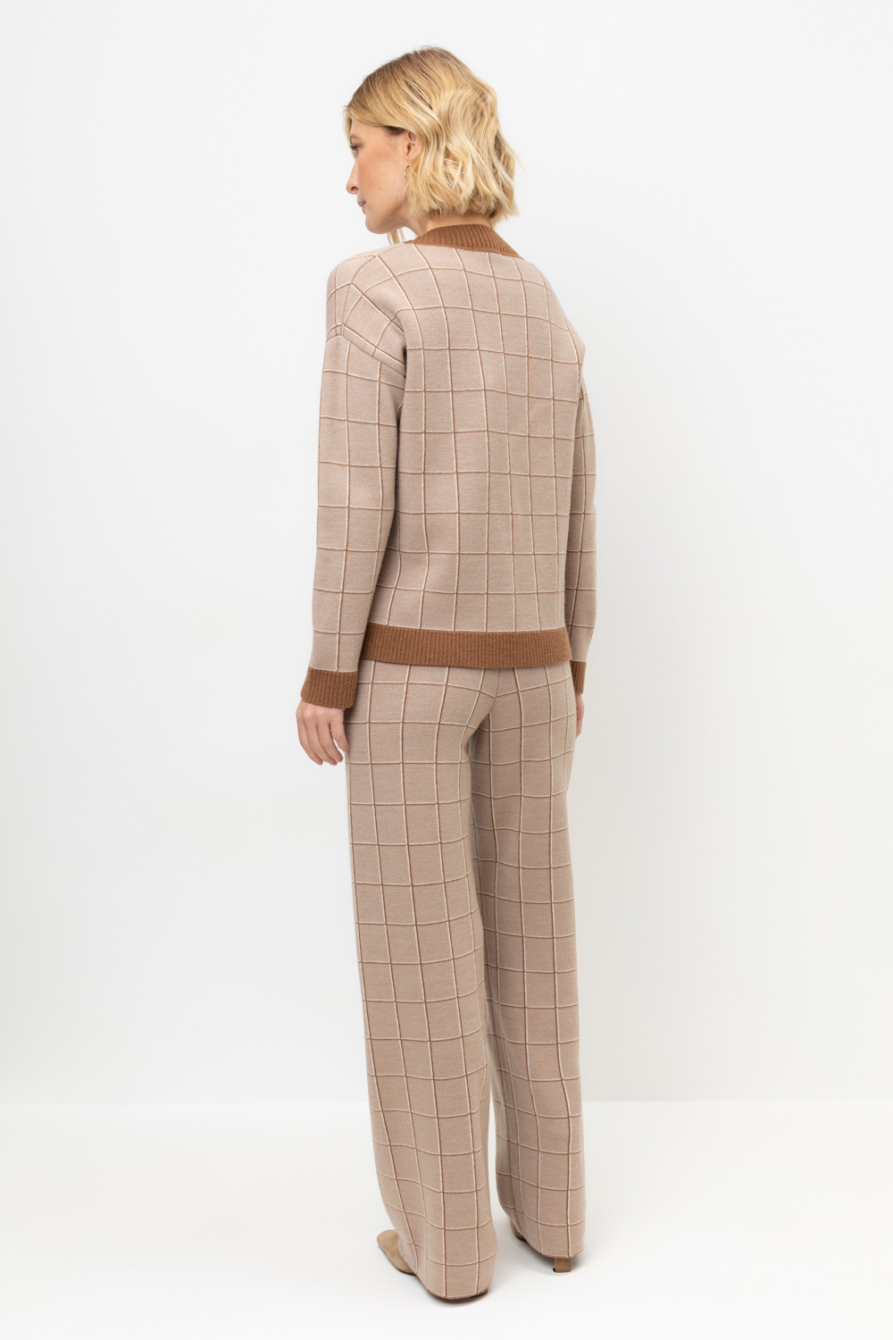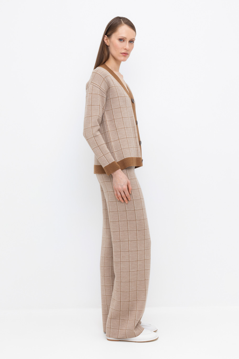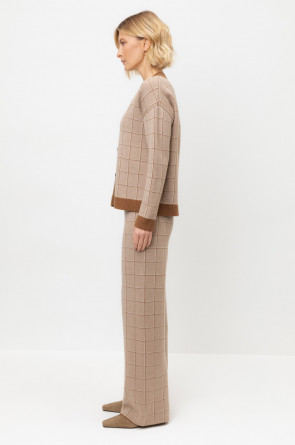 Удобные вязаные брюки прямого силуэта. Связаны жаккардом из мягкой полушерстяной пряжи. В составе 50% шерсти и 50% акрила. Шерсть мериноса в составе сохраняет тепло, а благодаря волокнам акрила изделие мягкое и дольше сохраняет форму. Плотная фактура вязания согревает и сохраняет форму во время носки.