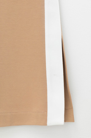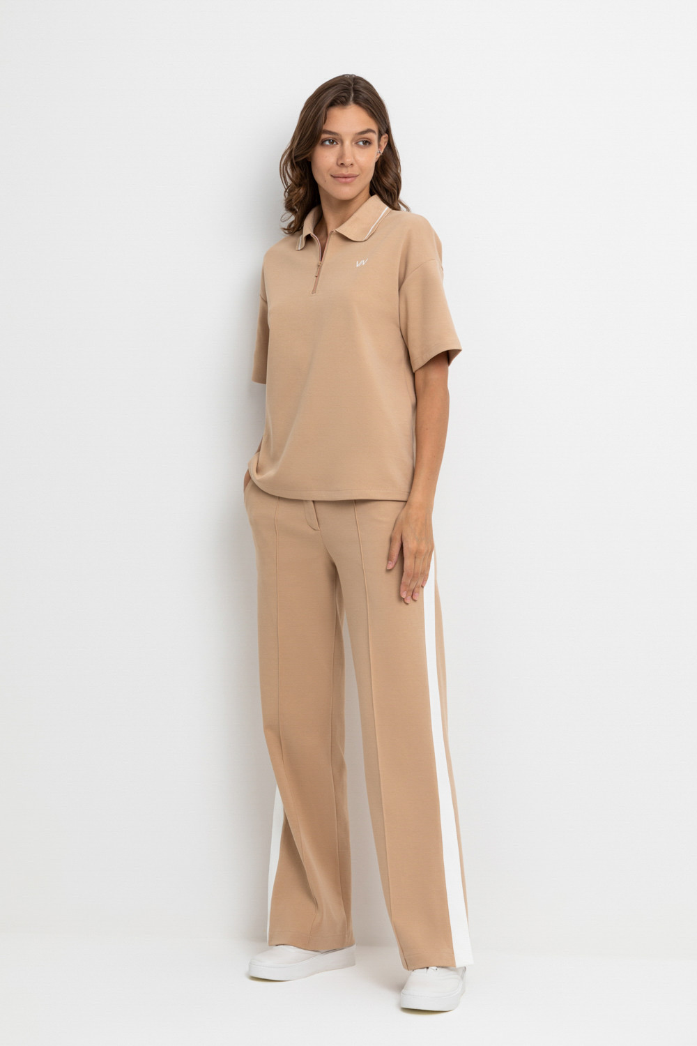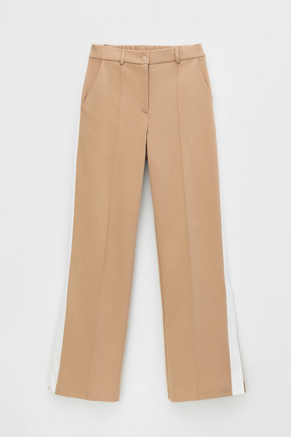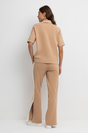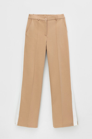 Свободные женские брюки со стрелками и боковыми карманами из плотного гладкого трикотажа интерлок. Модель с контрастными боковыми вставками и разрезами по низу. Застегиваются на молнию и кнопку. Низ обработан плоскими швами.
