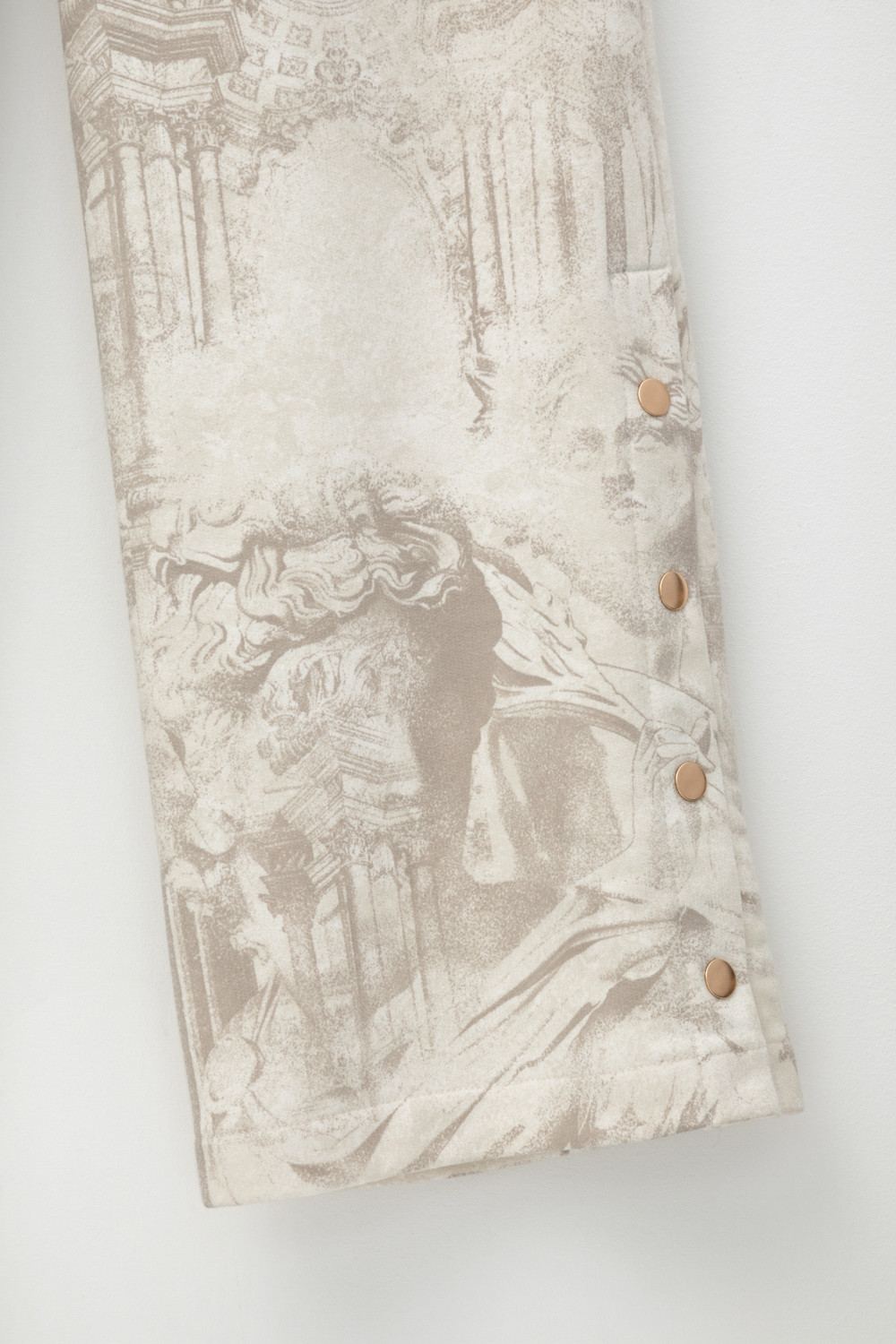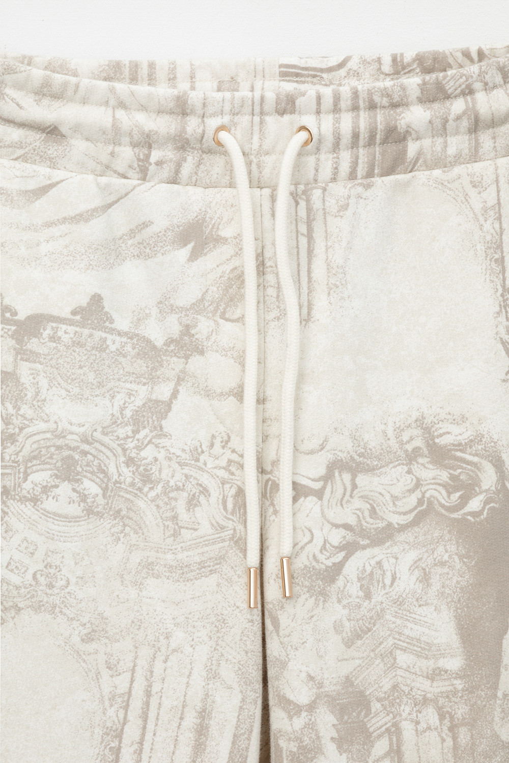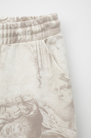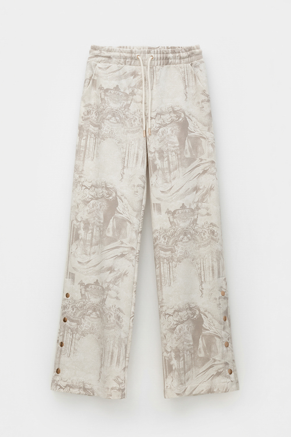 Свободные женские брюки с боковыми карманами из мягкого набивного футера двухнитки. Модель с разрезами по низу, застегивающиеся на кнопки. Низ обработан плоскими швами.