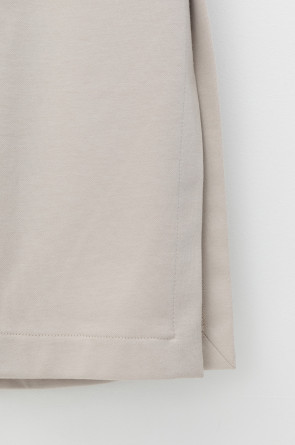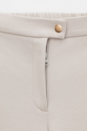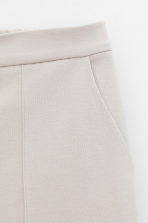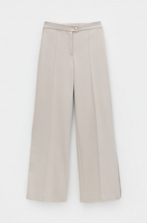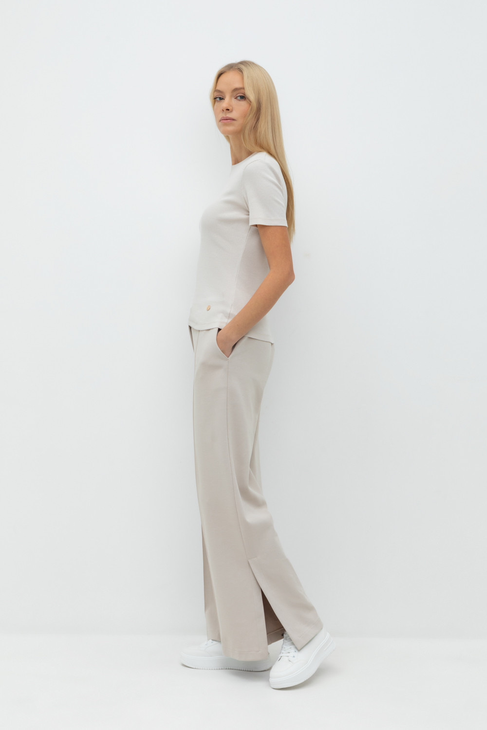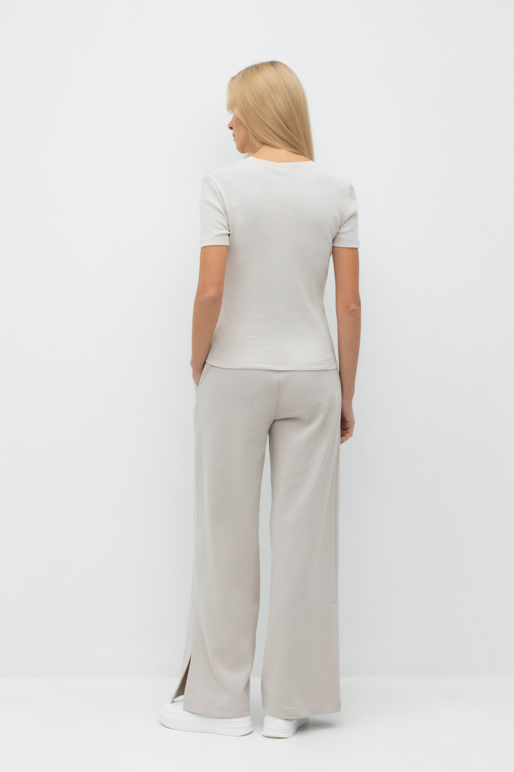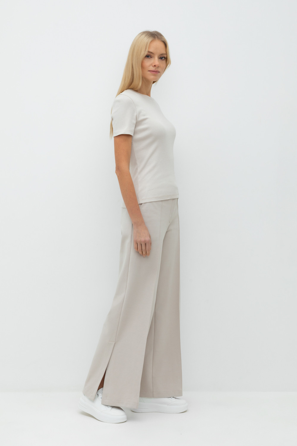 Свободные женские брюки с разрезами и боковыми карманами из плотного гладкого трикотажа интерлок. Низ обработан плоскими швами.
