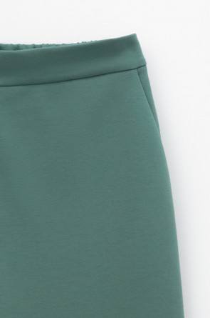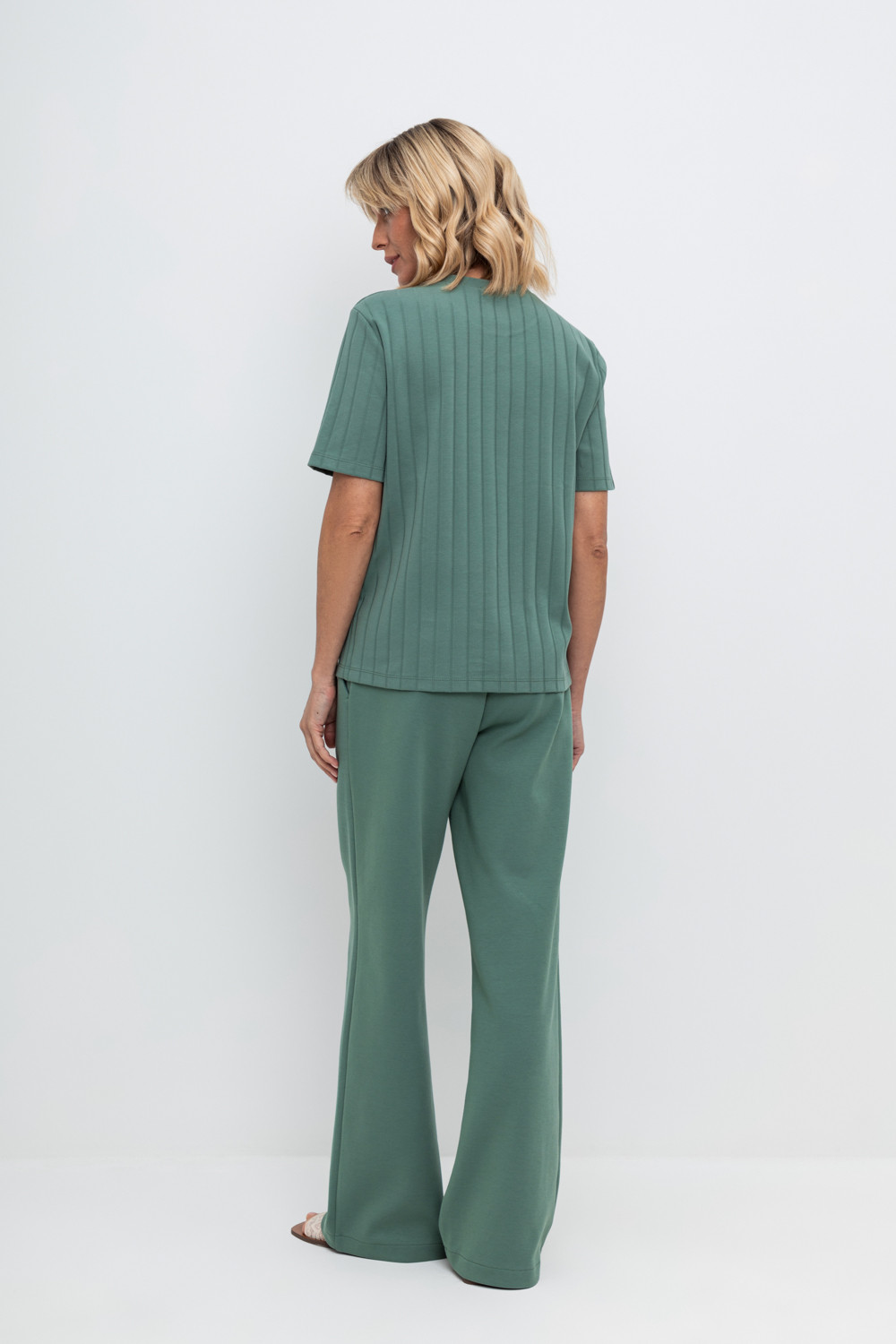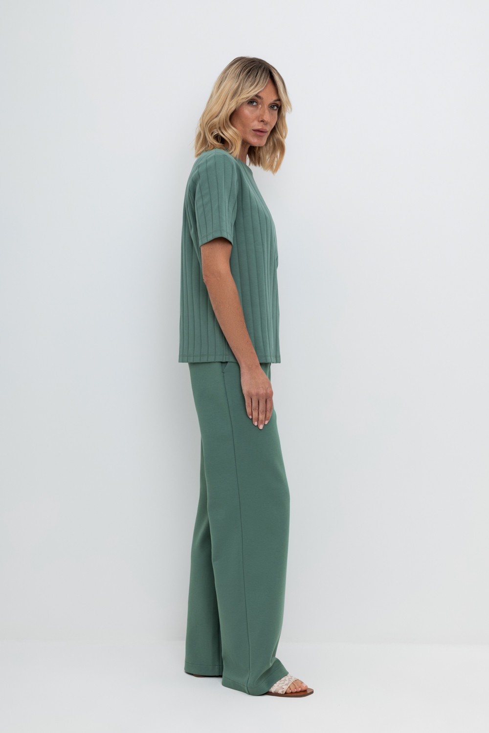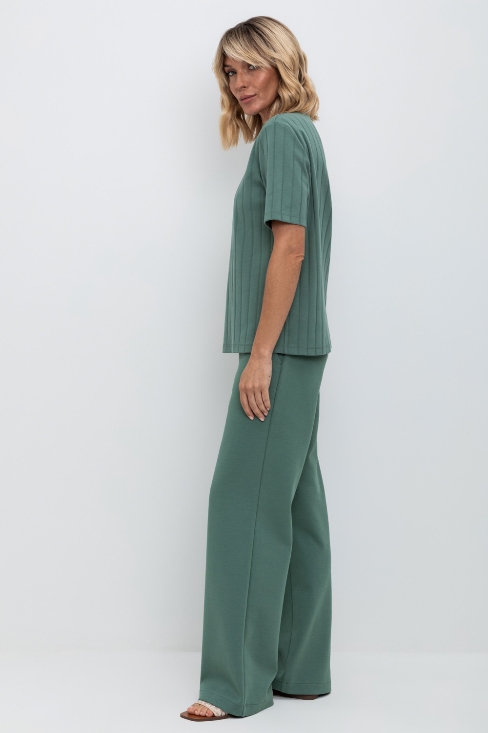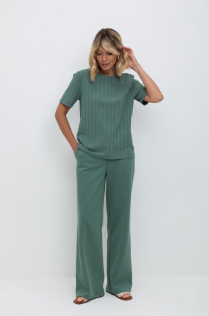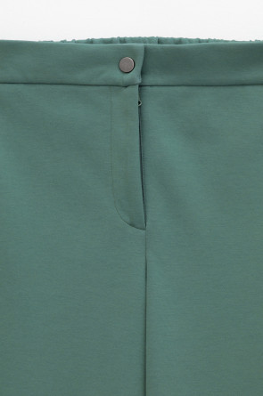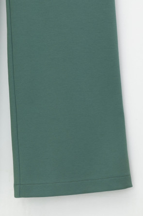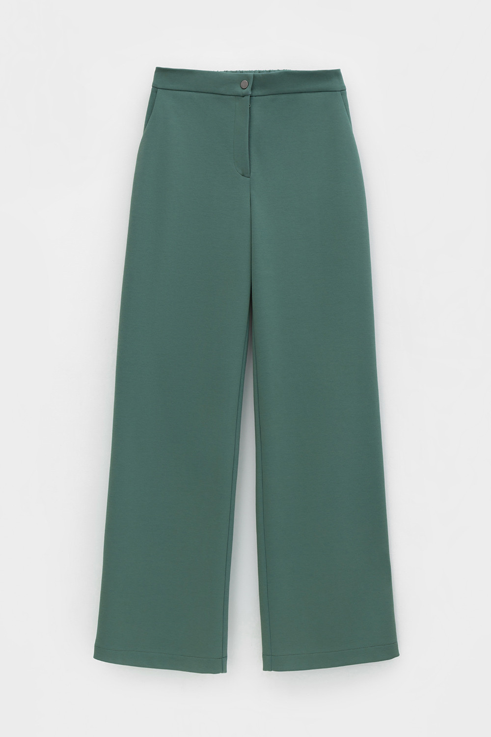 Свободные женские брюки с боковыми карманами из плотного гладкого трикотажа интерлок. Застегиваются на молнию и кнопку. Низ обработан плоскими швами.