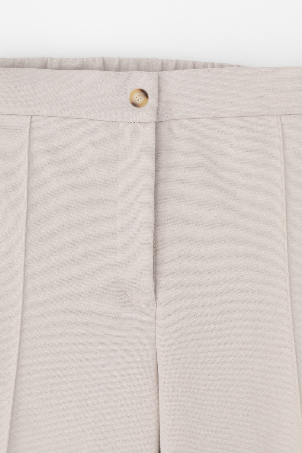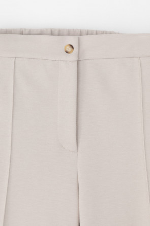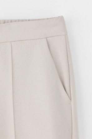 Свободные женские брюки со стрелками и боковыми карманами из плотного гладкого трикотажа интерлок. Застегиваются на молнию и кнопку. Низ обработан плоскими швами.