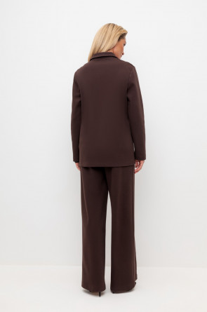 Свободные женские брюки со стрелкой и боковыми карманами из плотного гладкого трикотажа интерлок. Застежка на кнопку. Низ обработан плоскими швами.