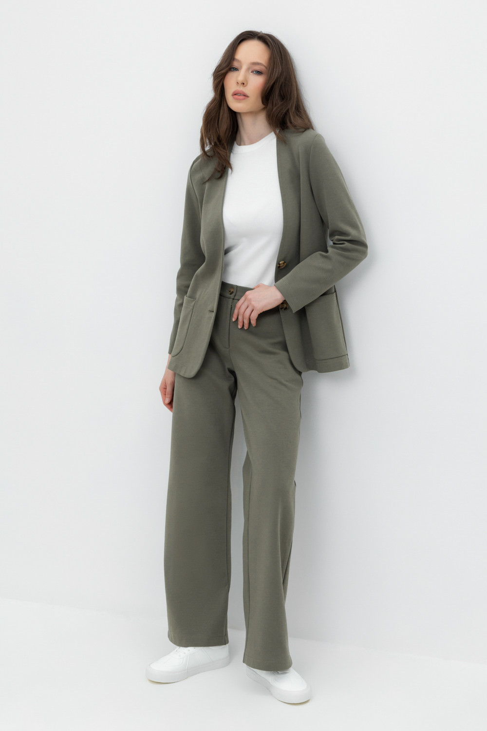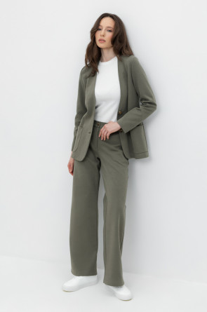 Свободные женские брюки с боковыми карманами из плотного гладкого трикотажа интерлок. Застегиваются на молнию и кнопку. Низ обработан плоскими швами.