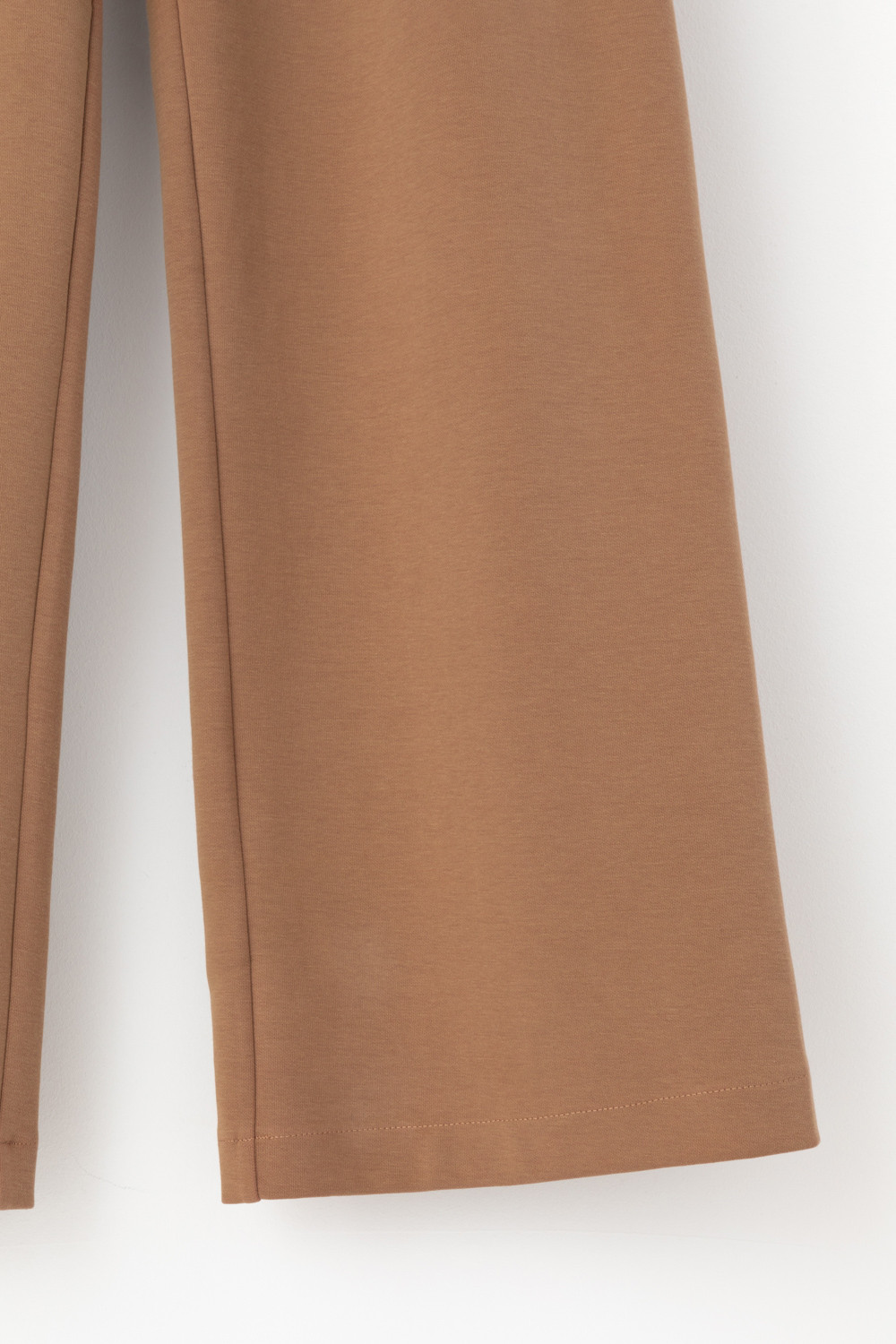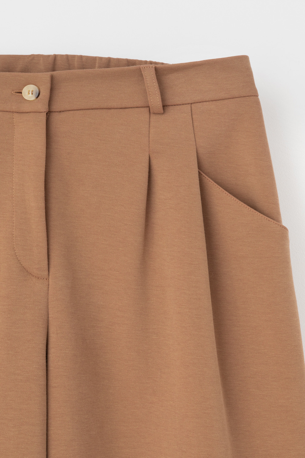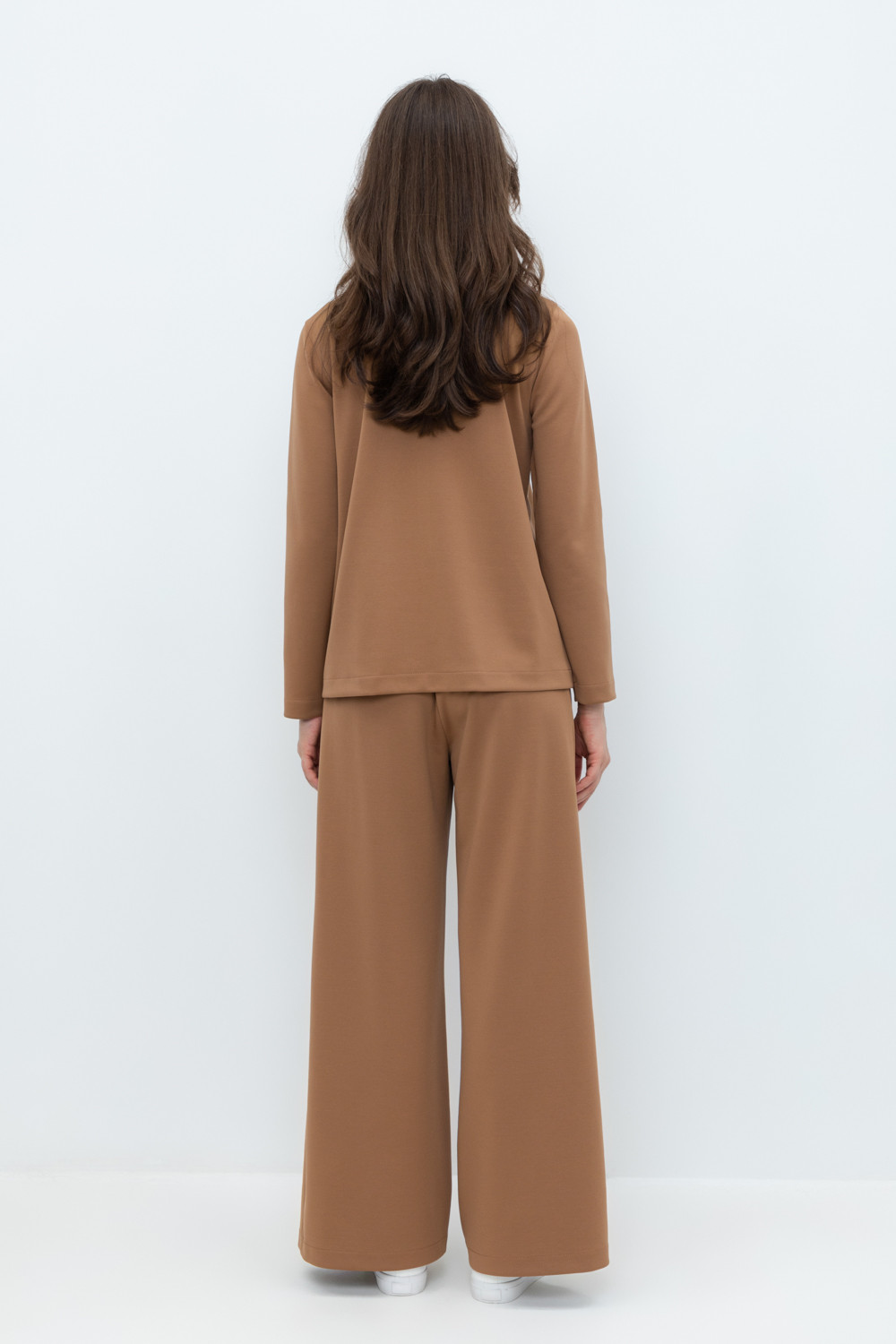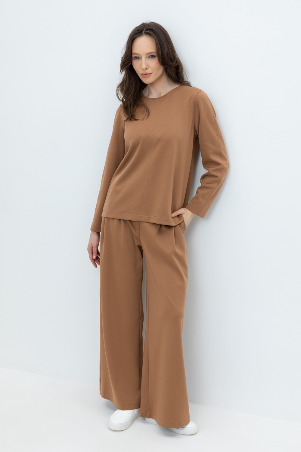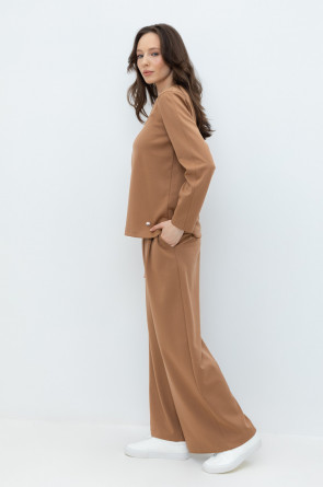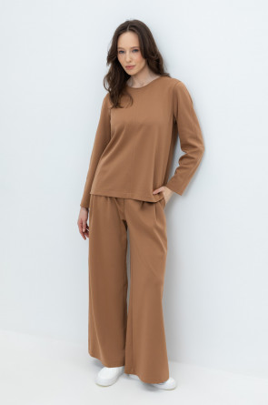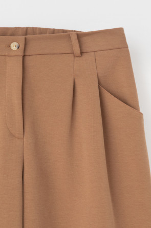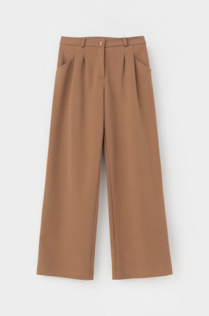 Брюки свободного кроя с декоративными складками и боковыми карманами из плотного гладкого трикотажа интерлок. Застёгивается спереди на молнию и кнопку. Пояс по спинке на резинке. В составе 85% натурального хлопка и 15% полиэстера, при этом полиэстер ввязан внутрь по особой технологии и не соприкасается с кожей.
