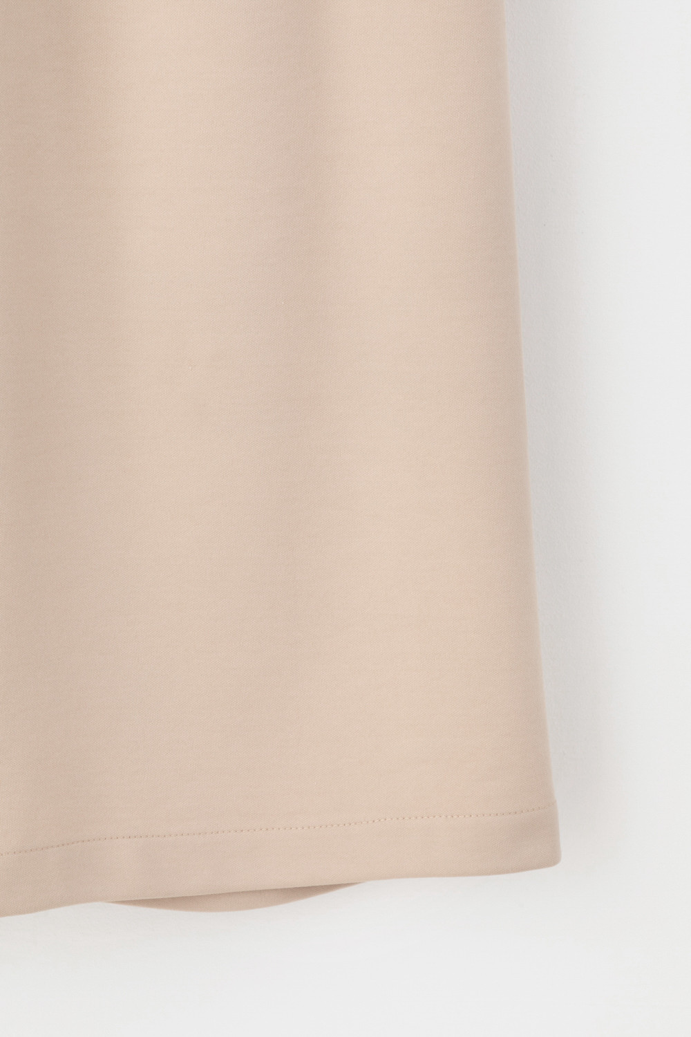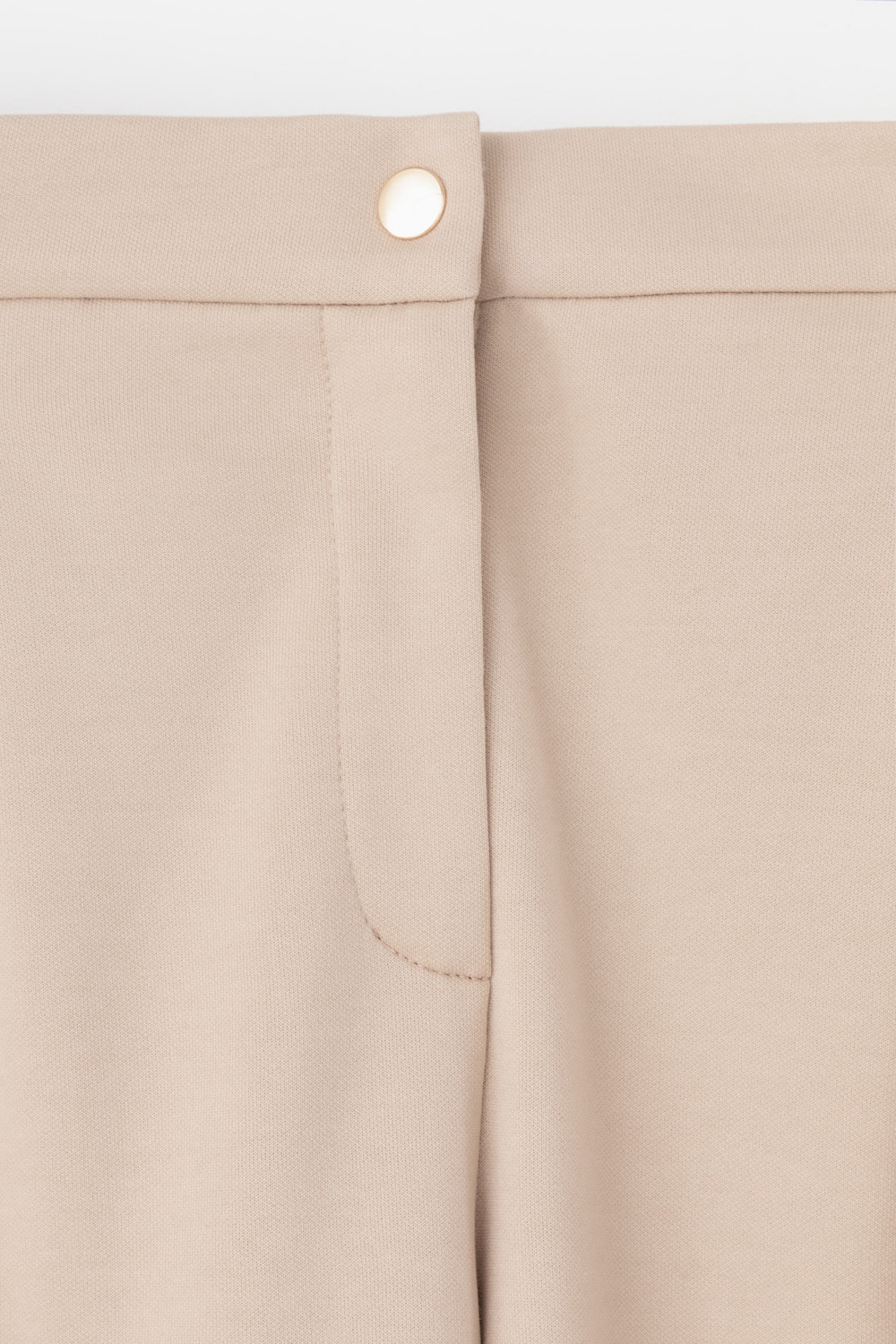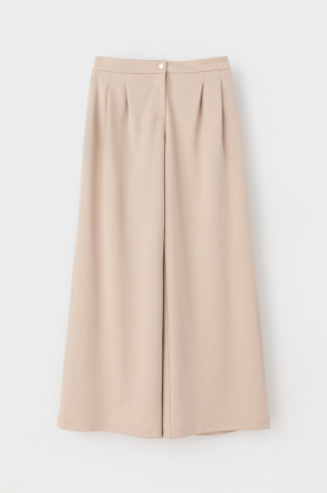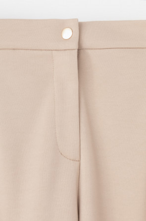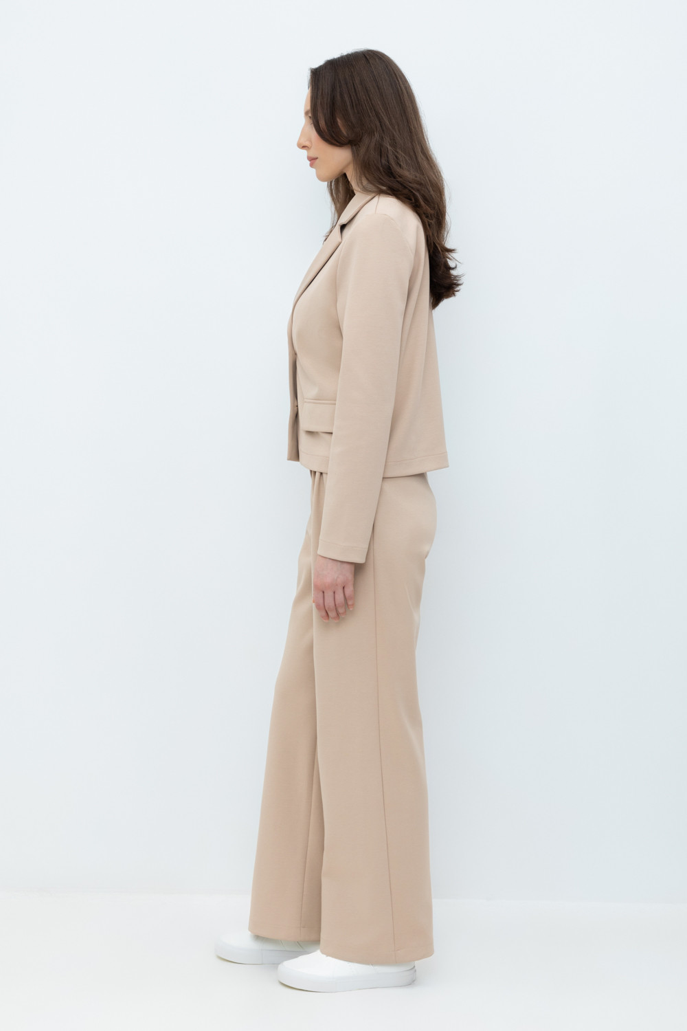Свободные женские брюки со складками и боковыми карманами из плотного гладкого трикотажа интерлок. Застегиваются на молнию и кнопку. Низ обработан плоскими швами.