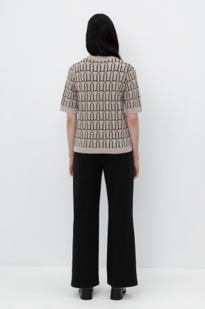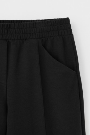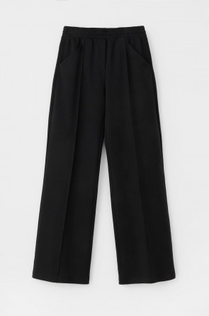 Брюки прямого кроя со стрелкой и боковыми карманами из плотного гладкого трикотажа интерлок.