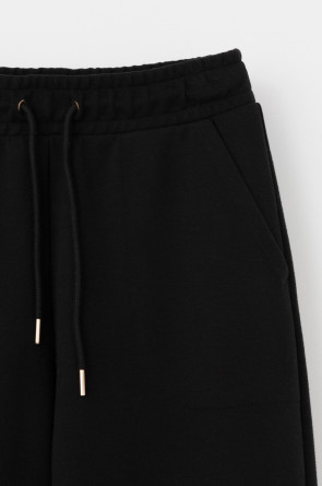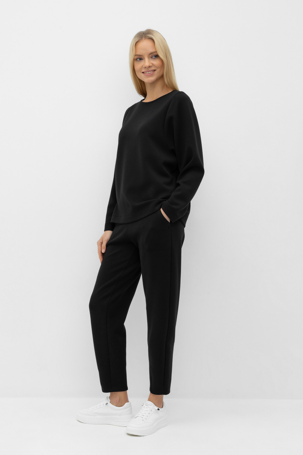 Женские брюки зауженного кроя с боковыми карманами из плотного гладкого трикотажа интерлок. Пояс со шнурком позволяет регулировать посадку.