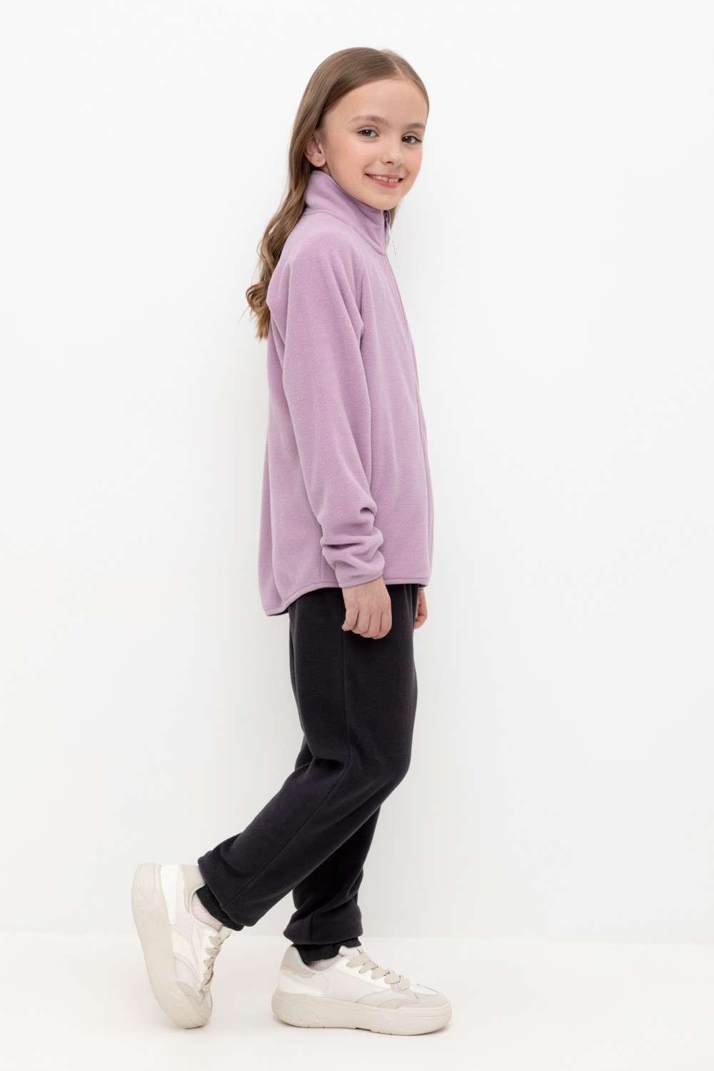 Однотонные детские брюки из флиса с эластичными манжетами. Пояс на резинке. Брюки сохраняют цвет и форму после многократных стирок.