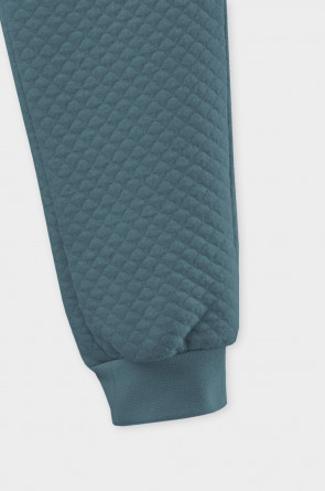Тёплые брюки из капитония. Капитоний – это стёганое трикотажное полотно с утеплителем из полиэстеровой нити. Изделие имеет мягкие эластичные манжеты и пояс из рибаны. Пояс регулируется по ширине с помощью шнурка. Все трикотажные полотна производятся в соответствии с нормами Швейцарского сертификата ЭкоТекс.