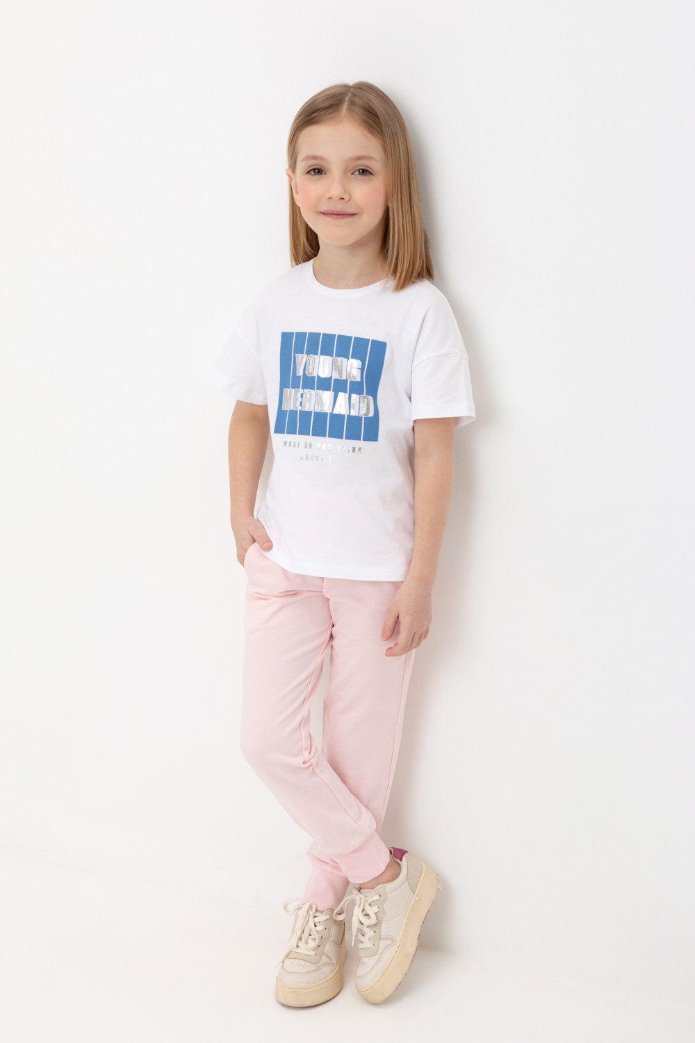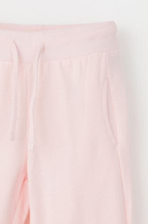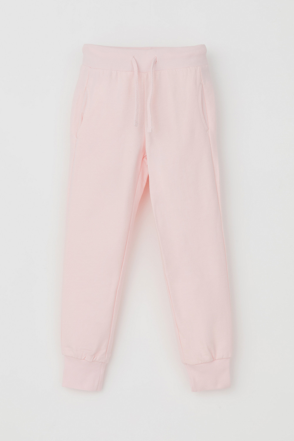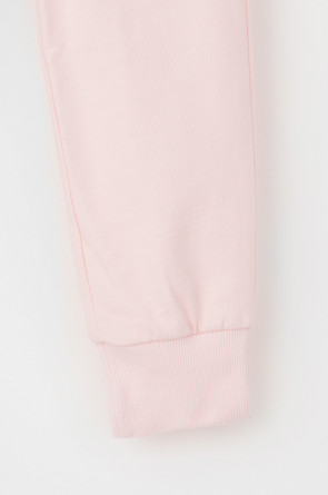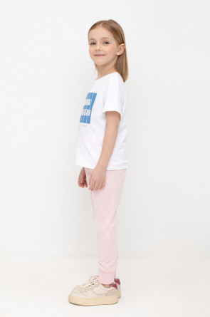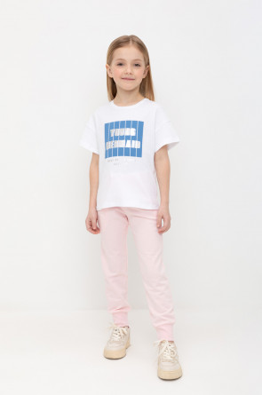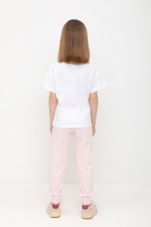 Трикотажные брюки для девочки из петельчатого футера. Эластичный пояс на резинке регулируется по ширине с помощью шнура, по бокам два удобных кармана, внизу эластичные манжеты.