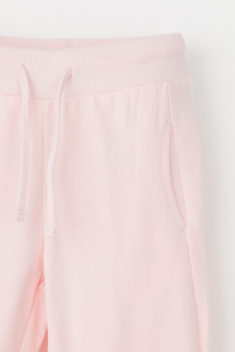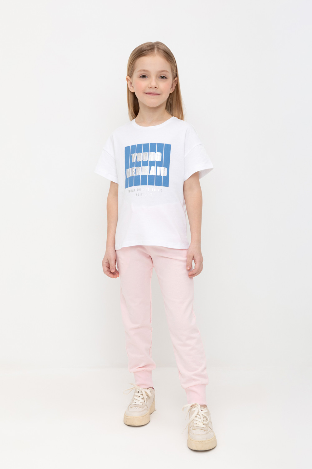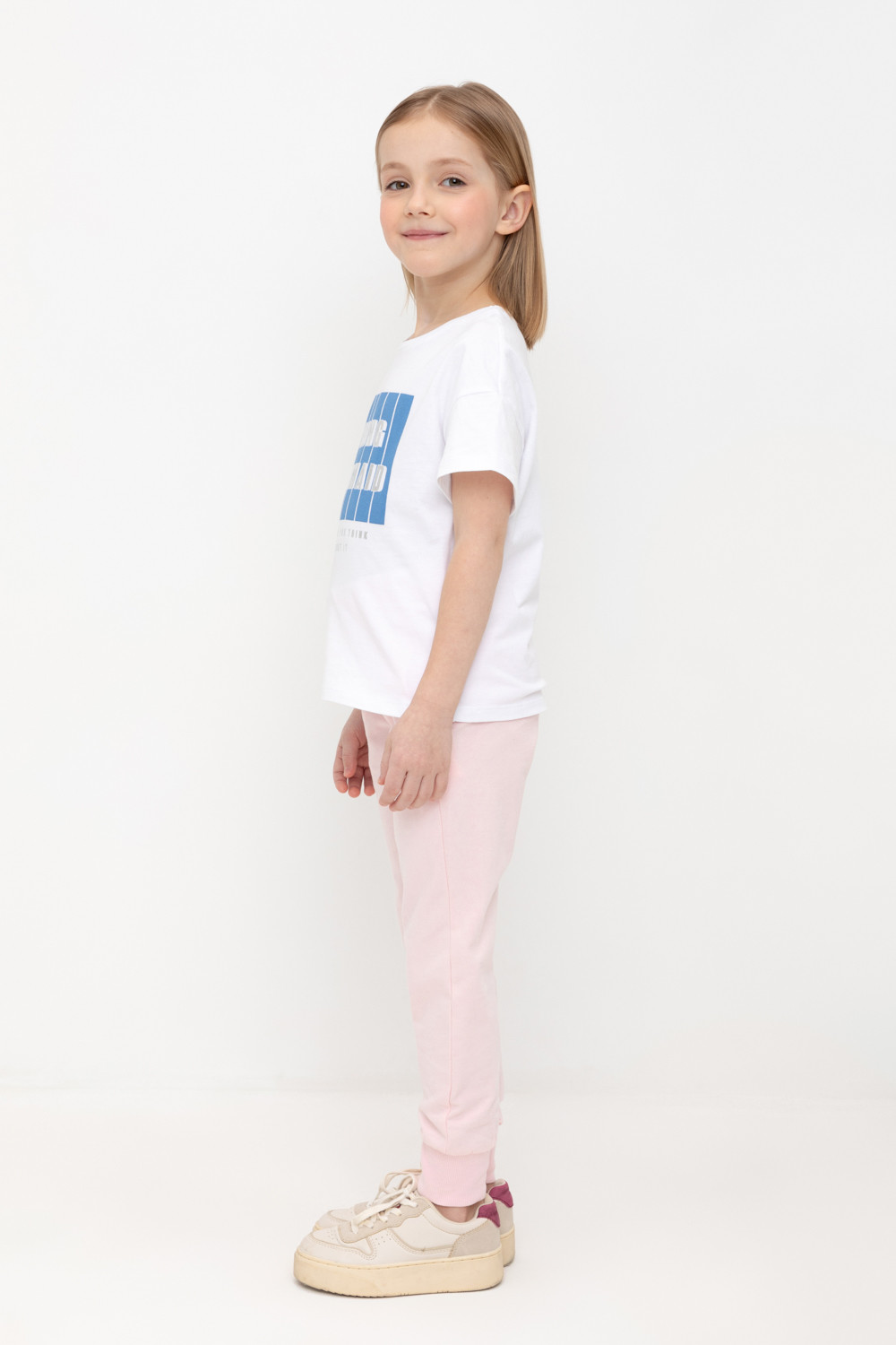 Трикотажные брюки для девочки из петельчатого футера. Эластичный пояс на резинке регулируется по ширине с помощью шнура, по бокам два удобных кармана, внизу эластичные манжеты.
