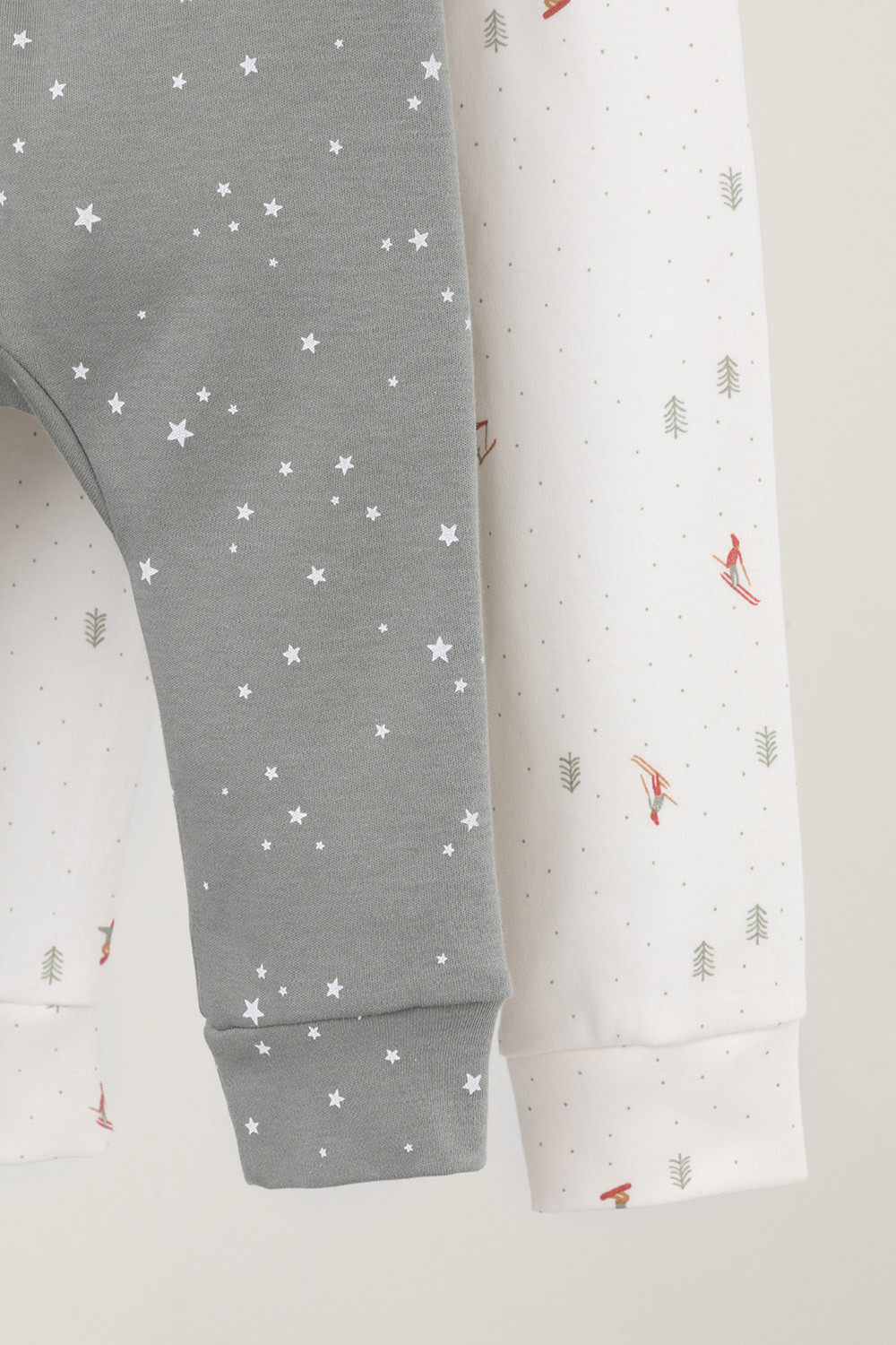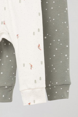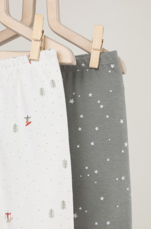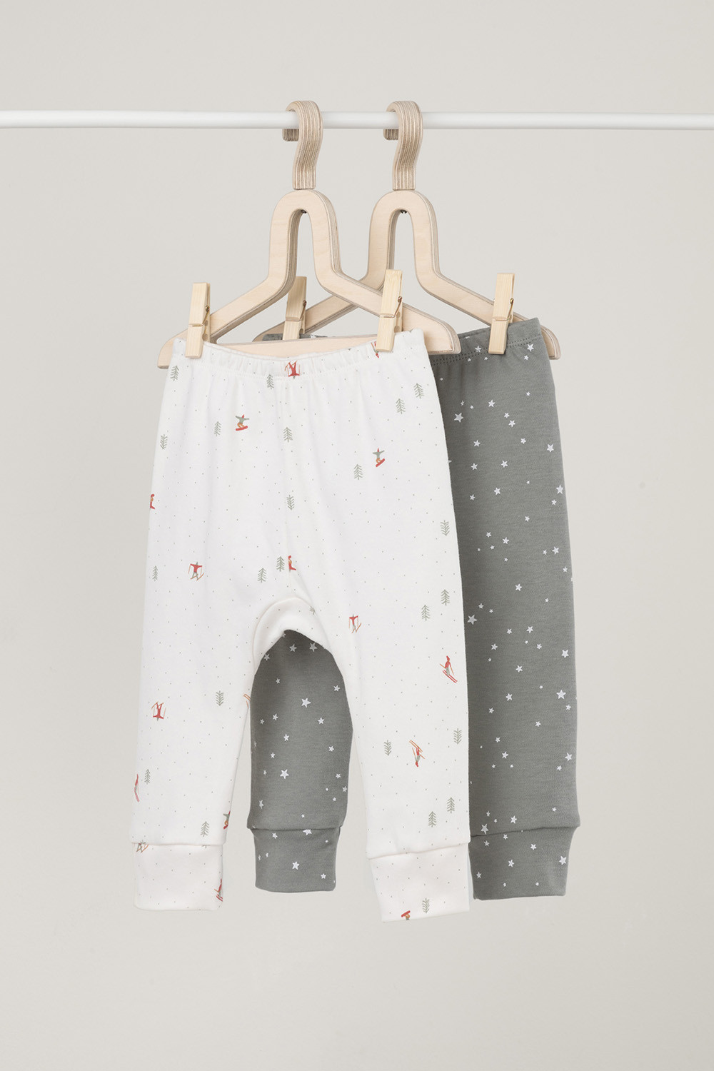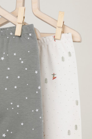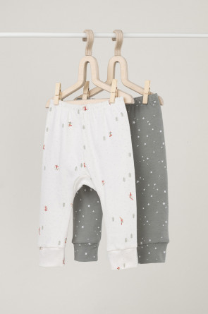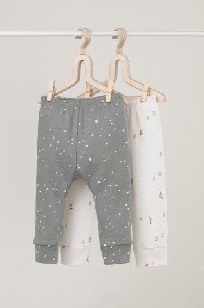 Брюки в упаковке 2 шт для новорождённых из мягкого, эластичного трикотажа, произведенного из натурального хлопка. Пояс на резинке. Оригинальная набивка выполнена из стойких, гипоаллергенных текстильных красителей. Все трикотажные полотна производятся в соответсвии с нормами Швейцарского сертификата ЭкоТекс.