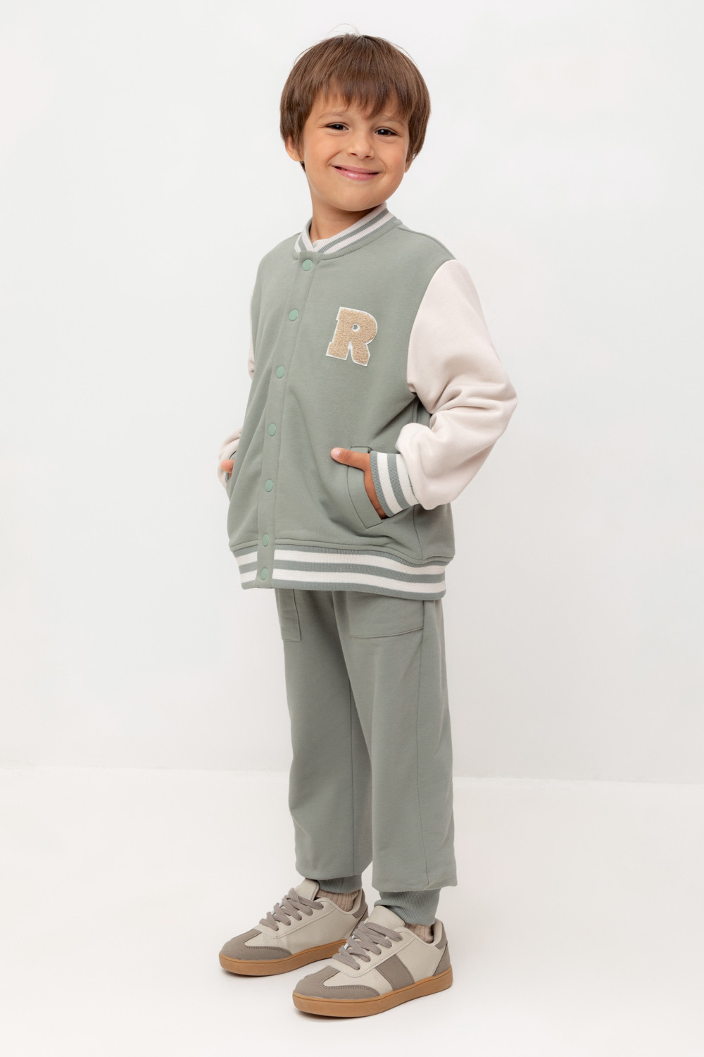 Брюки для мальчика из мягкого петельчатого трикотажа. Эластичный пояс на резинке регулируется по ширине с помощью шнурка. По бокам два удобных накладных кармана. Внизу эластичные манжеты.