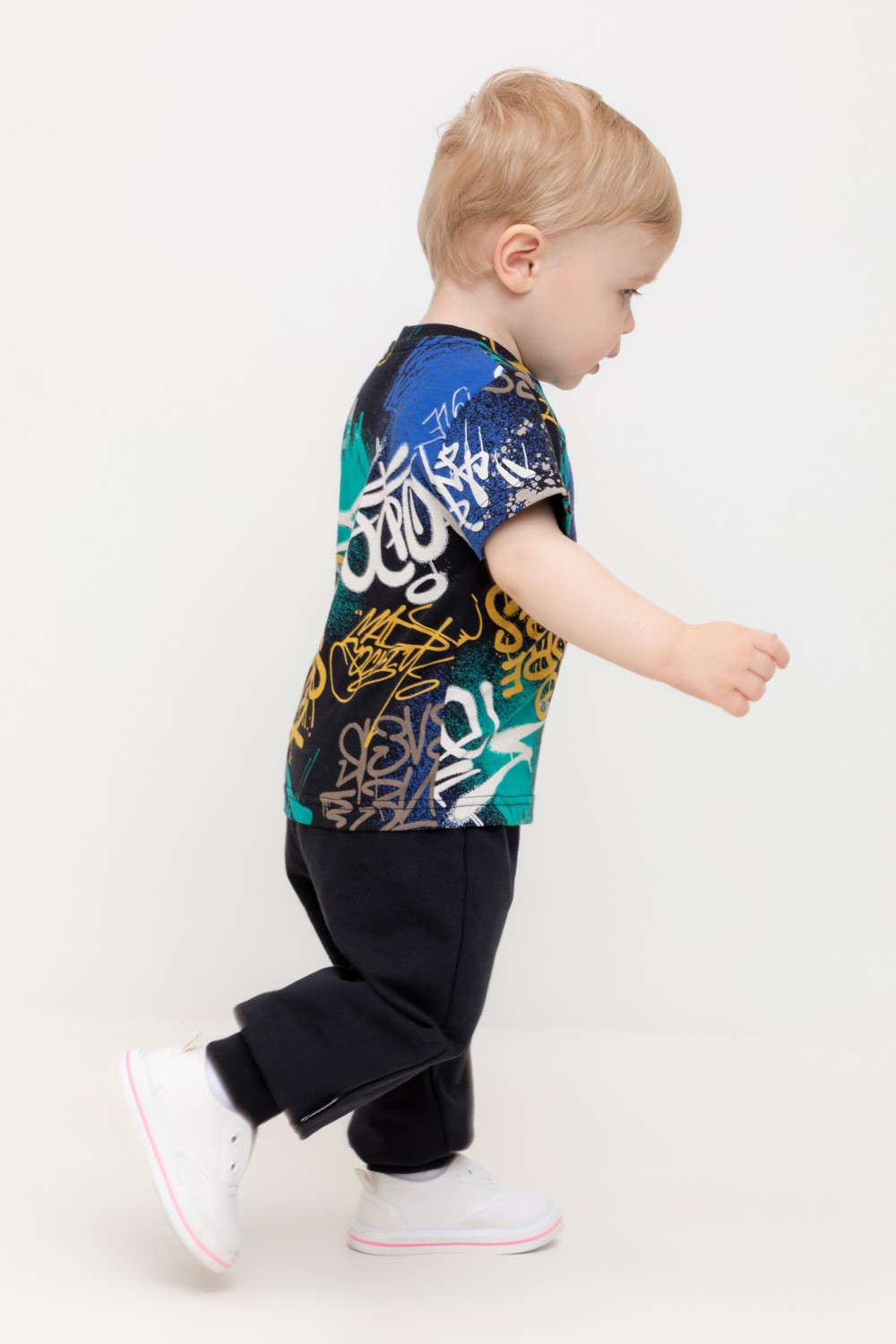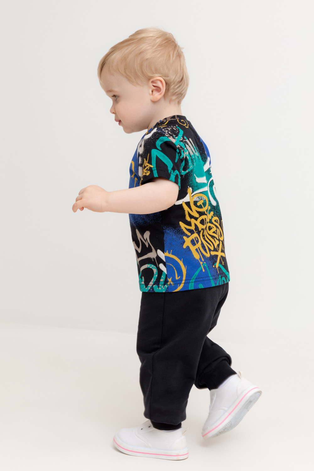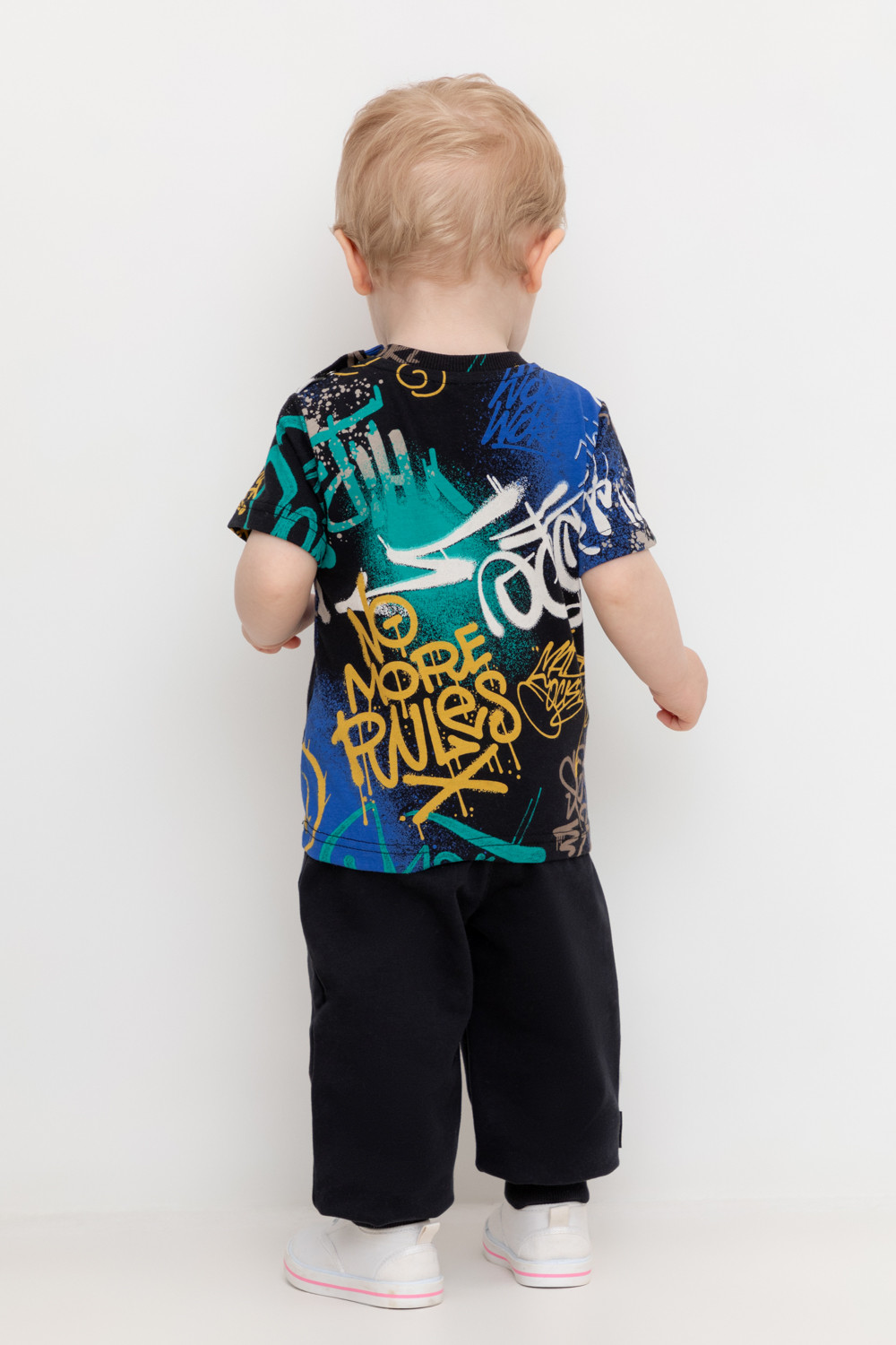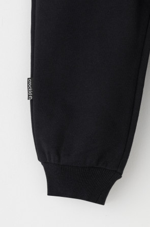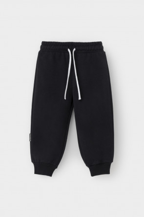 Свободные брюки для мальчика из петельчатого футера. Эластичный пояс на резинке регулируется по ширине с помощью шнурка, внизу эластичные манжеты.
