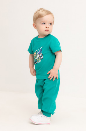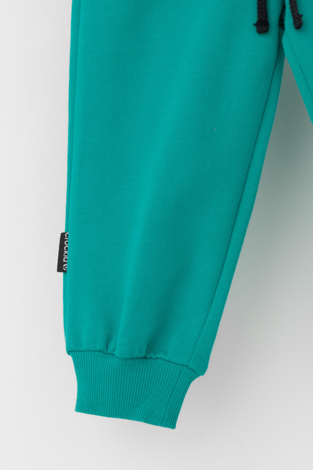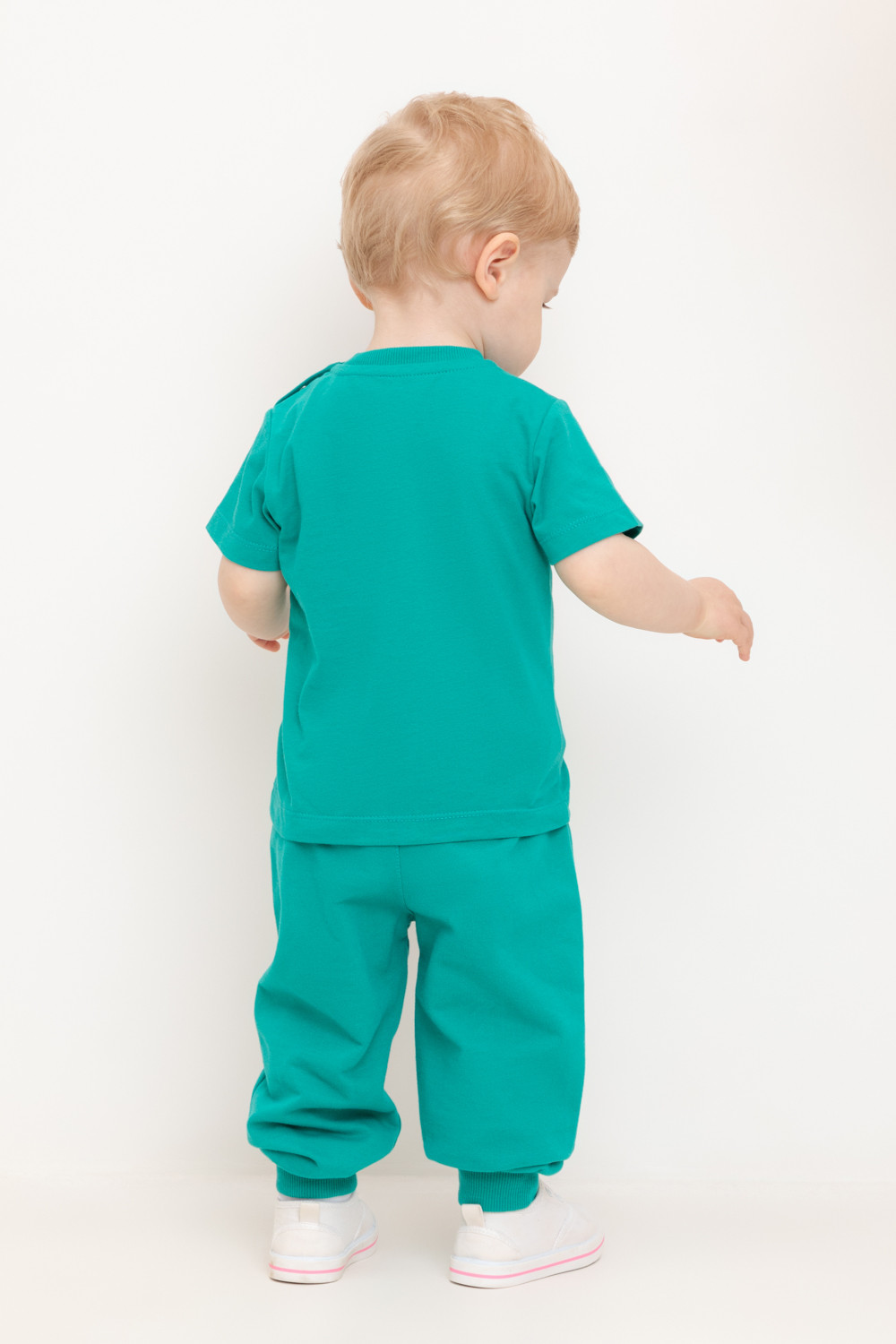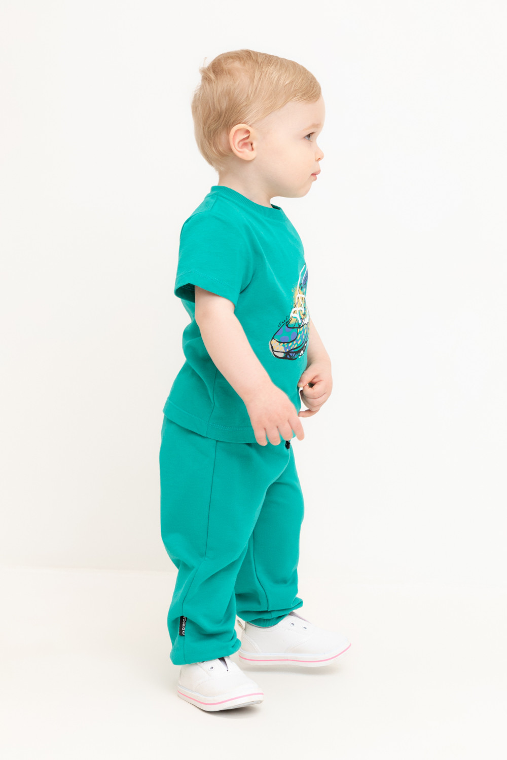 Свободные брюки для мальчика из петельчатого футера. Эластичный пояс на резинке регулируется по ширине с помощью шнурка, внизу эластичные манжеты.