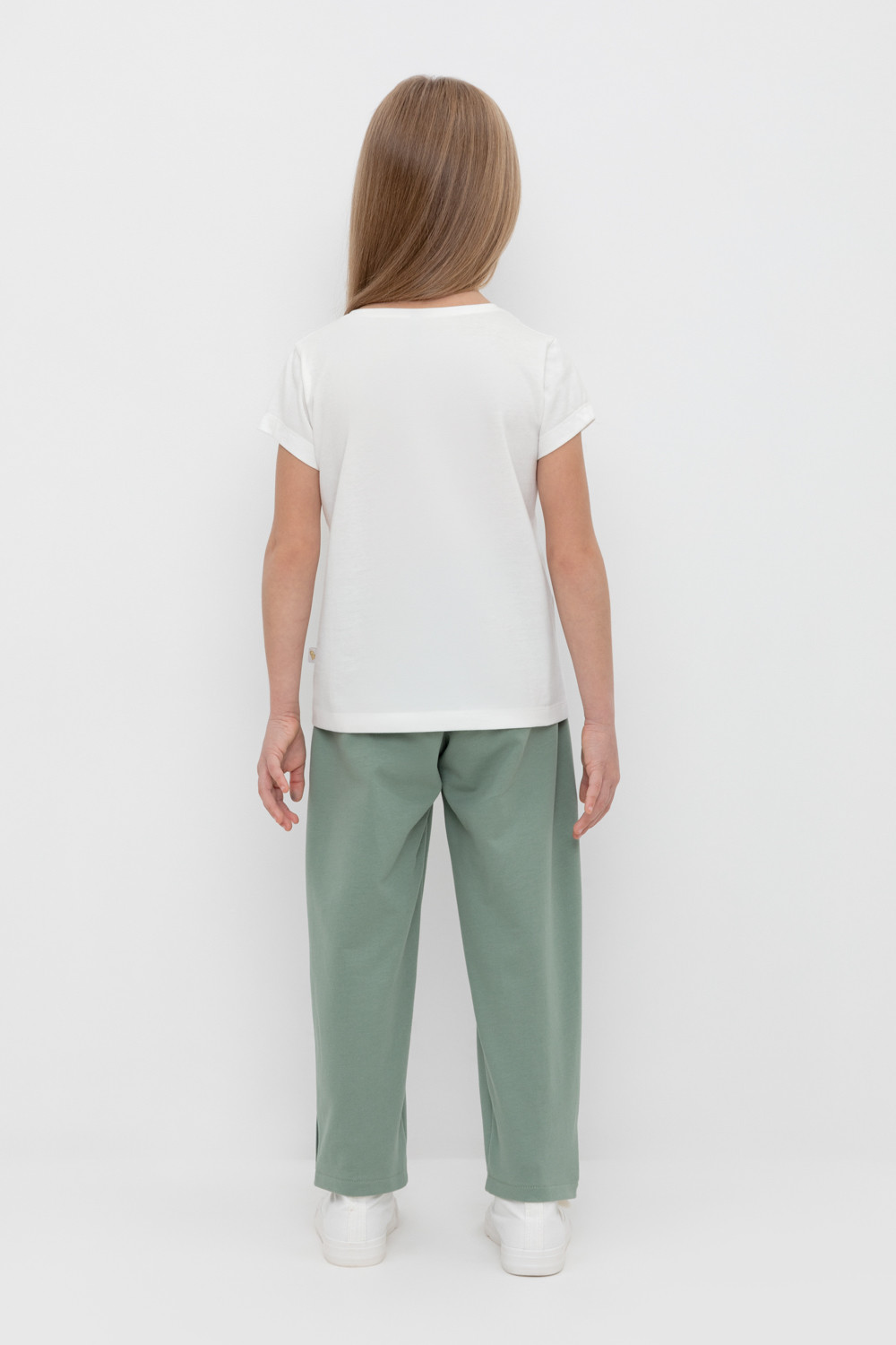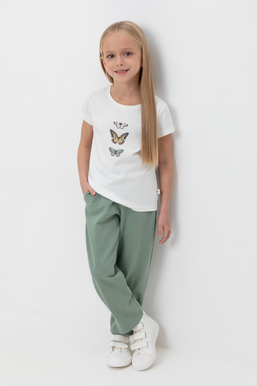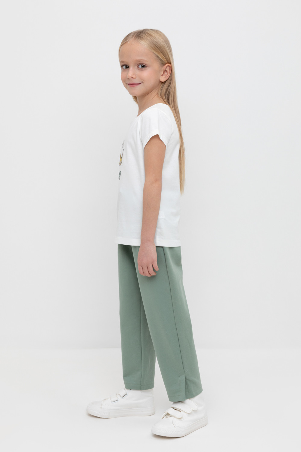 Трикотажные брюки для девочки из петельчатого футера. Эластичный пояс на резинке регулируется по ширине с помощью шнурка, по бокам два удобных кармана.