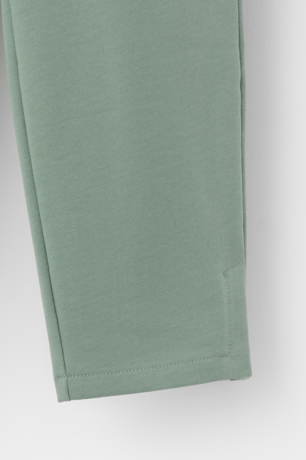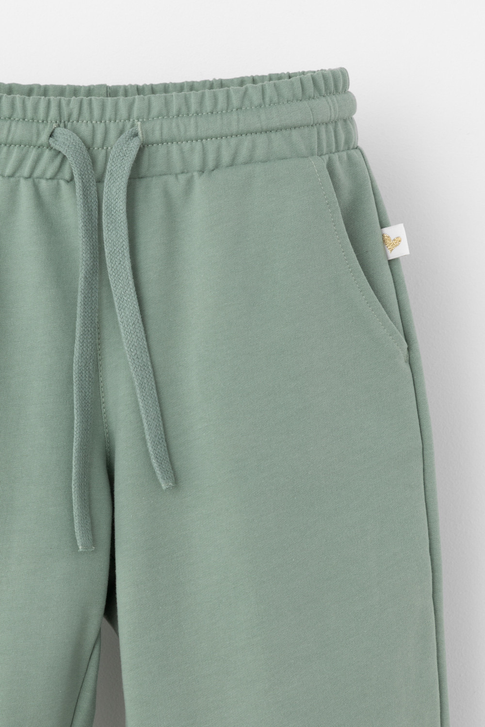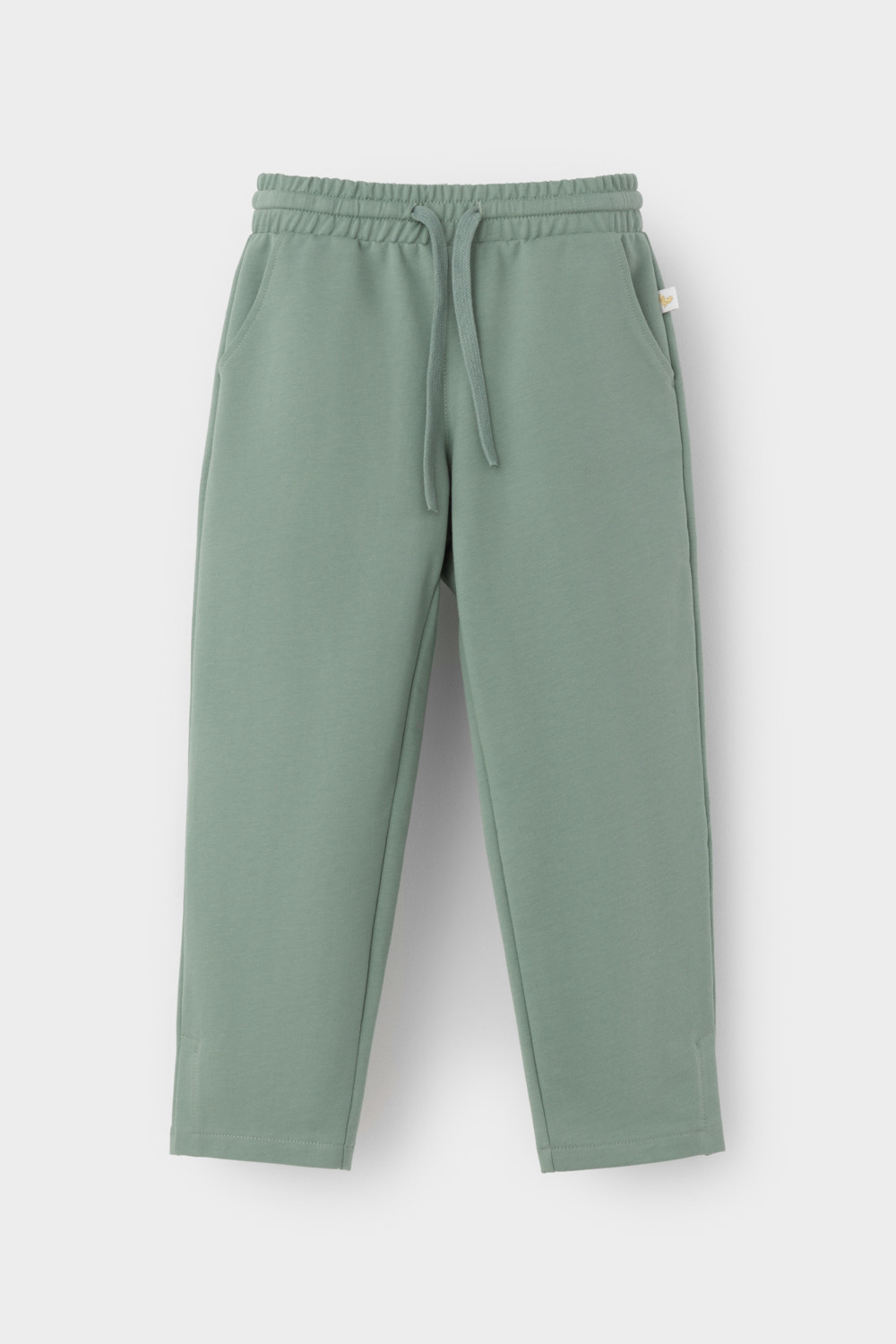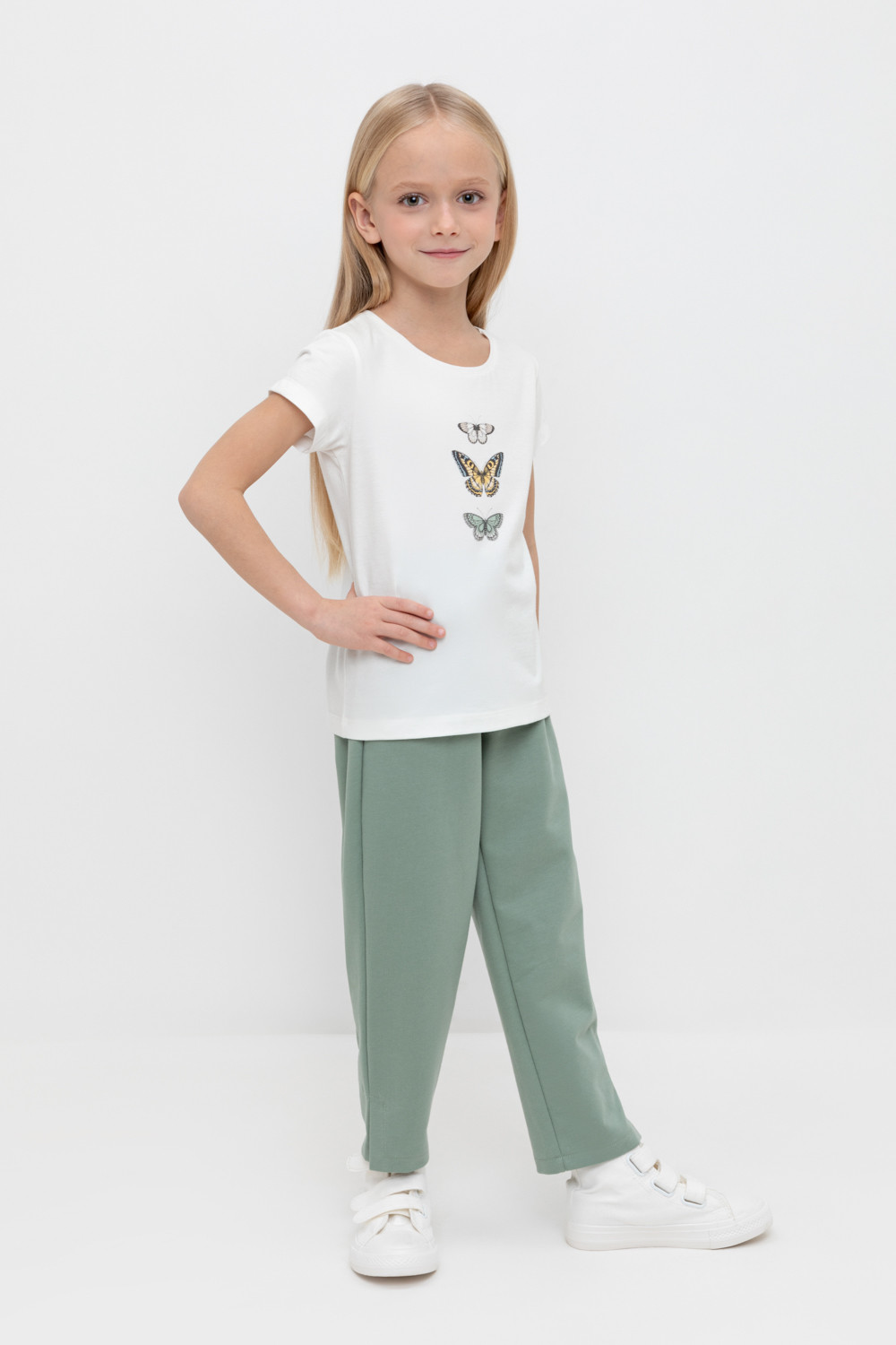 Трикотажные брюки для девочки из петельчатого футера. Эластичный пояс на резинке регулируется по ширине с помощью шнурка, по бокам два удобных кармана.