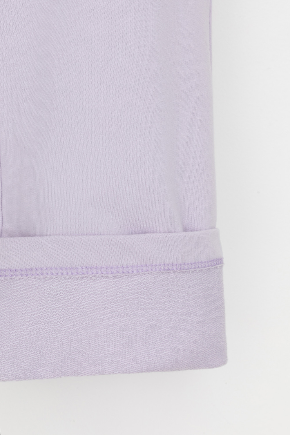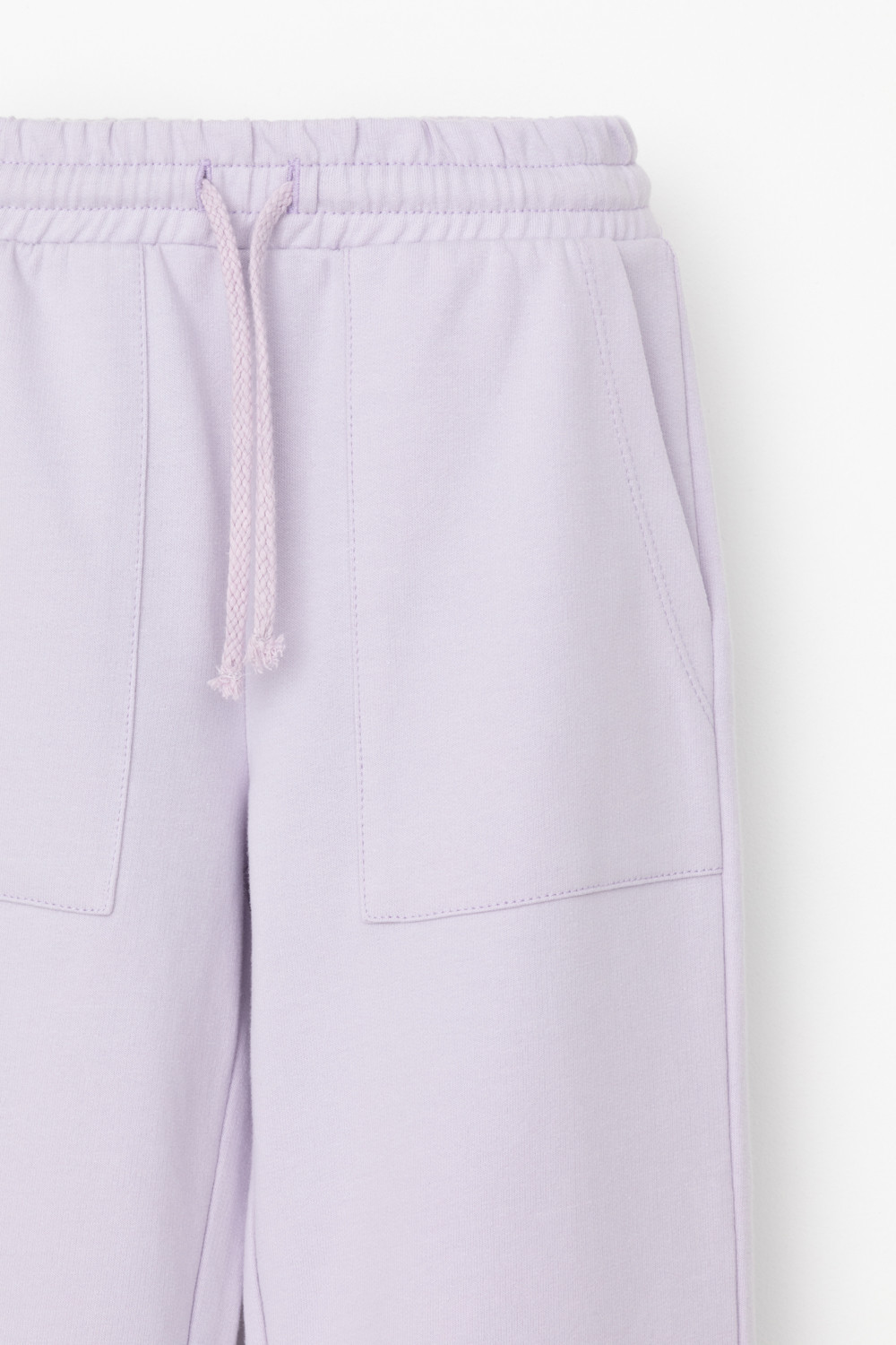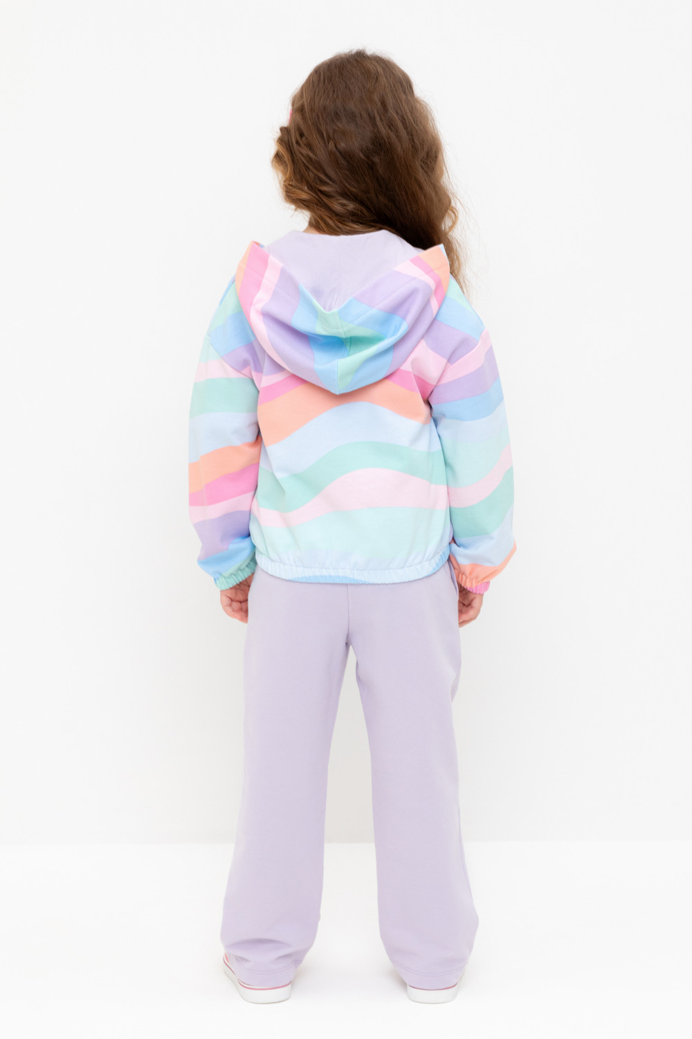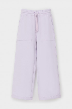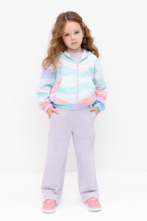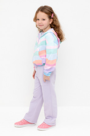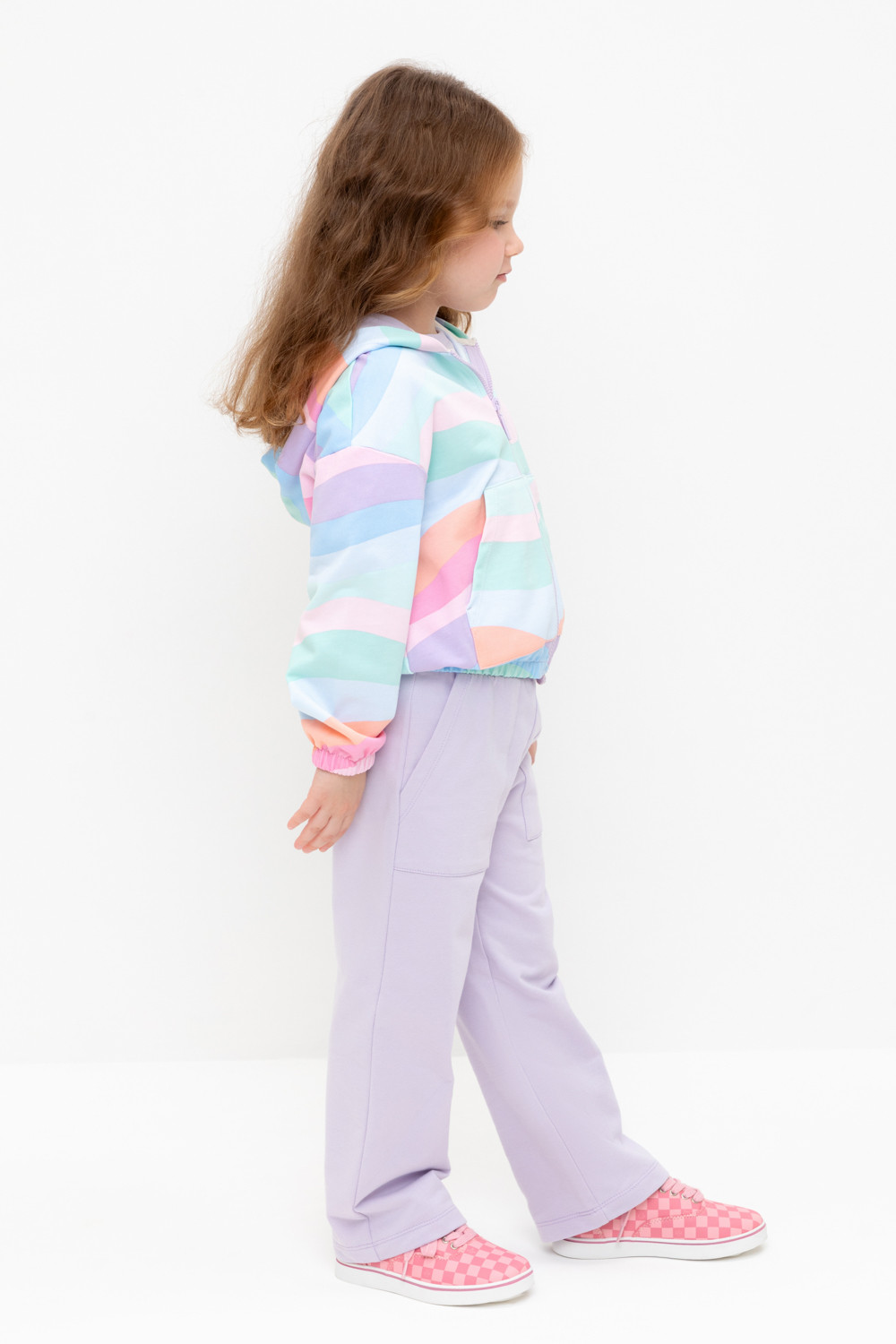 Прямые брюки для девочки из мягкого петельчатого трикотажа. Эластичный пояс на резинке регулируется по ширине с помощью шнурка. По бокам два удобных накладных кармана.