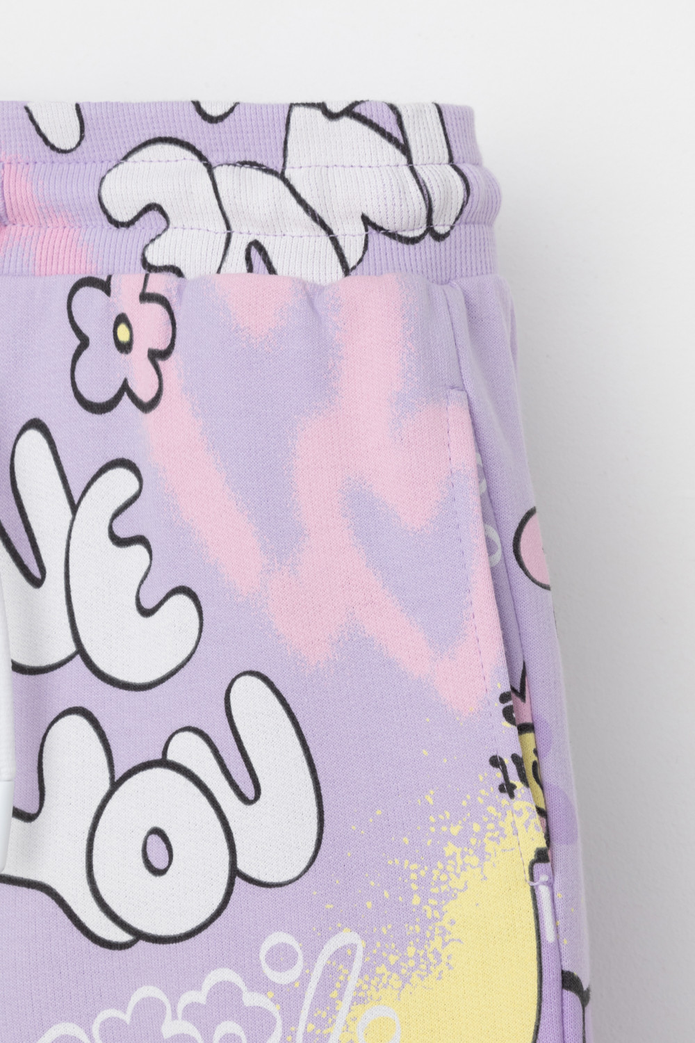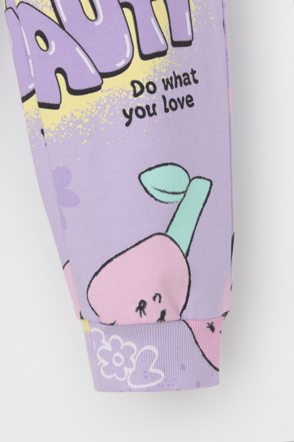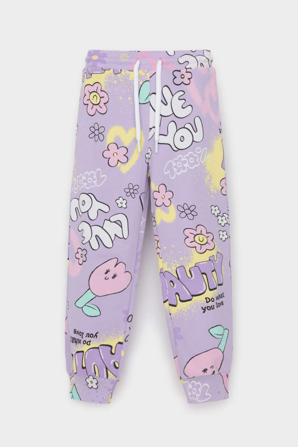 Брюки для девочки из мягкого петельчатого трикотажа. Эластичный пояс на резинке регулируется по ширине с помощью шнурка, по бокам два удобных кармана, внизу эластичные манжеты.