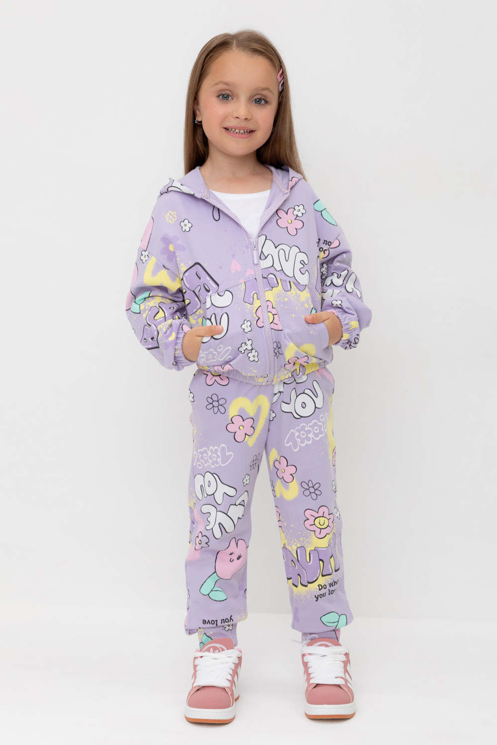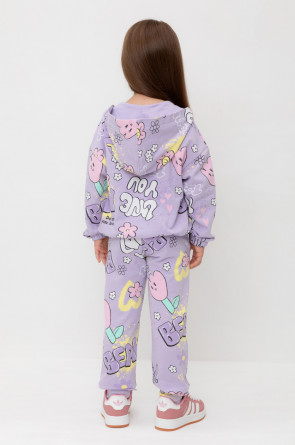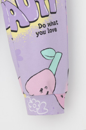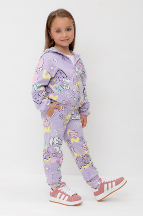Брюки для девочки из мягкого петельчатого трикотажа. Эластичный пояс на резинке регулируется по ширине с помощью шнурка, по бокам два удобных кармана, внизу эластичные манжеты.