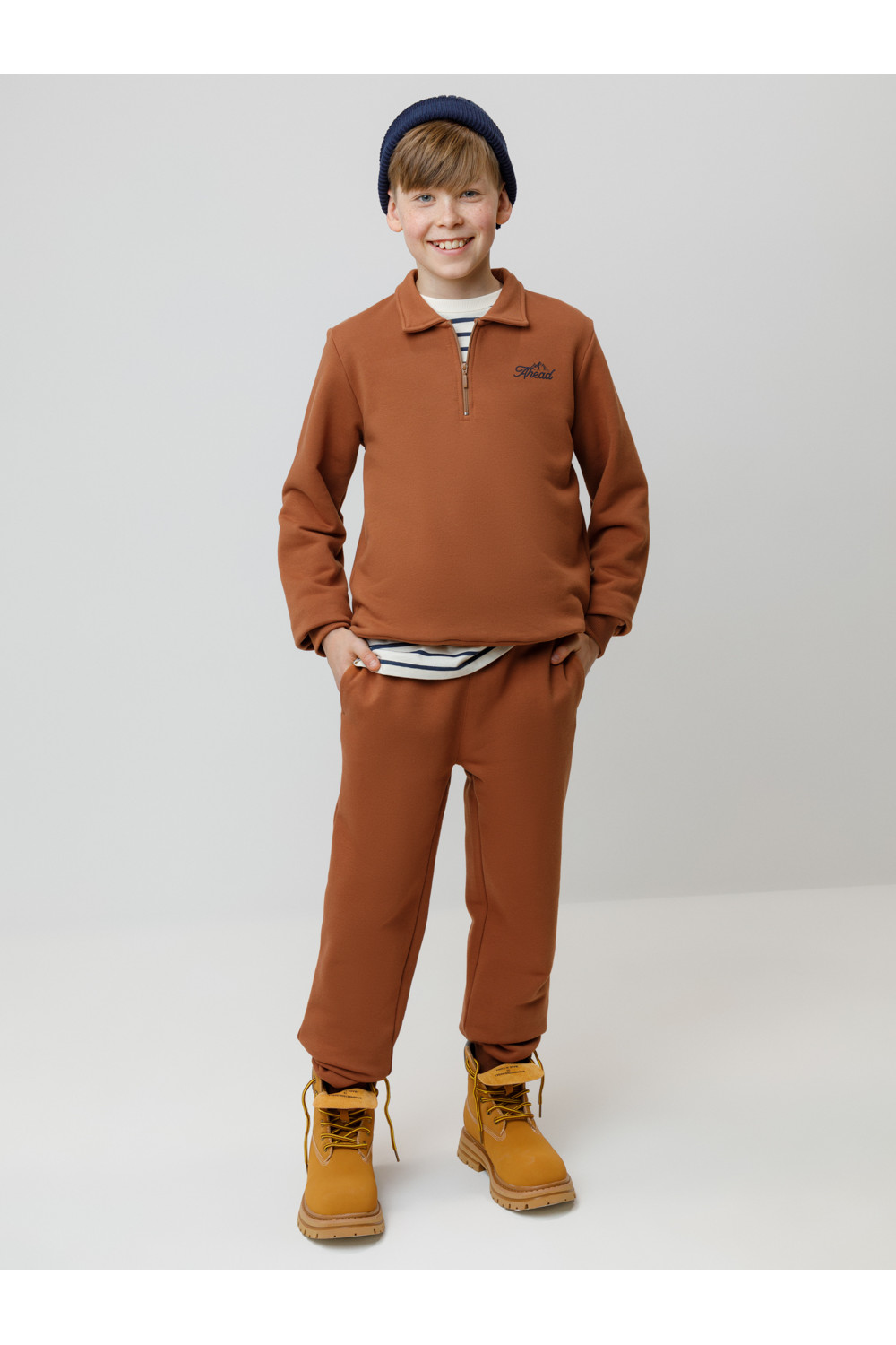 Тёплые брюки для мальчика из мягкого футера с начёсом. Модель с эластичным поясом на резинке регулируется по ширине с помощью шнурка. По бокам два удобных кармана. Низ на манжетах. Изделие сохраняет цвет и форму после многократных стирок. Все трикотажные полотна производятся в соответствии с нормами швейцарского сертификата ЭкоТекс.
