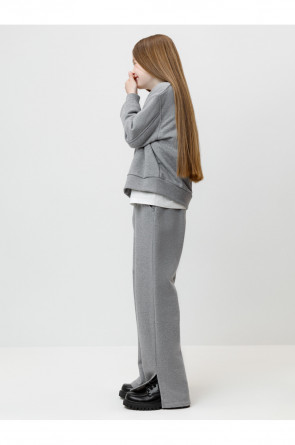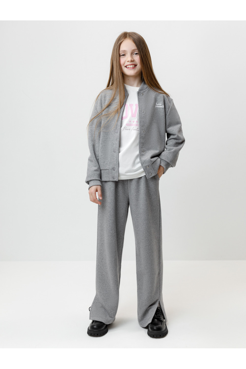 Прямые брюки с разрезами по бокам для девочки из мягкого петельчатого трикотажа. В составе 80% натурального хлопка и 20% полиэстера, при этом полиэстер ввязан внутрь по особой технологии и не соприкасается с кожей. Эластичный пояс на резинке регулируется по ширине с помощью шнурка. По бокам два удобных кармана. Изделие сохраняет цвет и форму после многократных стирок. Все трикотажные полотна производятся в соответствии с нормами швейцарского сертификата ЭкоТекс.
