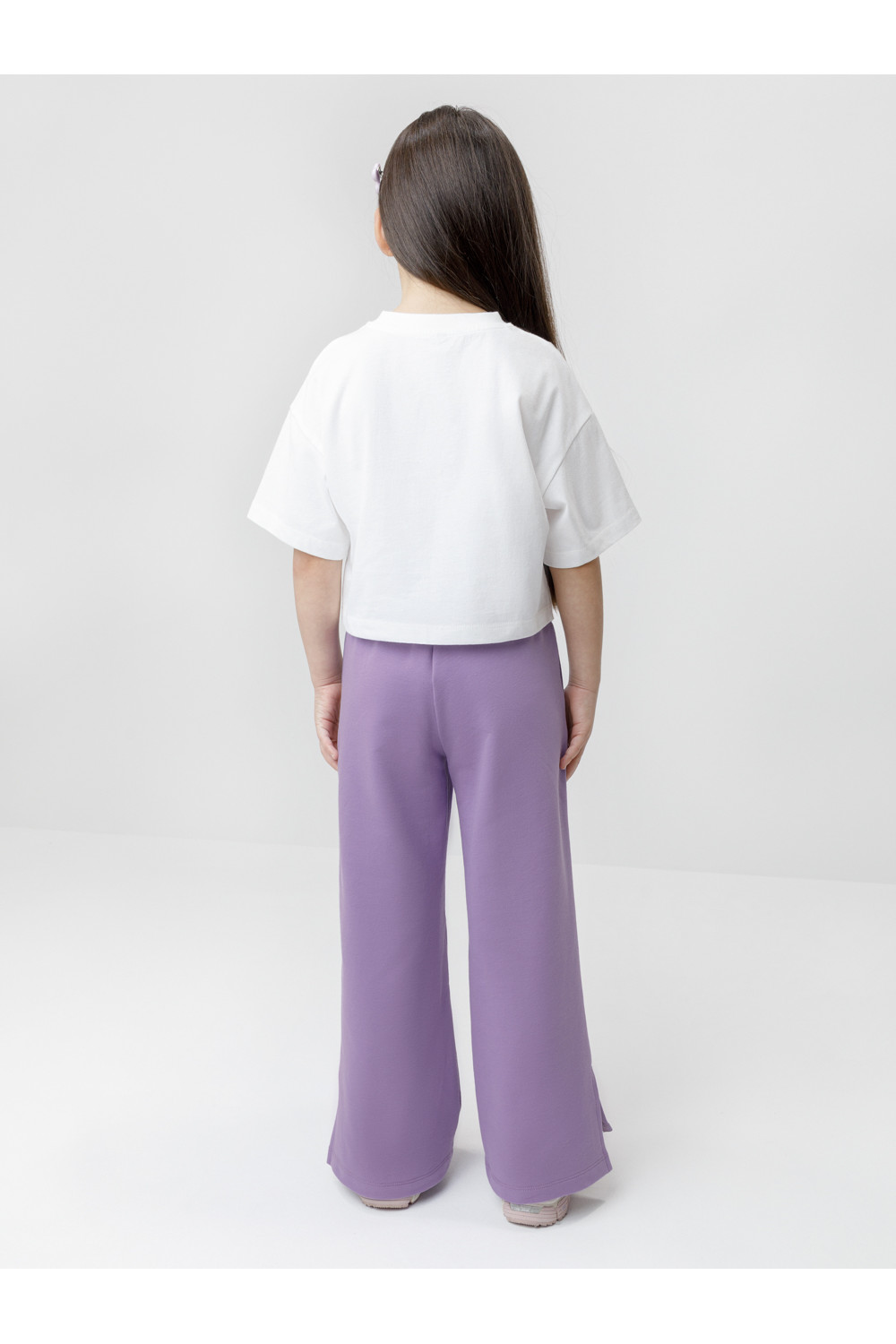 Однотонные брюки со стрелками для девочки. Изготовлены из мягкого петельчатого футера. Модель с эластичным поясом на резинке. Снизу по бокам разрезы. Изделие сохраняет цвет и форму после многократных стирок. Все трикотажные полотна производятся в соответствии с нормами швейцарского сертификата ЭкоТекс.