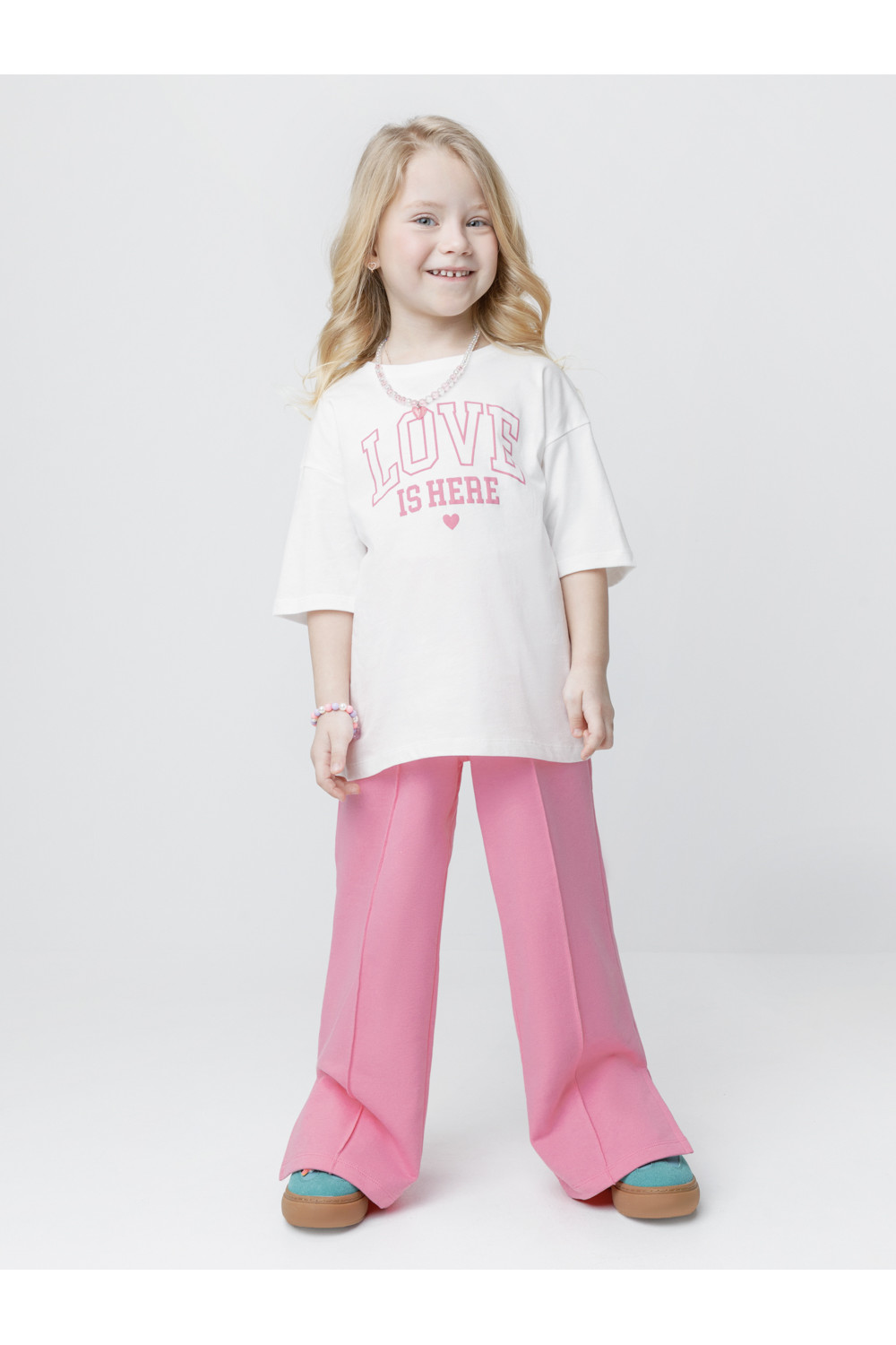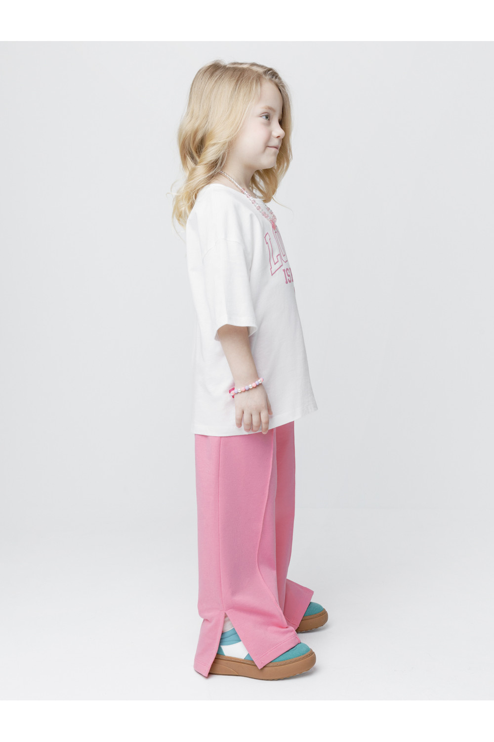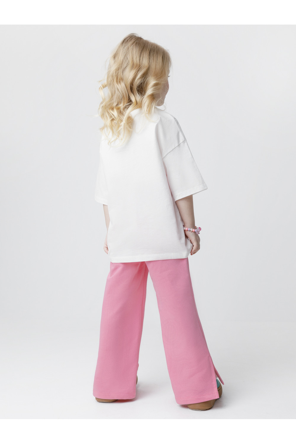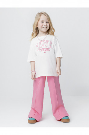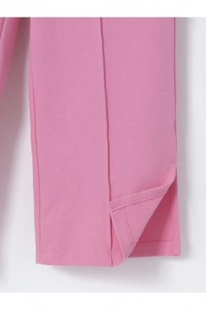 Однотонные брюки со стрелками для девочки. Изготовлены из мягкого трикотажа футера диагональ. Модель с эластичным поясом на резинке. Снизу по бокам разрезы. Изделие сохраняет цвет и форму после многократных стирок. Все трикотажные полотна производятся в соответствии с нормами швейцарского сертификата ЭкоТекс.