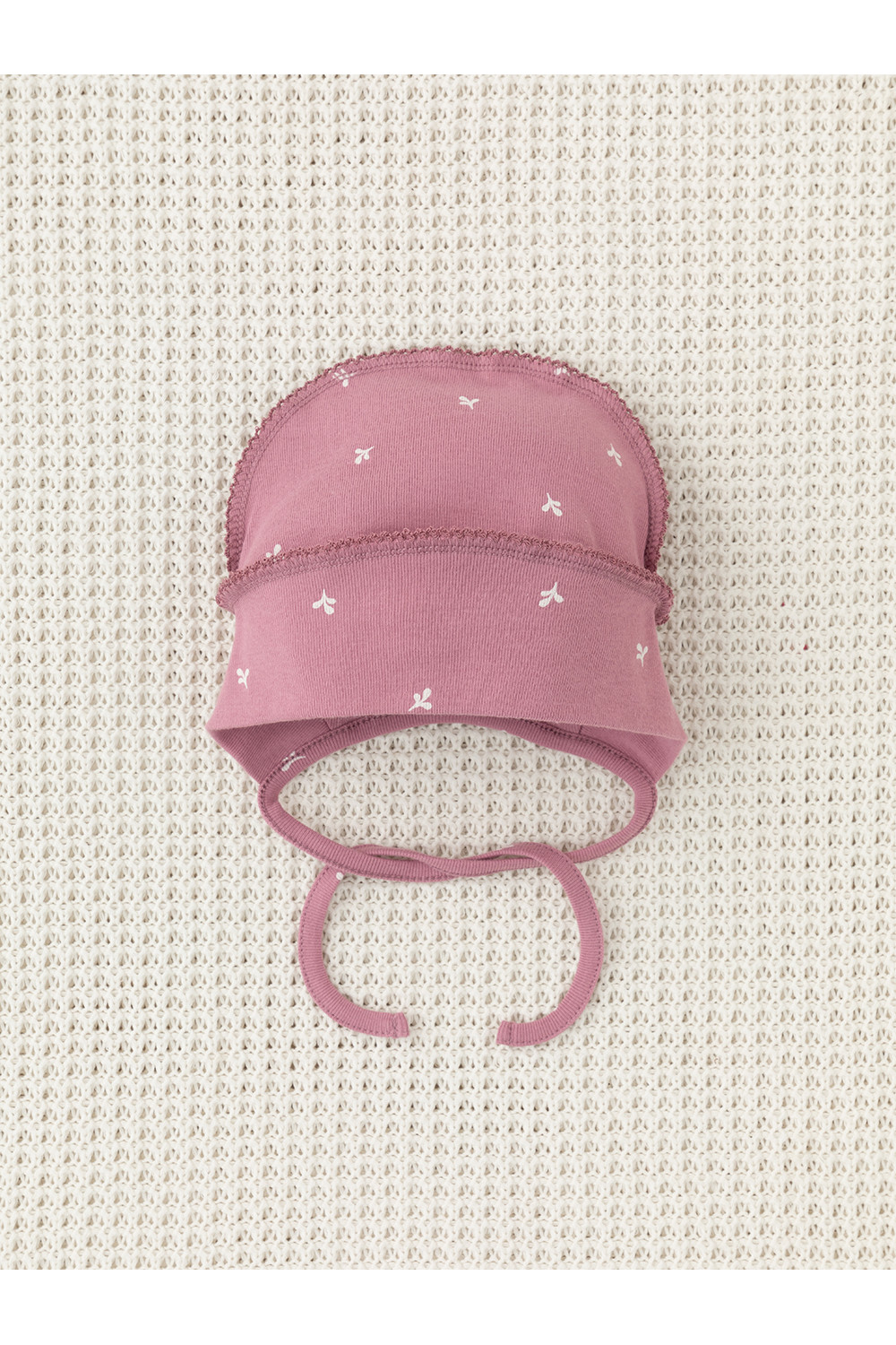 Шапочка на завязках для новорождённых. Изготовлена из мягкого эластичного трикотажа интерлок, произведённого из натурального хлопка. Все трикотажные полотна производятся в соответствии с нормами швейцарского сертификата ЭкоТекс.