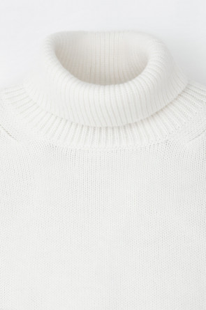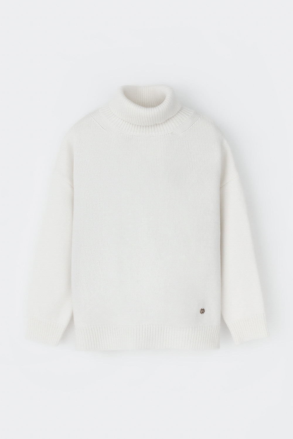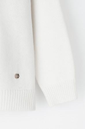 Уютный вязаный джемпер из полушерстяной пряжи. Шерсть в составе сохраняет тепло, а волокна акрила добавляют мягкость и объем. Выполнен гладью. Комфортная длинные цельнокроеные рукава придают изделию объем.