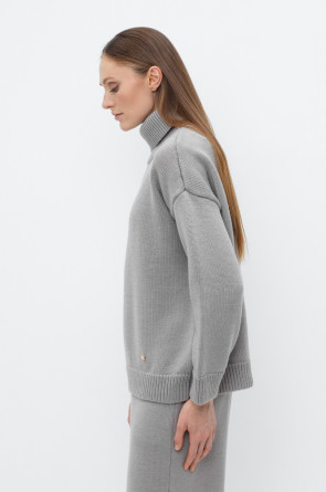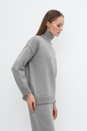 Уютный вязаный джемпер из полушерстяной пряжи. Шерсть в составе сохраняет тепло, а волокна акрила добавляют мягкость и объем. Выполнен гладью. Комфортная длинные цельнокроеные рукава придают изделию объем.