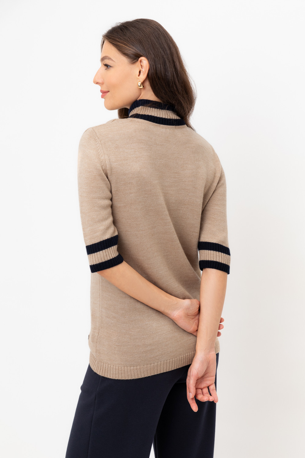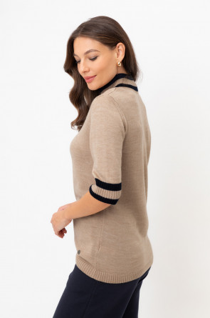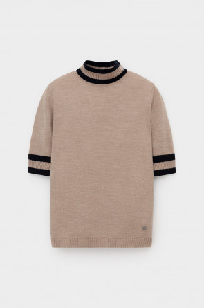 Джемпер в стиле прямой футболки, воротником-стойкой и короткими рукавами. Прямой силуэт, стандартная длина. Средняя плотность вязания, пластичная фактура. Выполнен гладью из мягкой полушерстяной пряжи. Шерсть в составе сохраняет тепло, а благодаря волокнам акрила изделие мягкое и дольше сохраняет форму.