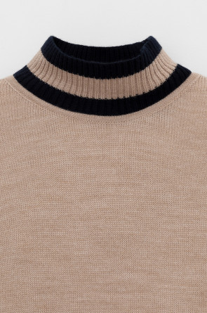 Джемпер в стиле прямой футболки, воротником-стойкой и короткими рукавами. Прямой силуэт, стандартная длина. Средняя плотность вязания, пластичная фактура. Выполнен гладью из мягкой полушерстяной пряжи. Шерсть в составе сохраняет тепло, а благодаря волокнам акрила изделие мягкое и дольше сохраняет форму.