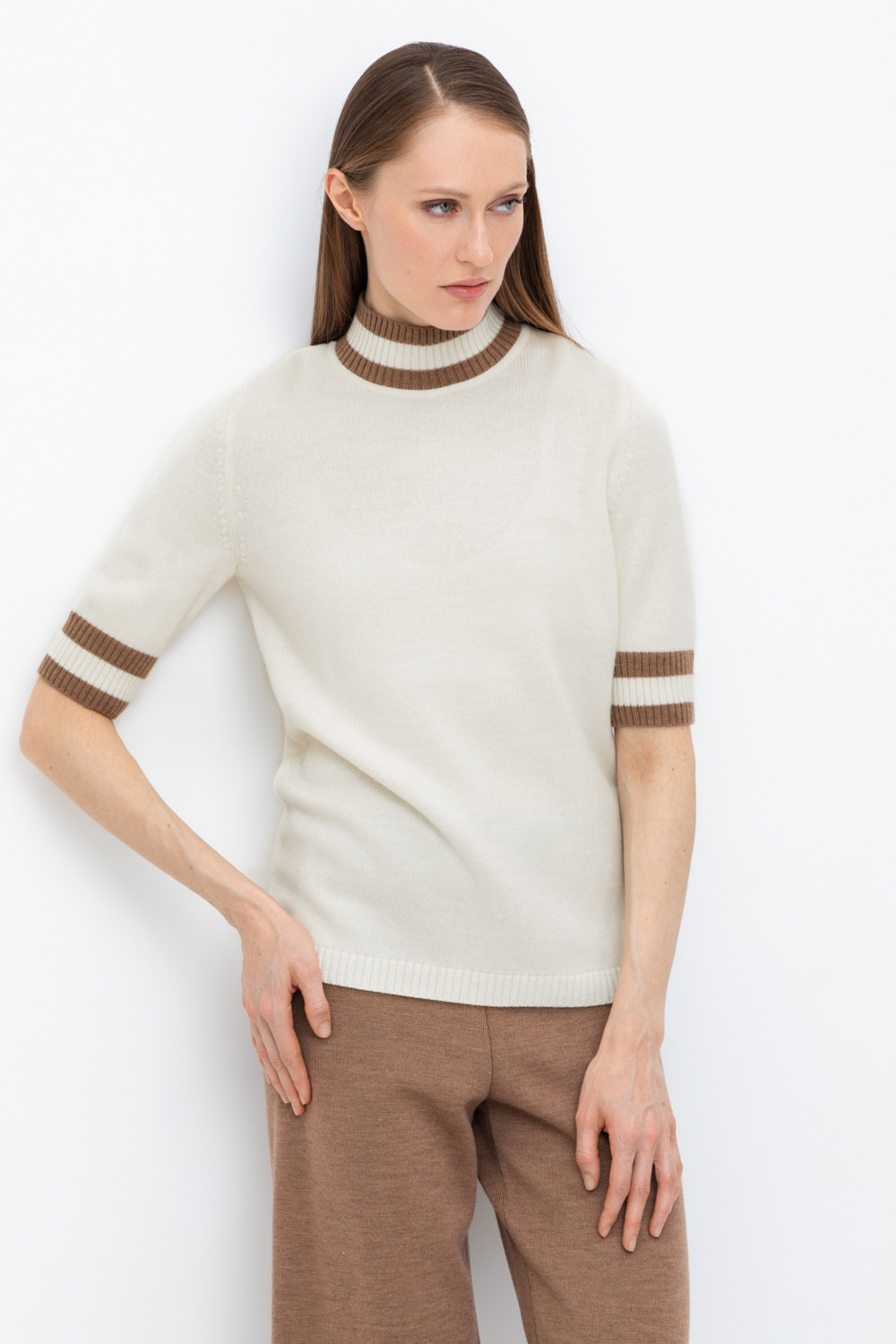 Джемпер в стиле прямой футболки, воротником-стойкой и короткими рукавами. Прямой силуэт, стандартная длина. Средняя плотность вязания, пластичная фактура. Выполнен гладью из мягкой полушерстяной пряжи. Шерсть в составе сохраняет тепло, а благодаря волокнам акрила изделие мягкое и дольше сохраняет форму.
