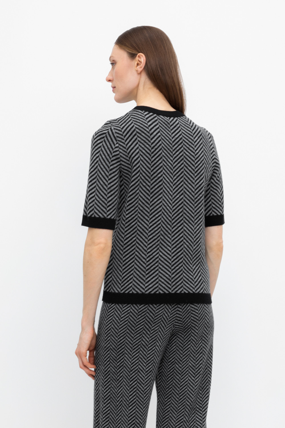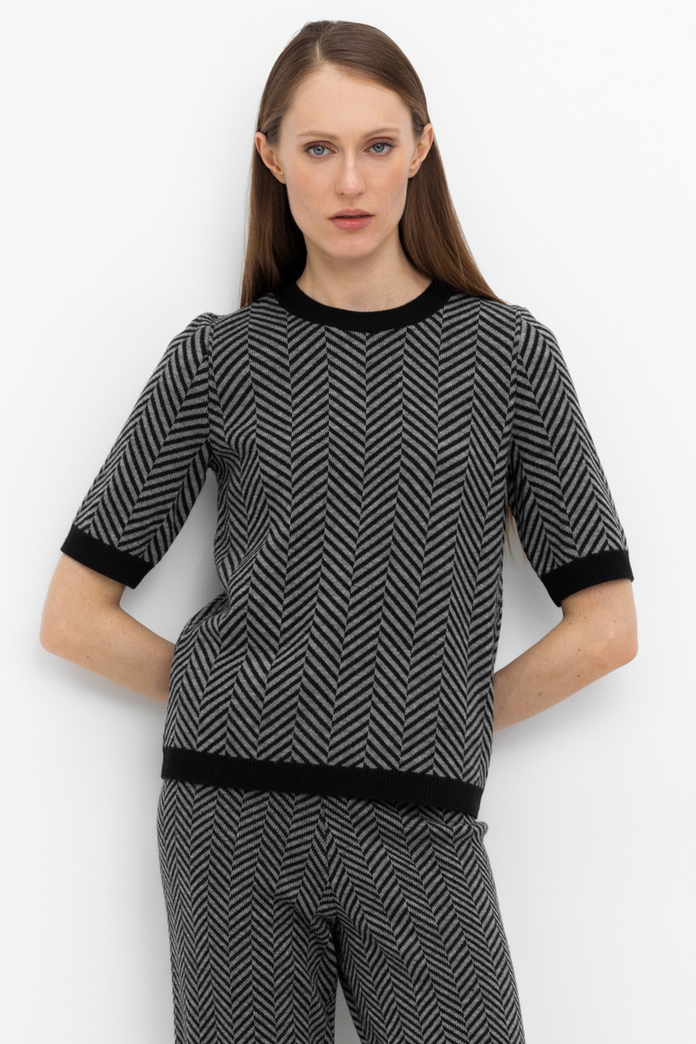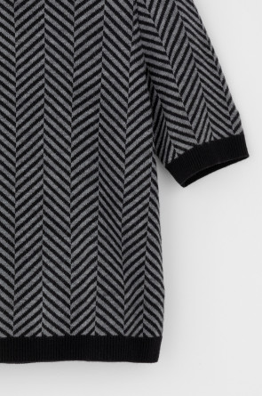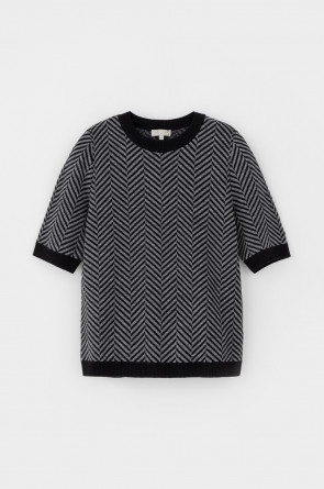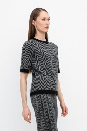 Джемпер в стиле прямой футболки с короткими рукавами. Прямой силуэт, стандартная длина. Выполнен жаккардом из мягкой полушерстяной пряжи. Шерсть в составе сохраняет тепло, а благодаря волокнам акрила изделие мягкое и дольше сохраняет форму.