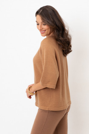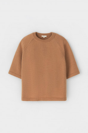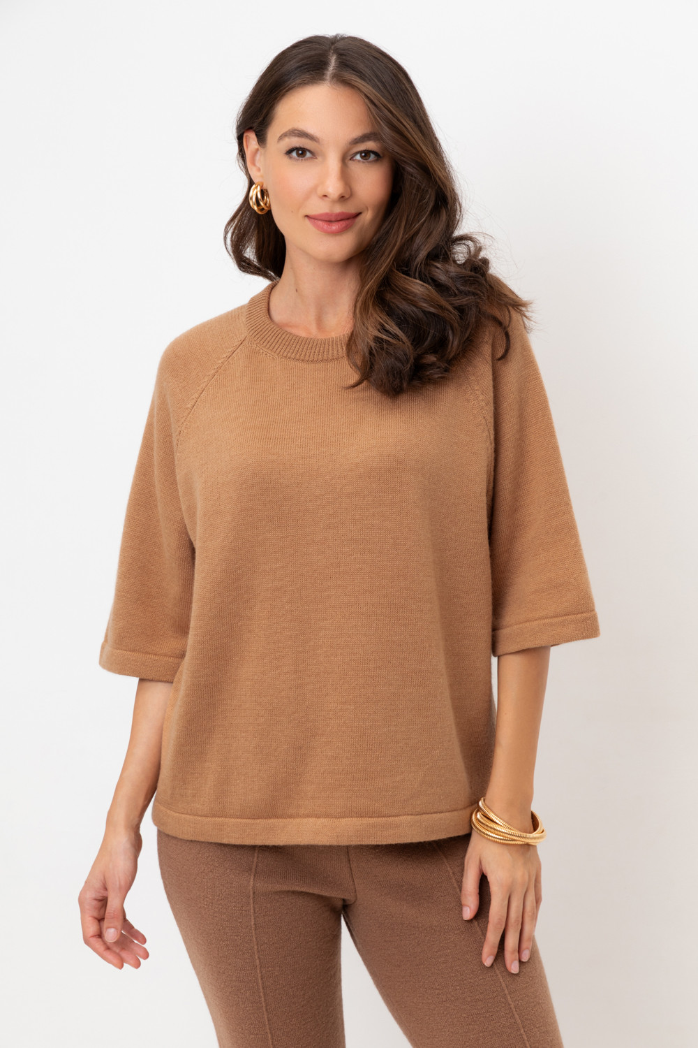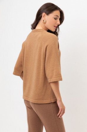 Джемпер в стиле прямой футболки стандартной длины с короткими рукавами-реглан. Выполнен гладью. Средняя плотность вязания и пластичная фактура сохраняют форму изделия.