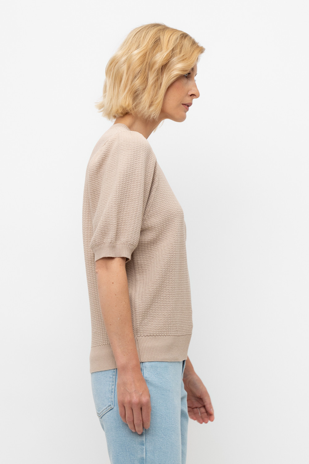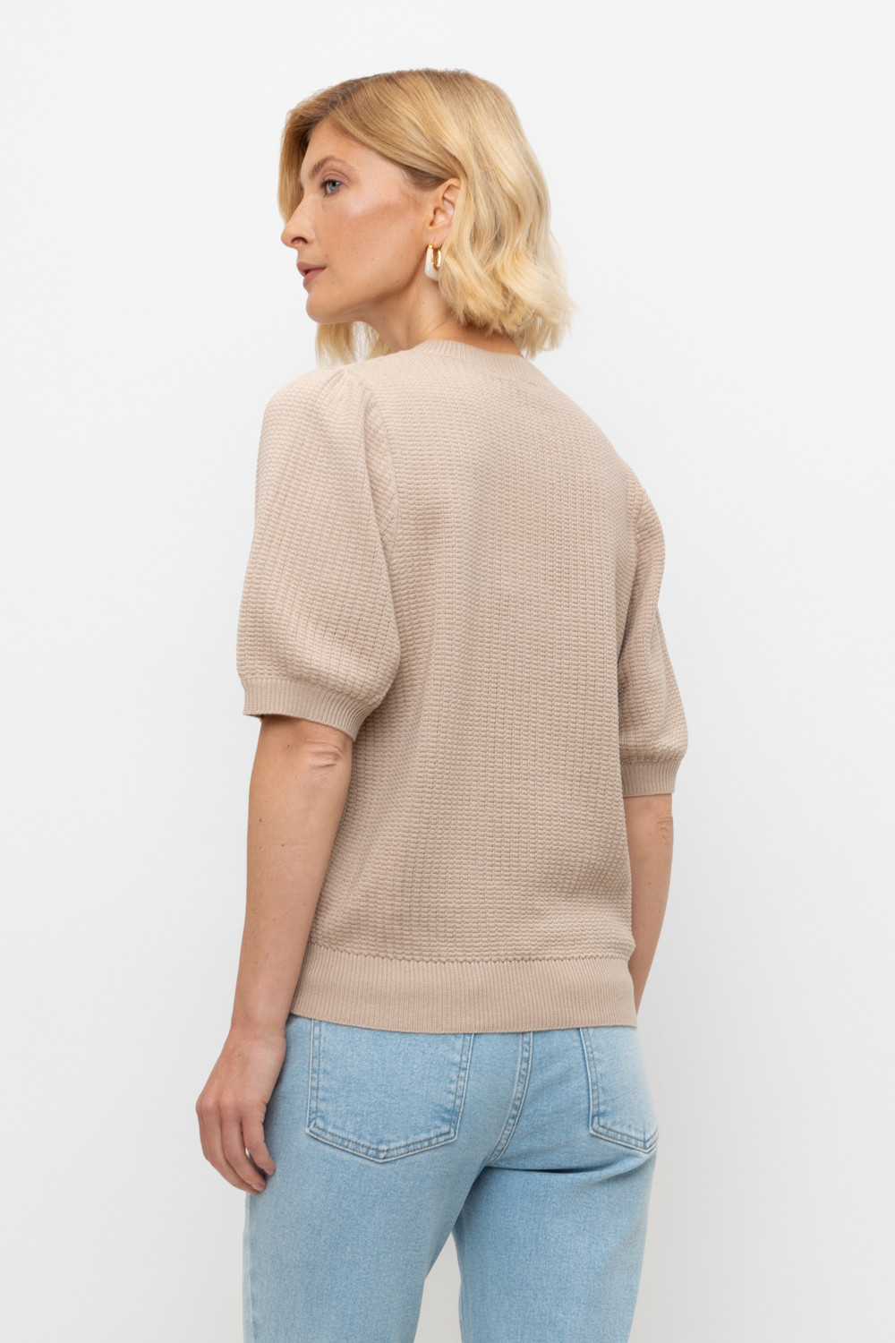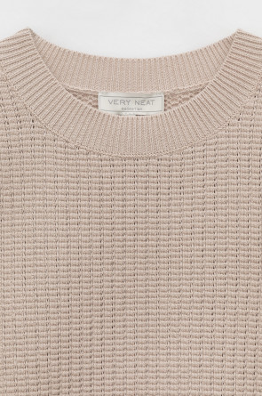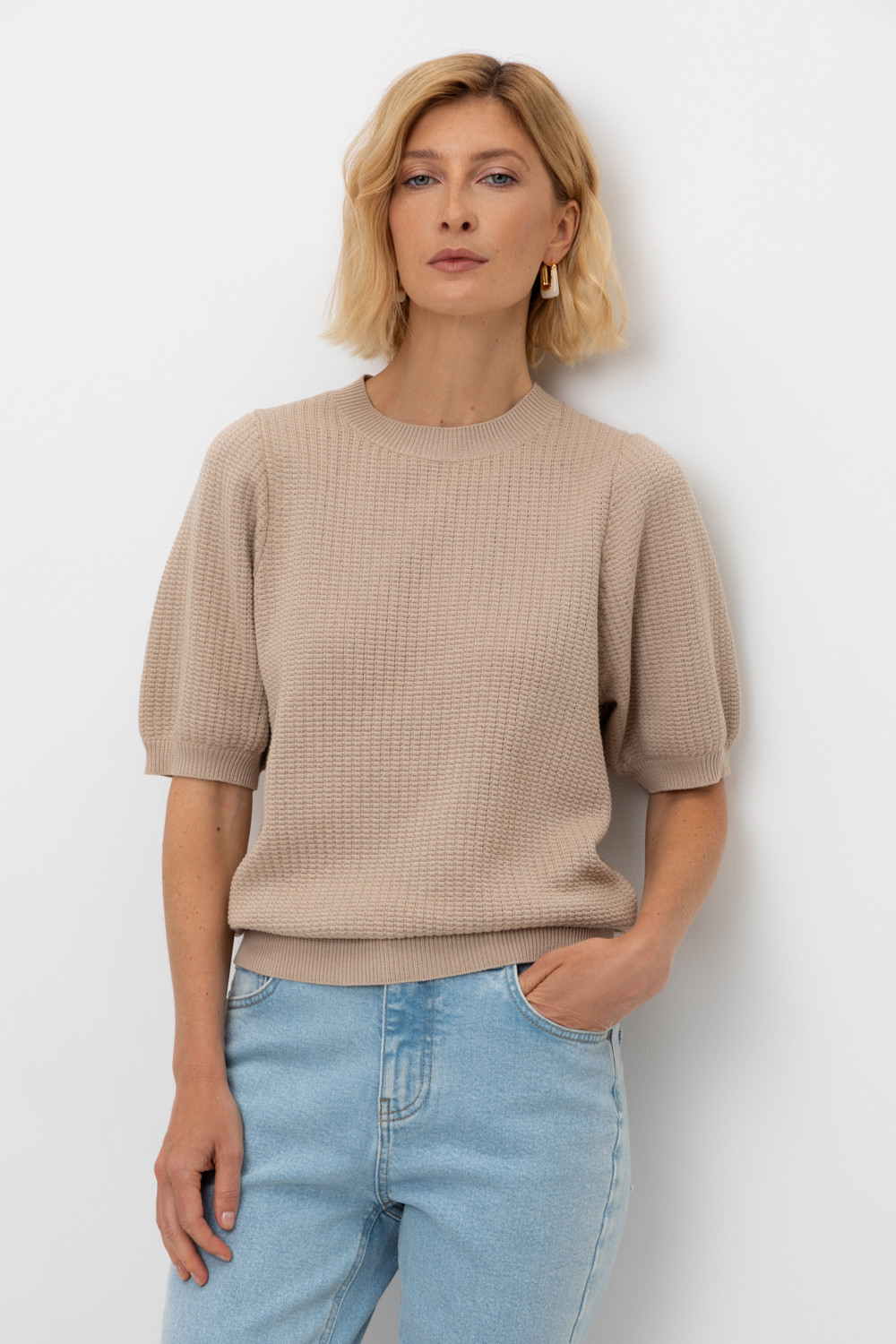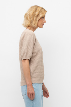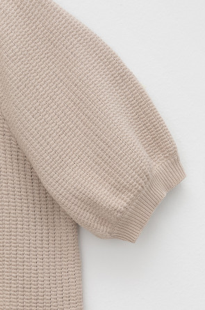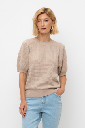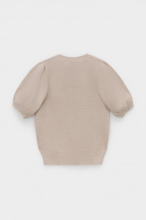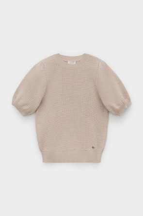 Вязаный ажурный джемпер с короткими рукавами-буф. Манжеты и пояс, связаные ластиком придают изделию небольшой объем. Состав 50% хлопок, 50% акрил. Благодаря акрилу в составе изделие не пилингуется.