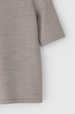 Джемпер в стиле прямой футболки, воротником-стойкой и короткими рукавами. Прямой силуэт, стандартная длина. Средняя плотность вязания, пластичная фактура. Выполнен гладью из мягкой полушерстяной пряжи. Шерсть в составе сохраняет тепло, а благодаря волокнам акрила изделие мягкое и дольше сохраняет форму.