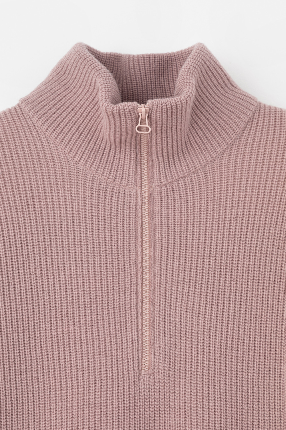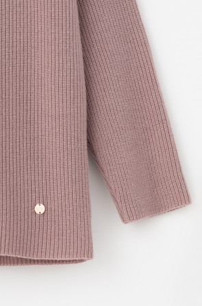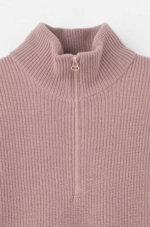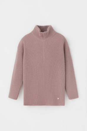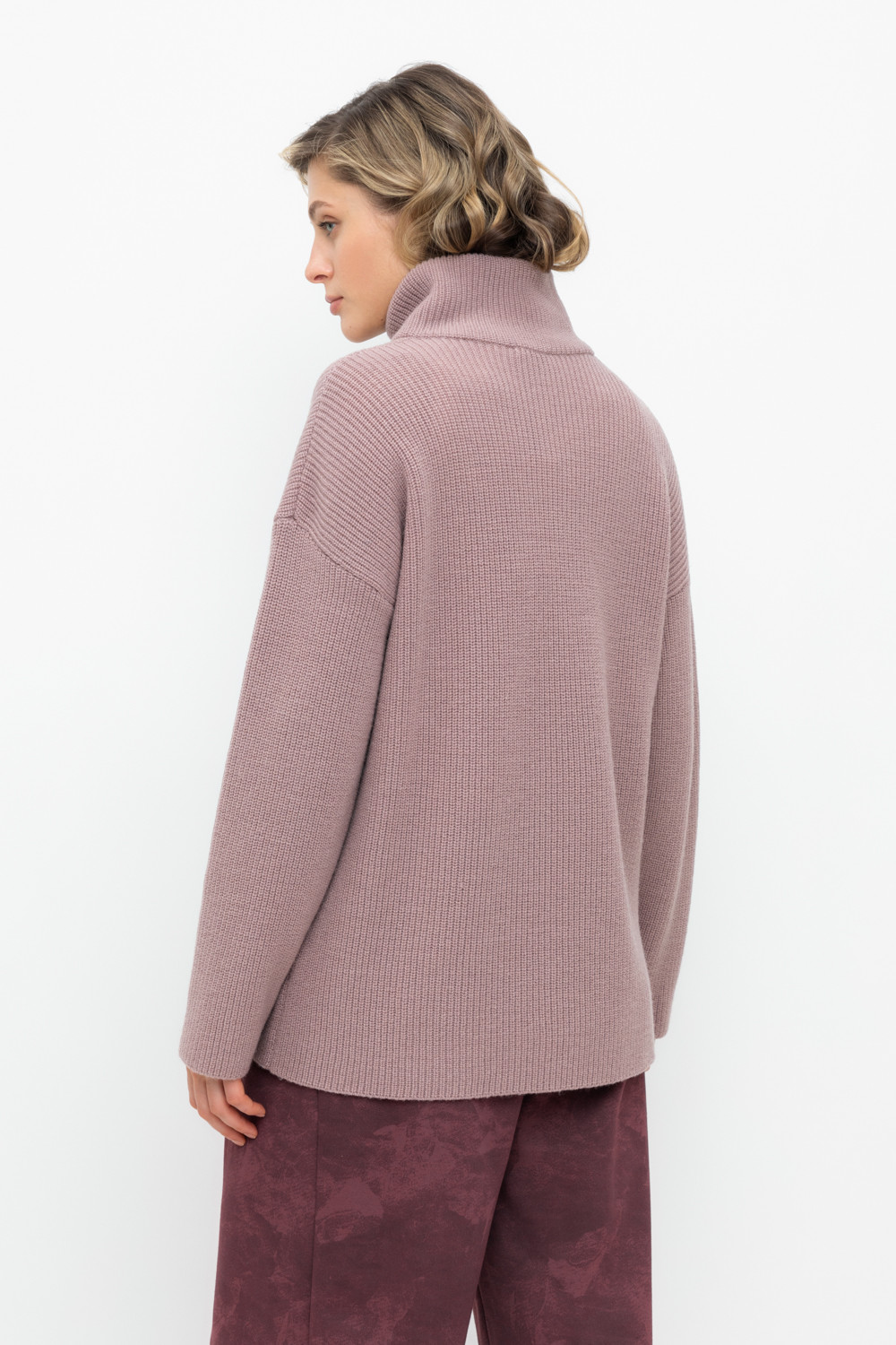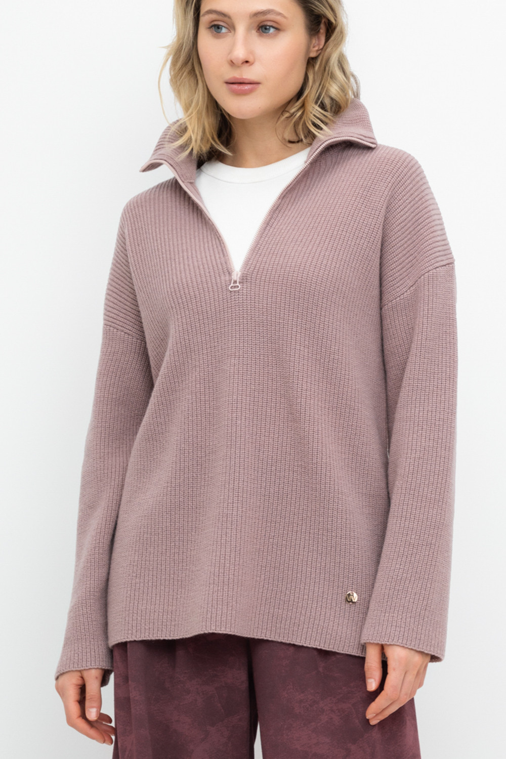 Уютный джемпер в стиле оверсайз со спущенным плечом и объемными рукавами из полушерстяной пряжи. Воротник-стойка застёгивается на молнию.